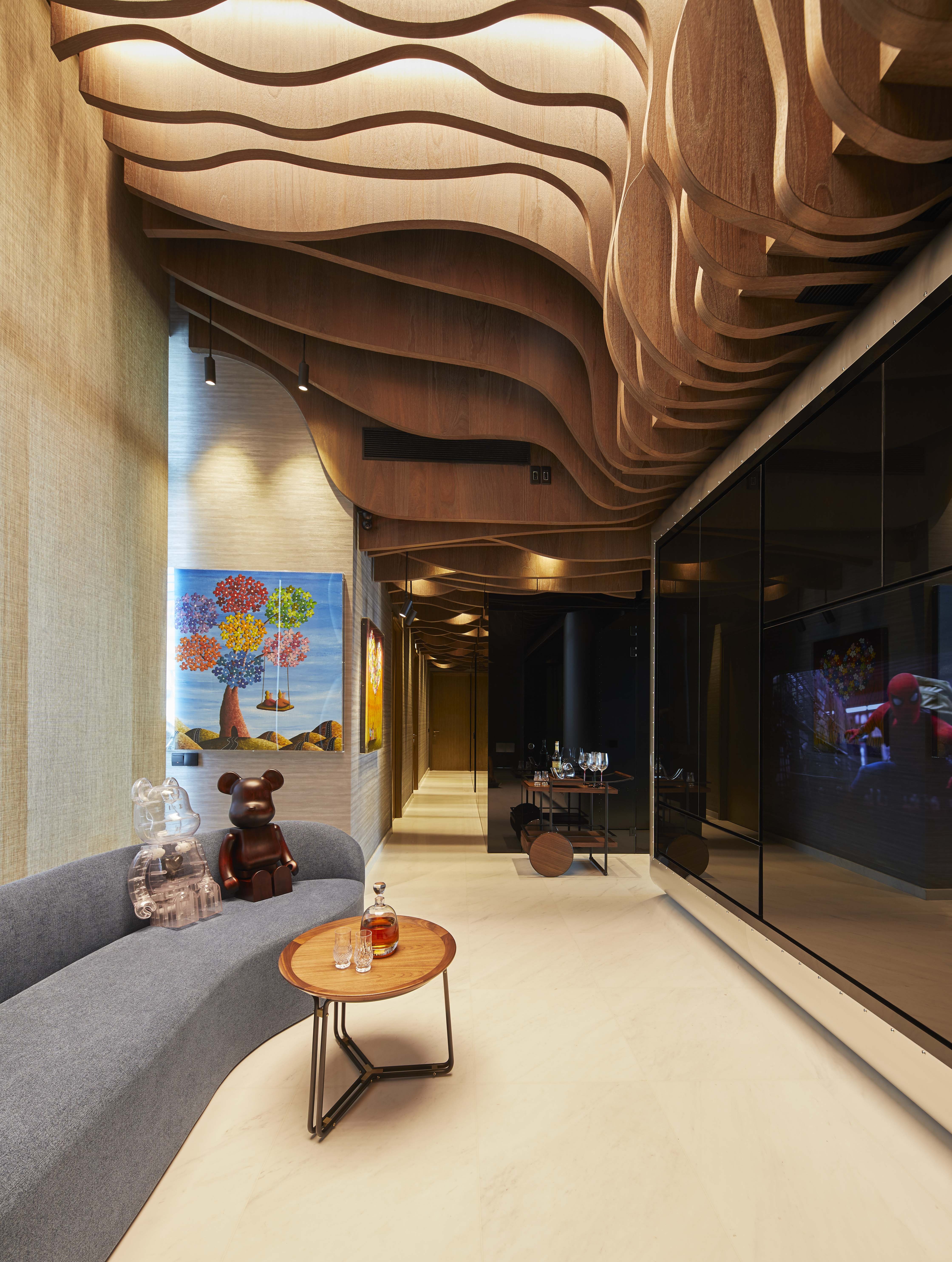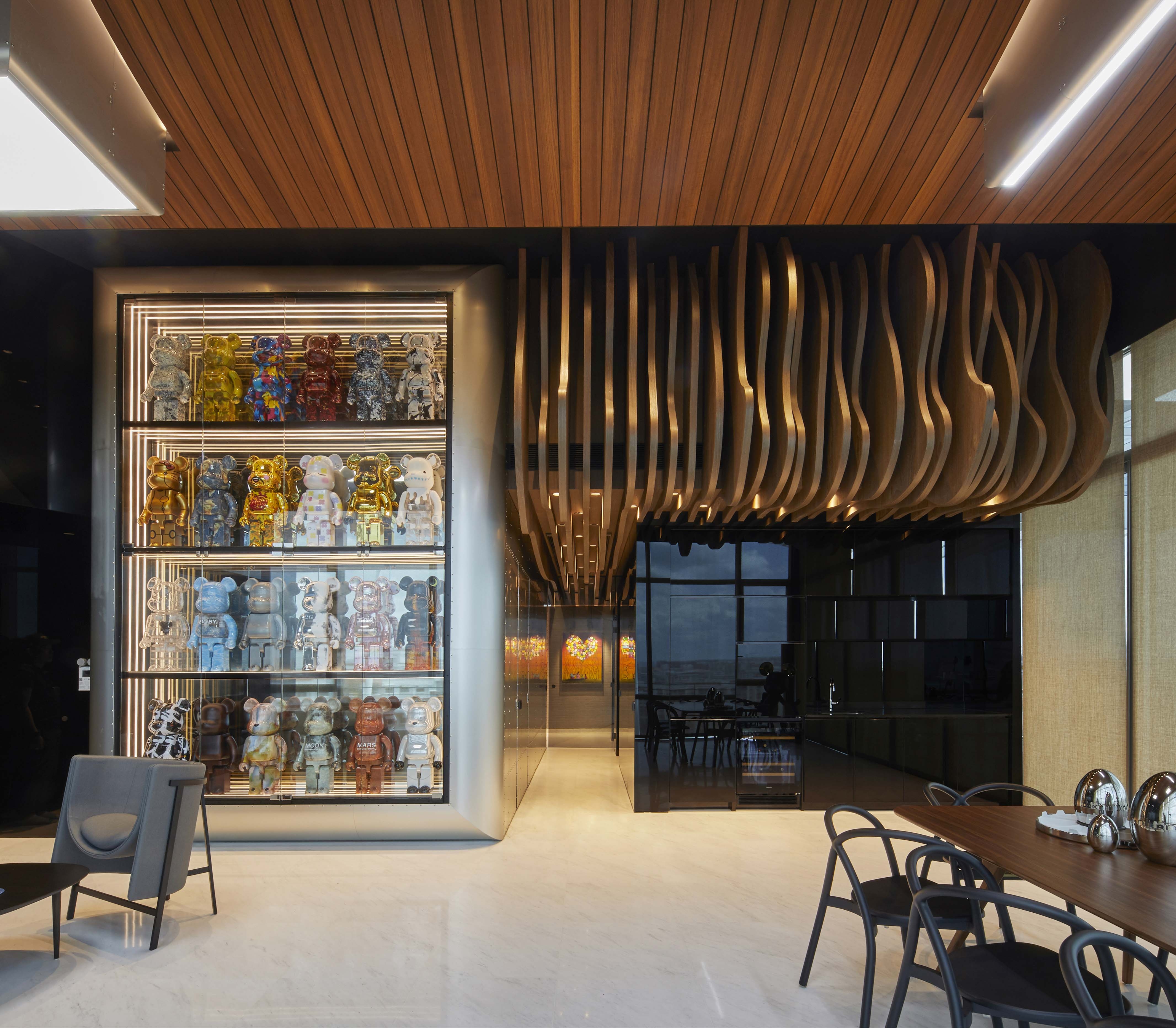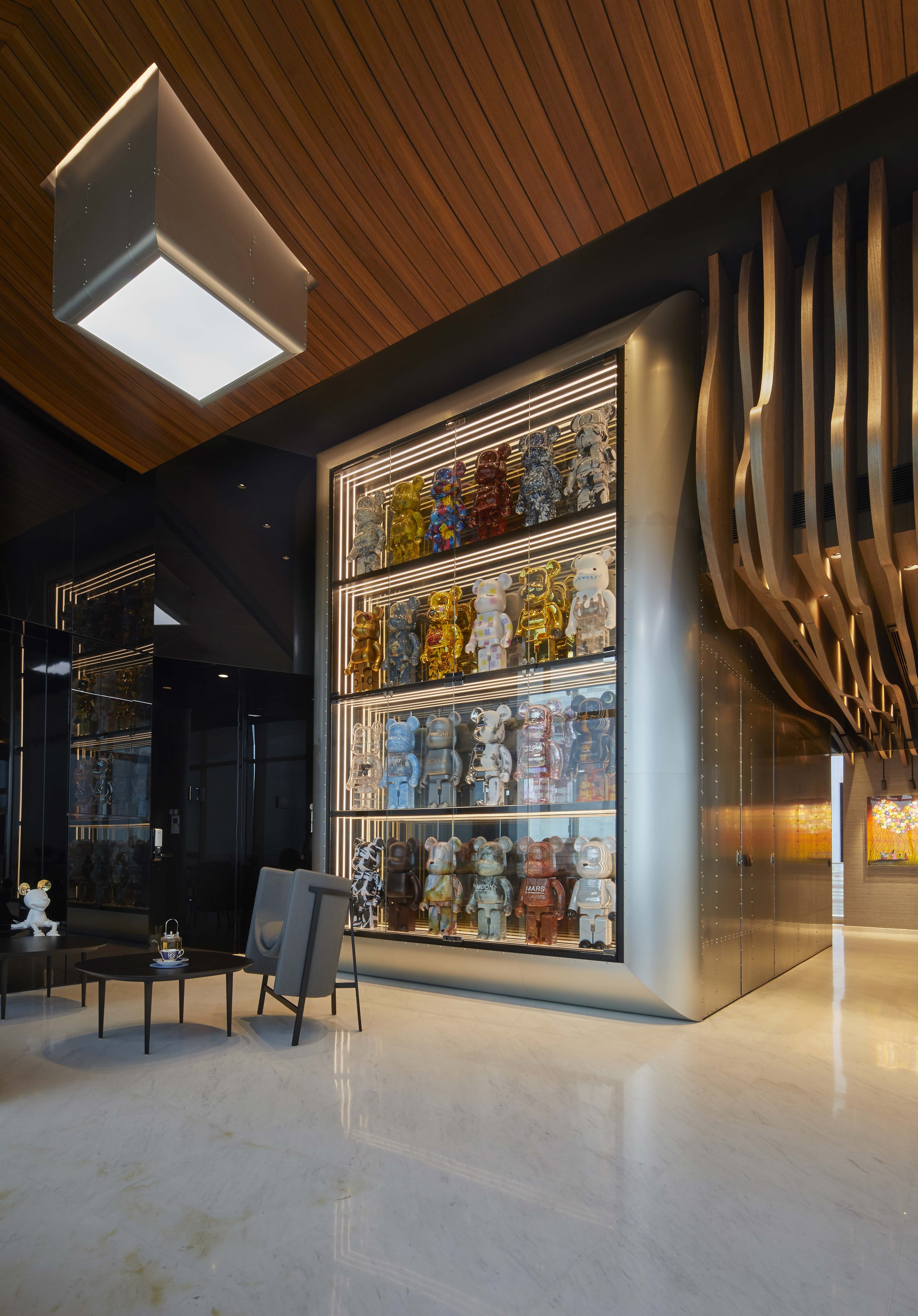 Exploiting the high ceiling of the penthouse and using the methodology of “Injecting Architecture”, the irregularly-shaped floor plan is being carved in such a way that the entire space is seemingly defined by the few families of volumetric forms that were “injected”. The aluminium-clad “spaceship” bearbrick display cabinet which volume visually extend to the other side of the home, encasing the TV wall cabinet system at the Family area. Part of this “family” are the 3 “light wells” light boxes which “protrude” into the living space through the curved ceiling.