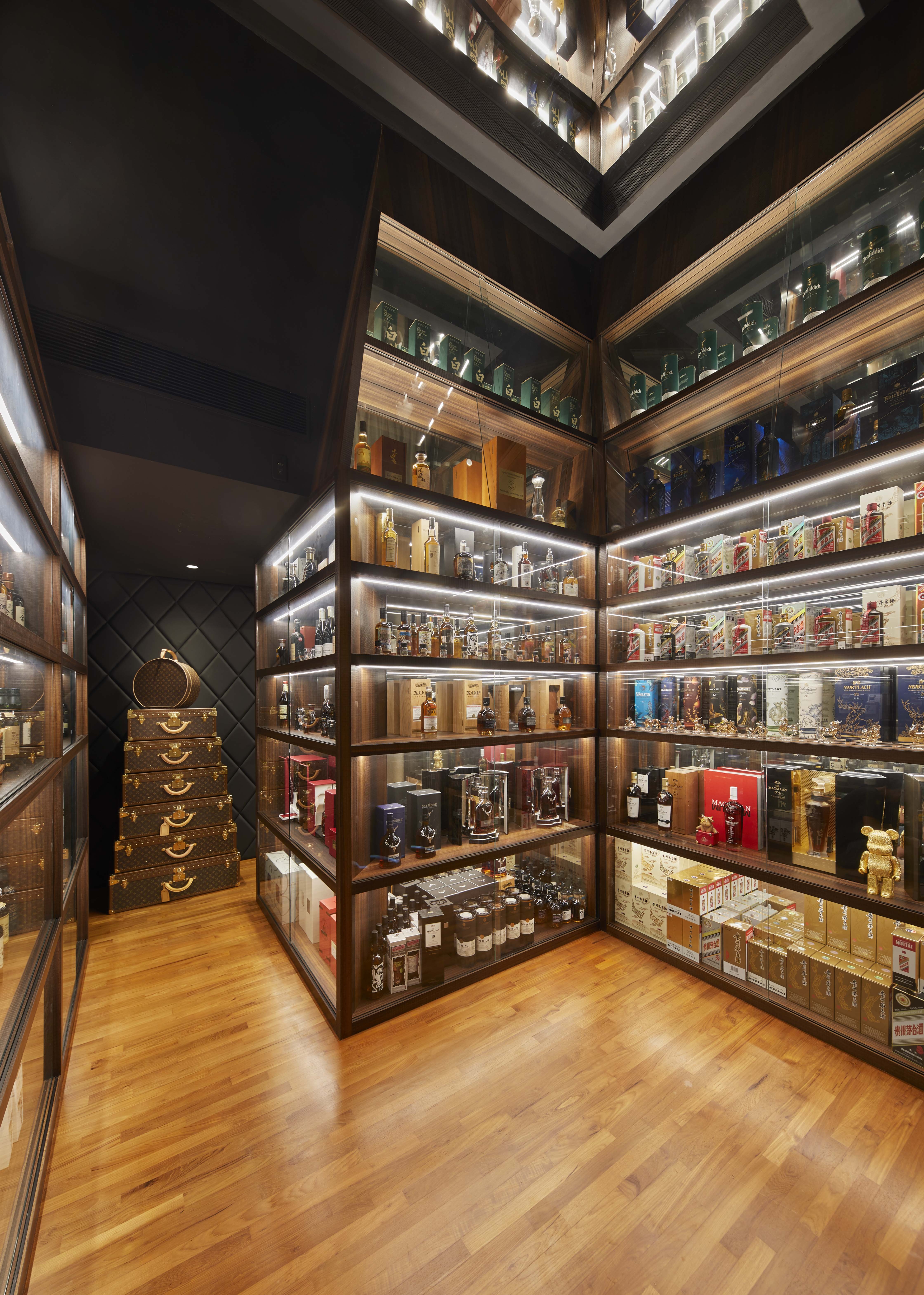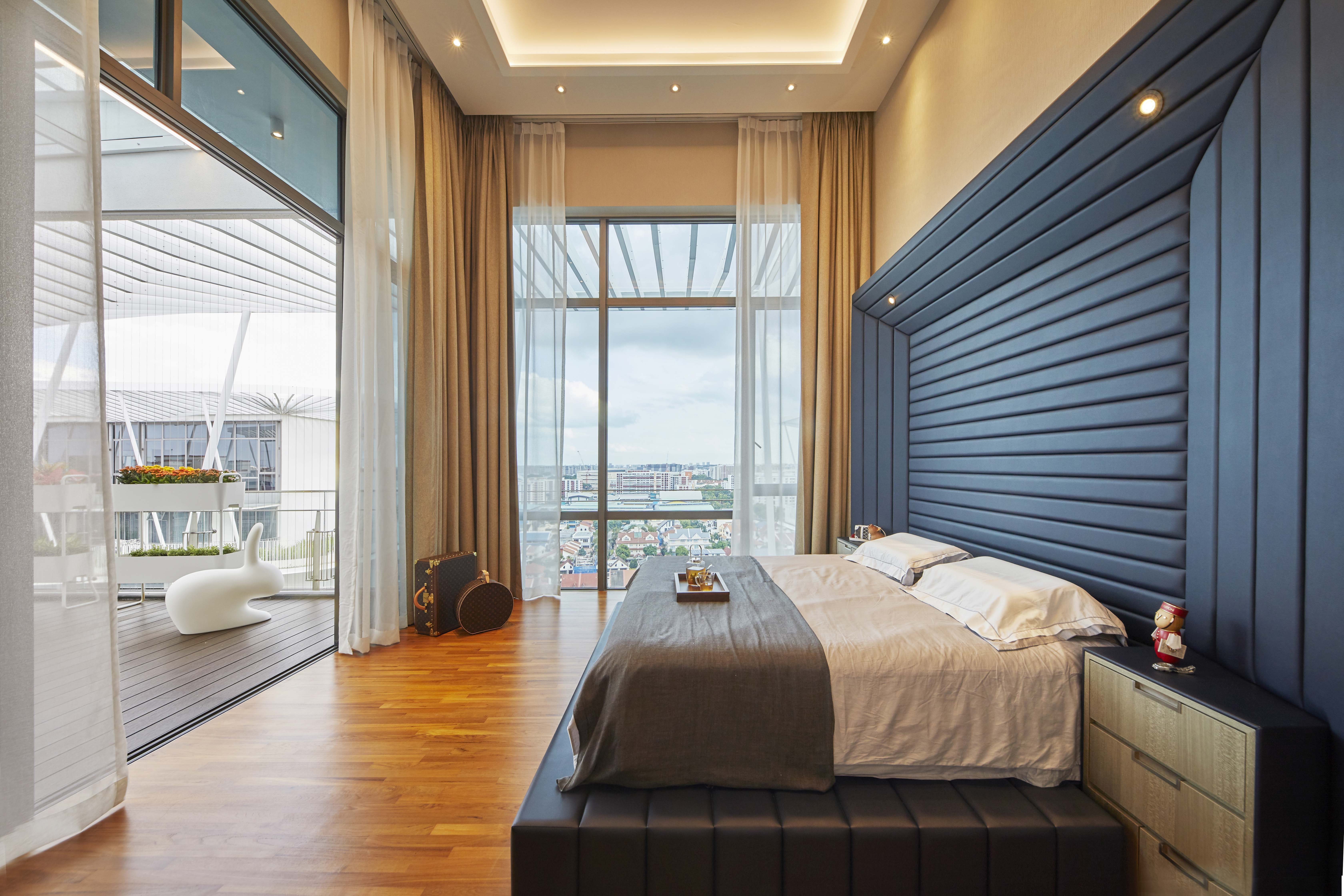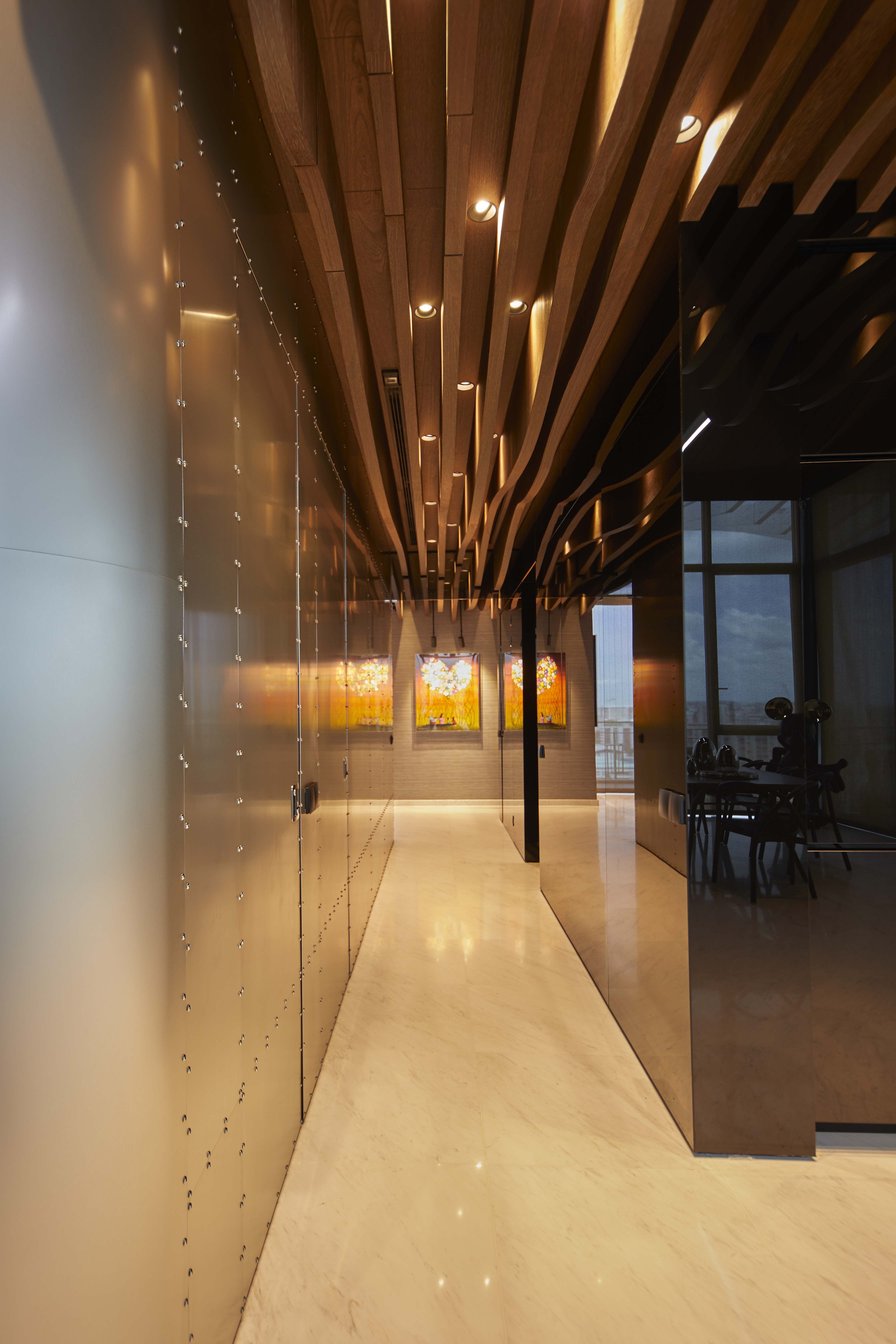 Exploiting the high ceiling of the penthouse and using the methodology of “Injecting Architecture”, the irregularly-shaped floor plan is being carved in such a way that the entire space is seemingly defined by the few families of volumetric forms that were “injected”. The aluminium-clad “spaceship” bearbrick display cabinet which volume visually extend to the other side of the home, encasing the TV wall cabinet system at the Family area. Part of this “family” are the 3 “light wells” light boxes which “protrude” into the living space through the curved ceiling.