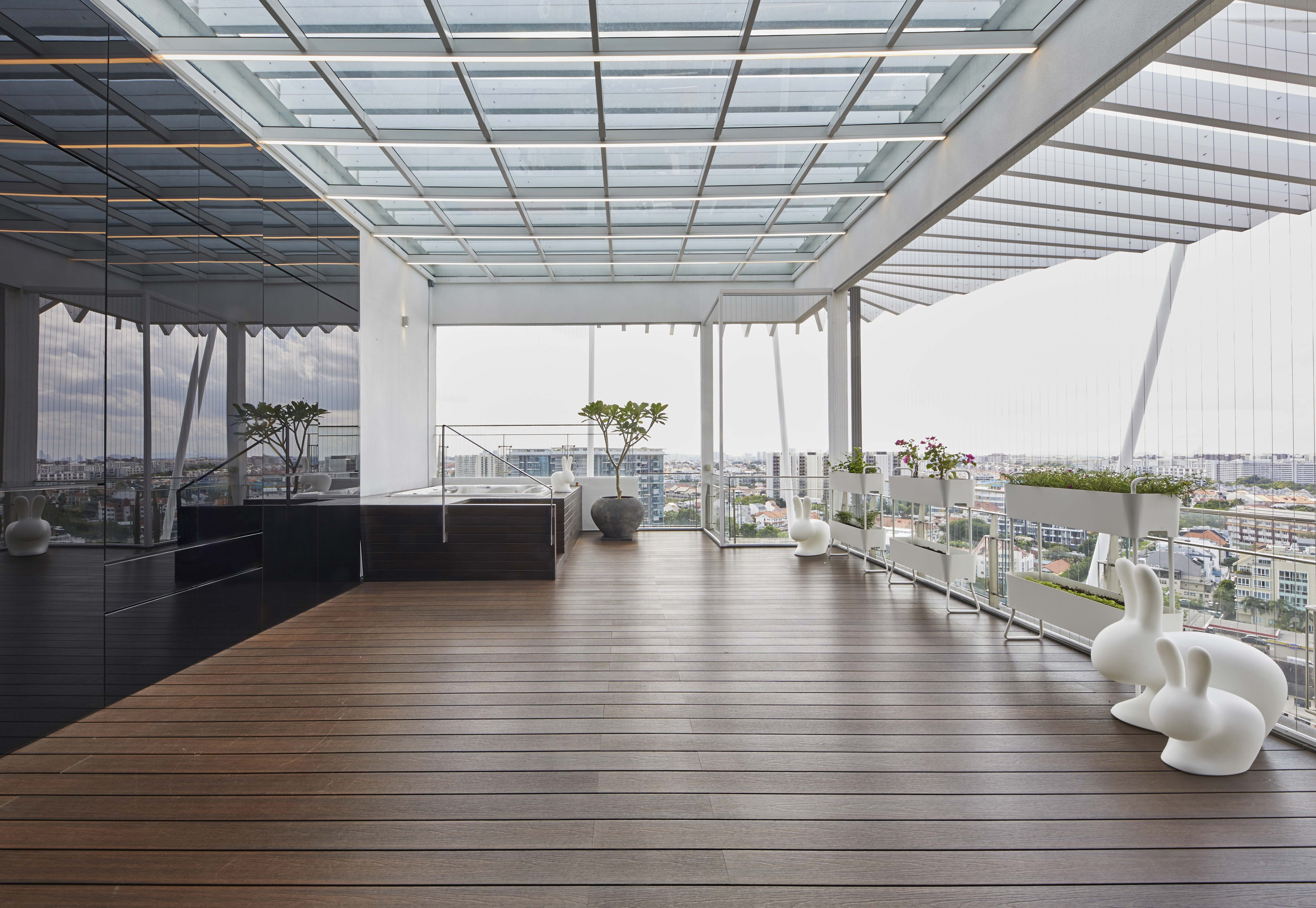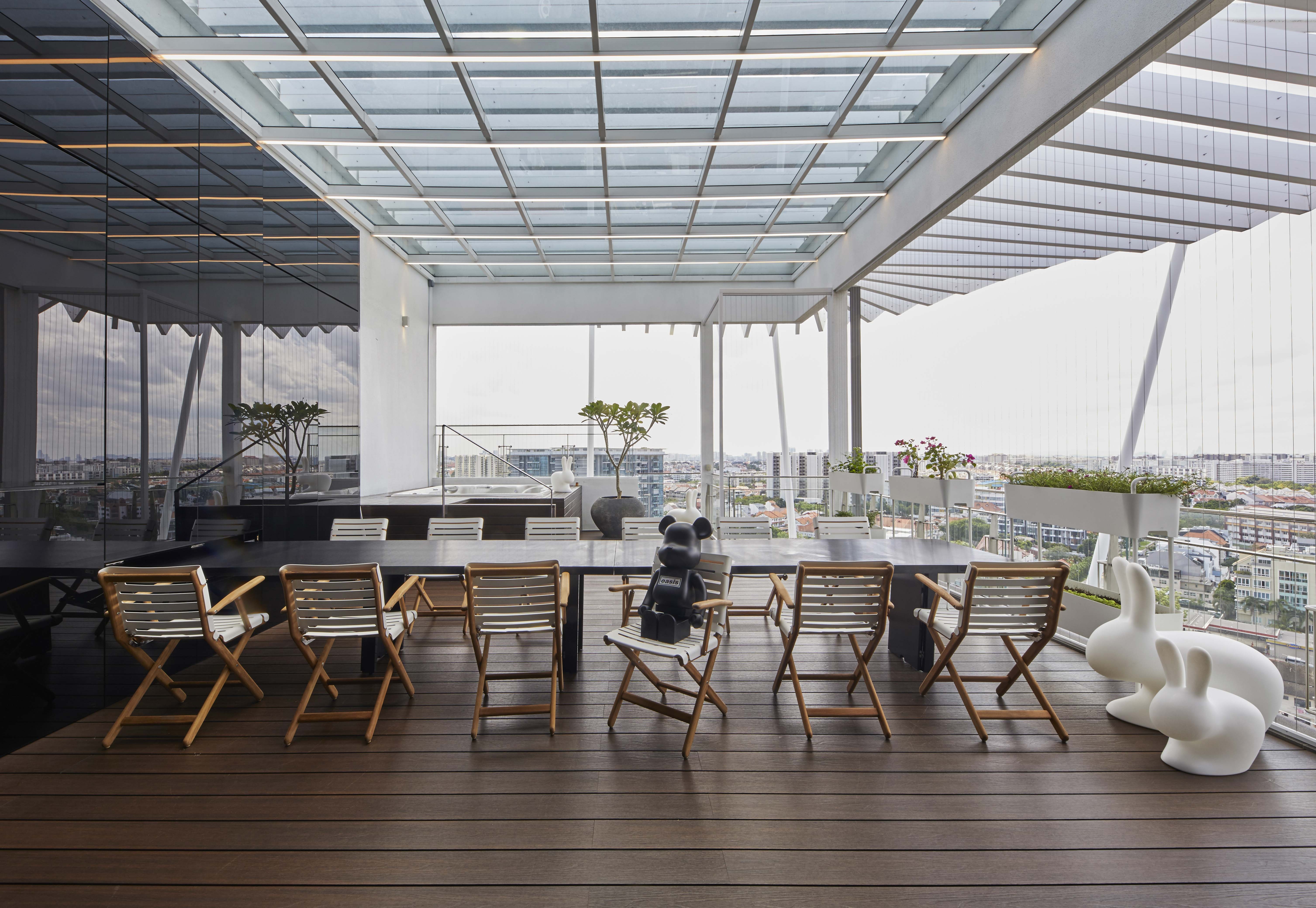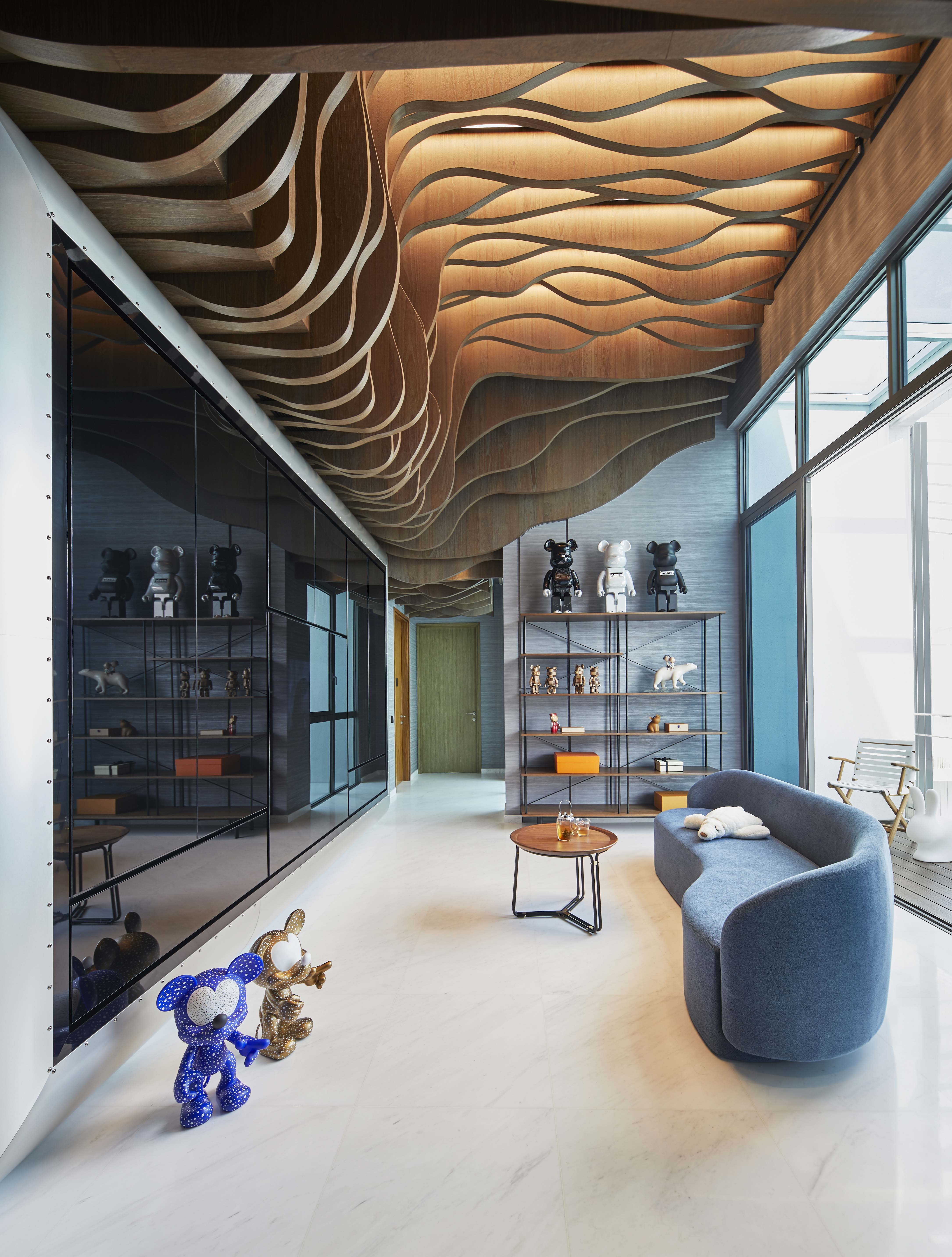 This penthouse house belongs to a young couple who are avid collectors of the Be@rbrick toys. Thus, the design narrative started with a platoon of bears from outer space coming to Earth and settling on top of a Tembusu tree in a vast rainforest.