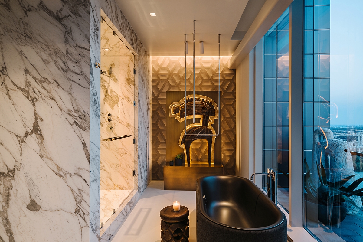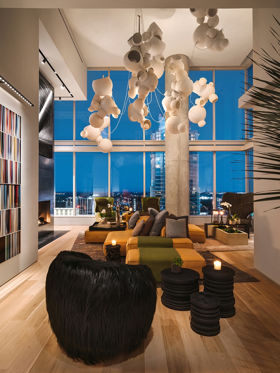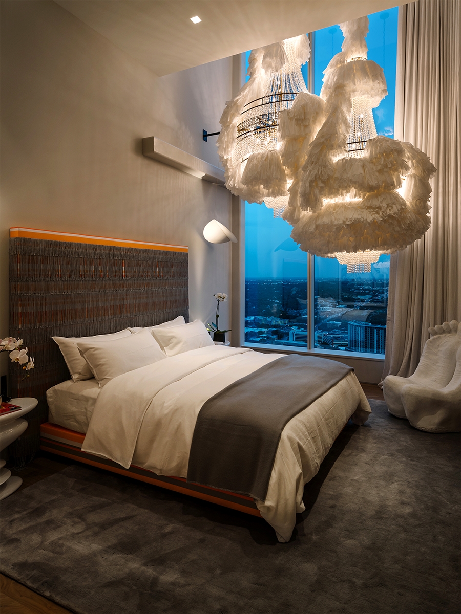 The client wanted his 34th floor penthouse to be a unique expression, filled with art and life. Our intention was to meld comfortable interiors with the sprawling views. As you enter, you're greeted by handmade "Bubble Lights" that give a cloud-like effect the living room. The kitchen to your right is handsome and clean with hidden drawers and popup appliances. You enter the master bedroom and discover two separate sitting areas, one designed for comfort and one to enjoy the view. There's carefully curated artwork in every room, including a unique painting in the dining room by Thomas Schoos.