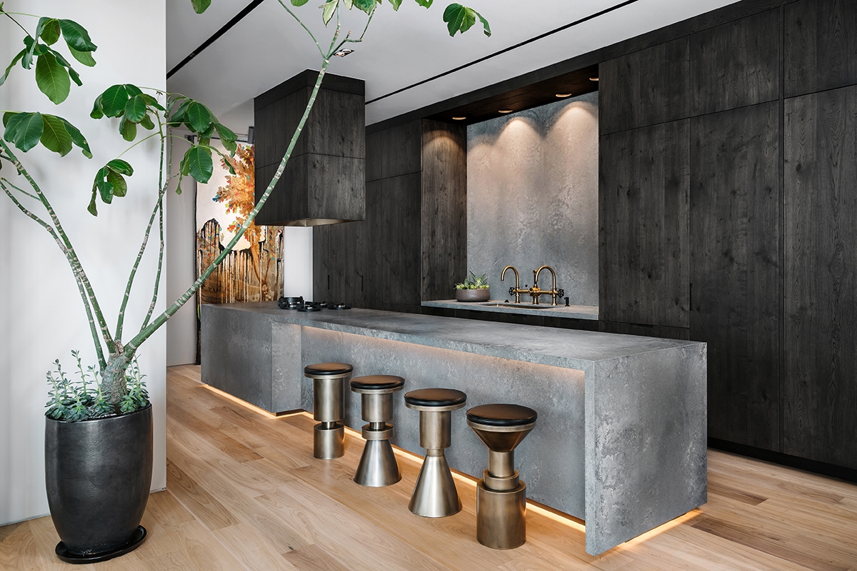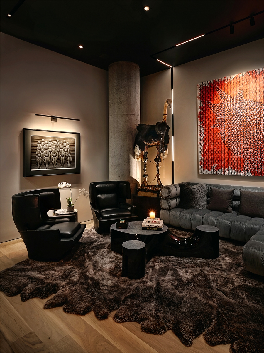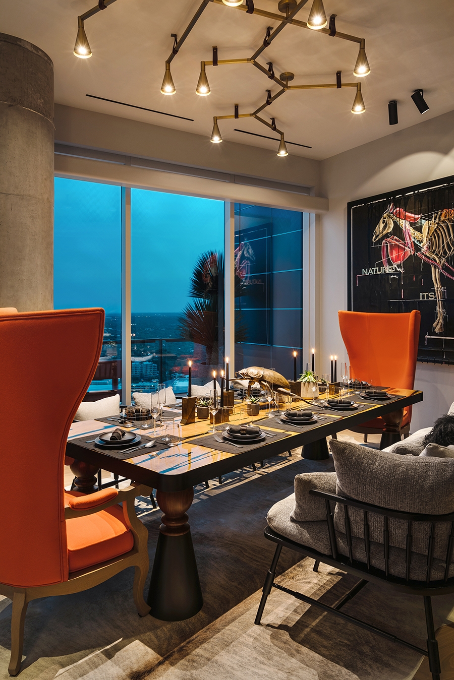 The client wanted his 34th floor penthouse to be a unique expression, filled with art and life. Our intention was to meld comfortable interiors with the sprawling views. As you enter, you're greeted by handmade "Bubble Lights" that give a cloud-like effect the living room. The kitchen to your right is handsome and clean with hidden drawers and popup appliances. You enter the master bedroom and discover two separate sitting areas, one designed for comfort and one to enjoy the view. There's carefully curated artwork in every room, including a unique painting in the dining room by Thomas Schoos.