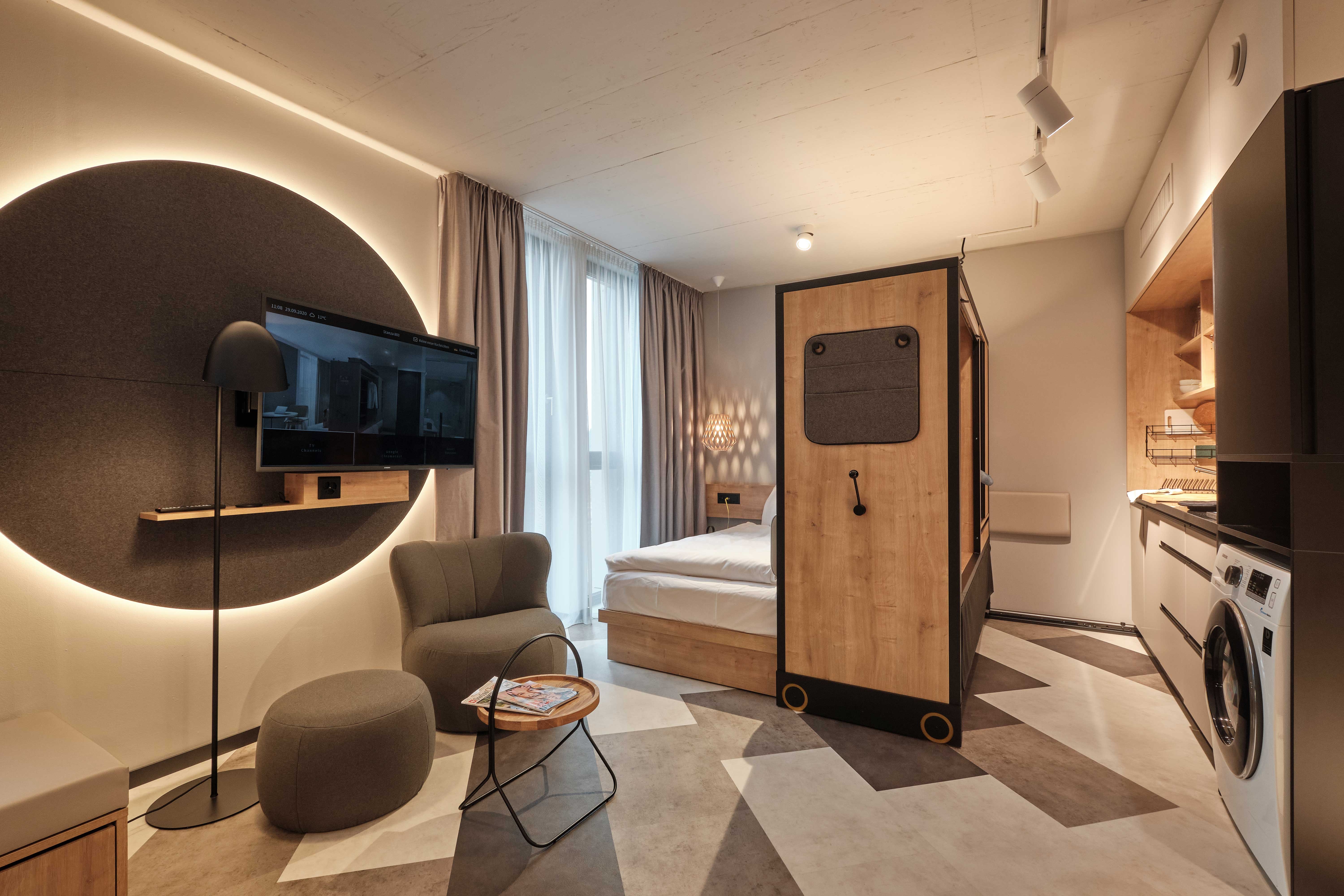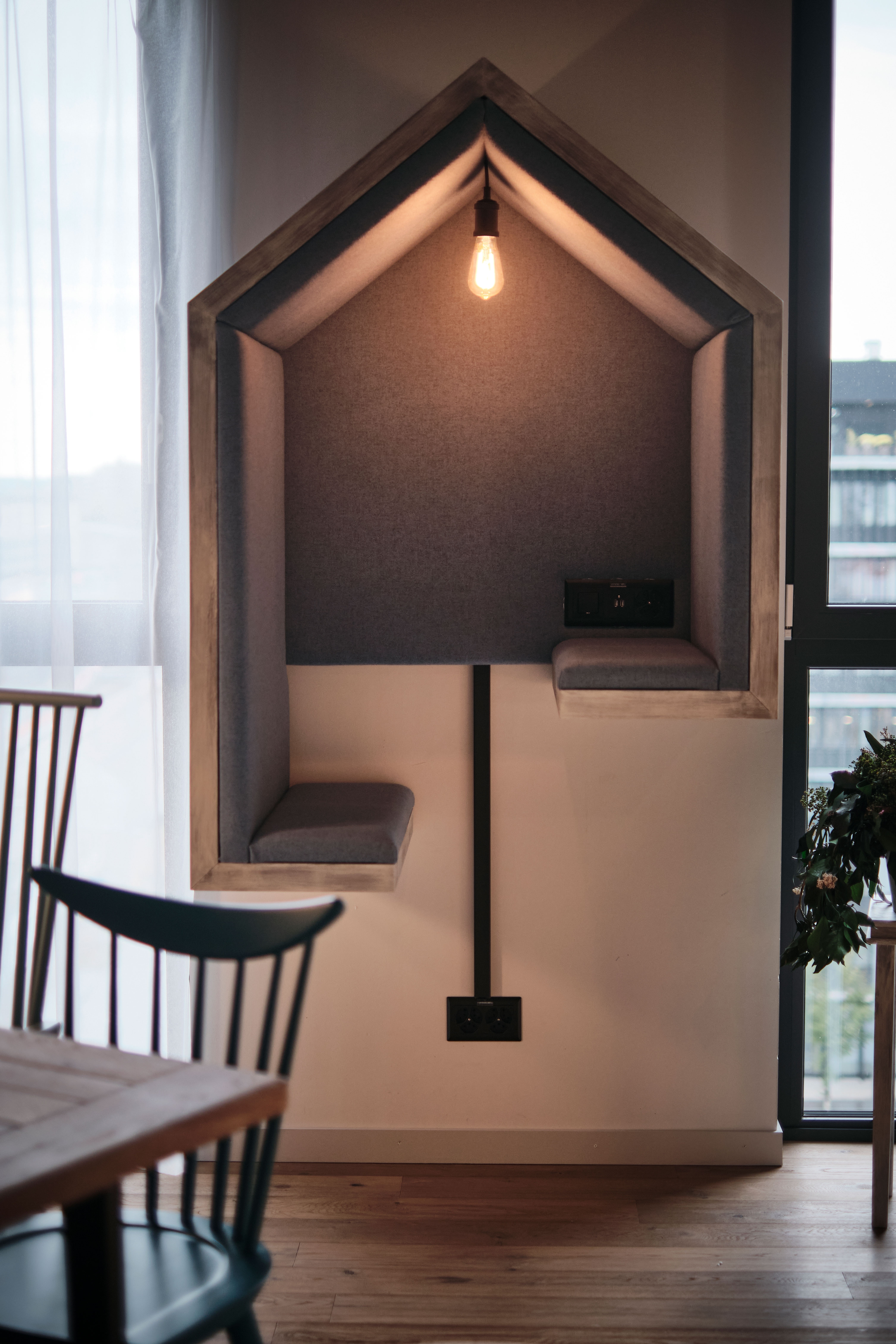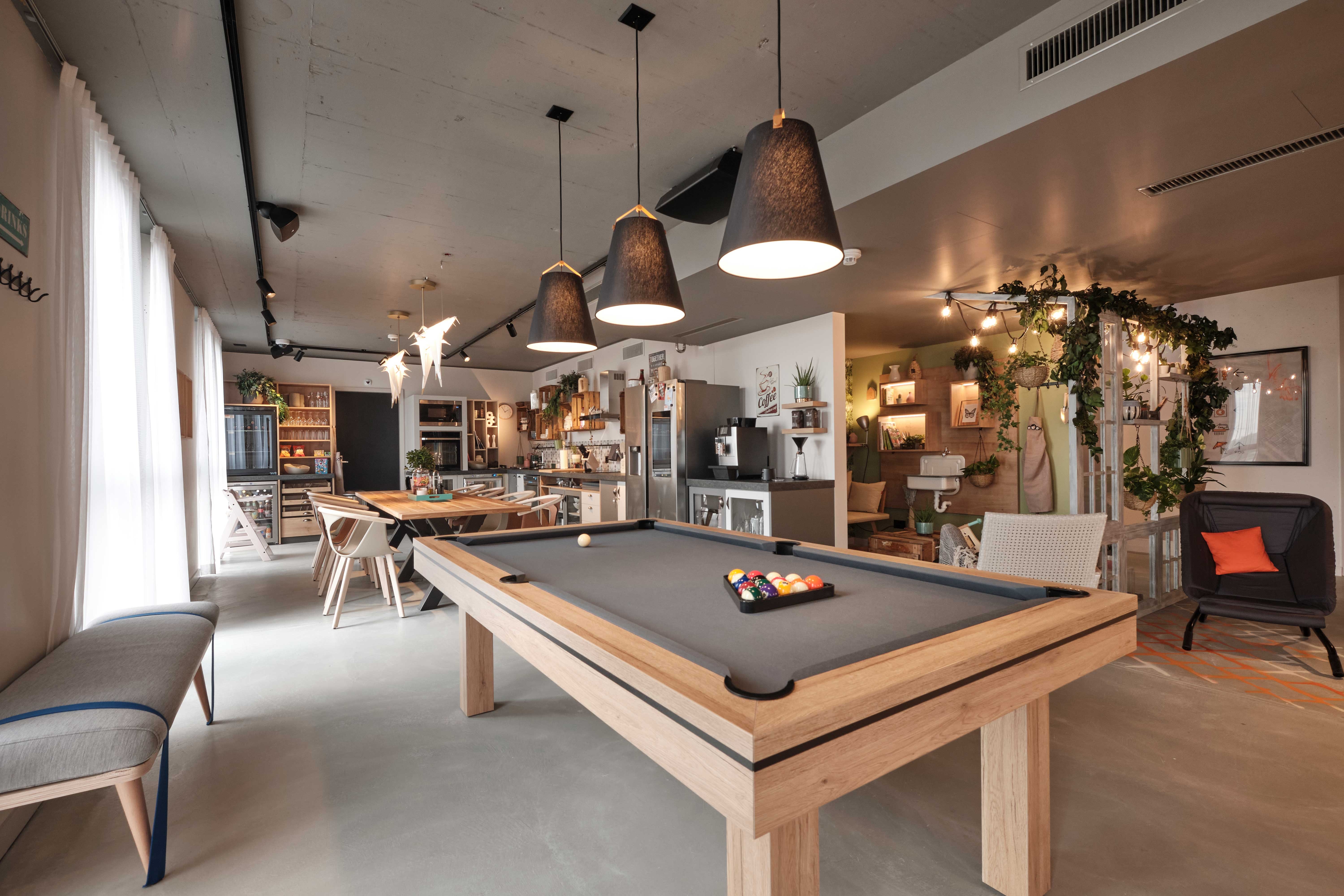 With the motto ‘Stay KooooK - Stay You’, the debut Stay Kooook short-term rental is all about personalized touches in bright, open & cosy spaces. The 59 studios each hold an ingenious mobile wall that slides back & forth for spatial flexibility when using the wardrobe, sofa, bed & kitchen. Controlled by a metal crank akin to those in library archives, this invention adds an extra 2sqm of living space to each studio. Built-in felt and chalk boards allow for further customization, plus guests can borrow public area plants, cushions & furniture to individualise their studios. Designed to feel like a home’s 'backyard' where friends socialise, the common areas feature cleverly staged vignettes where neighbours from other residences can relax and cook together. There’s no separate reception, lobby and bar. Once a host welcomes visitors, the rest runs via a smartphone app: check-in/out, opening doors & accessing bike storage. Community is a priority; furniture configurations encourage people to share ideas and experiences, while green plants and twinkling lights create a cosiness that invites them to linger and feel as comfortable as possible in their 'home away from home'.