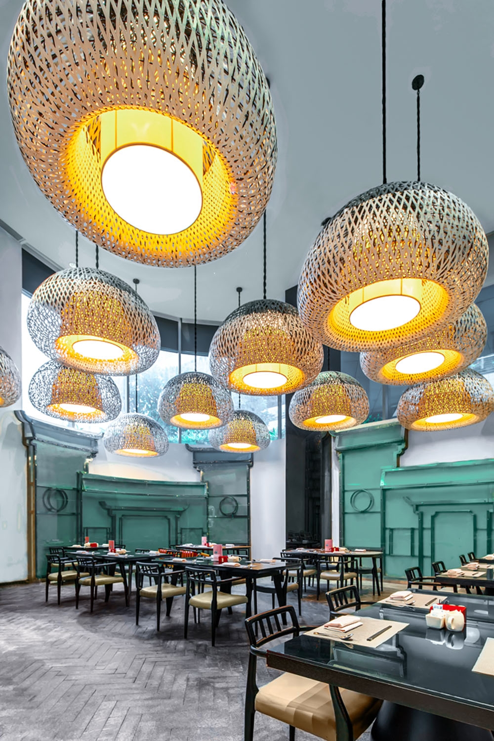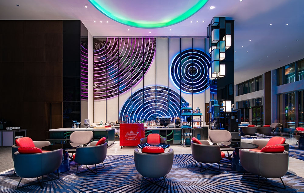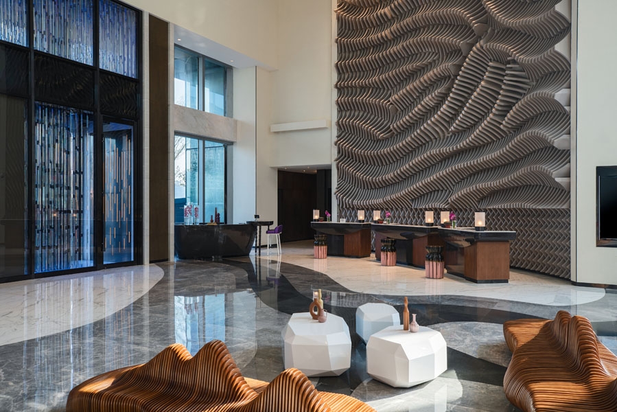 Renaissance NanNing is inspired by the Zhuang tribe in Guangxi, China. With agriculture as their main source of livelihood, the people paid tribute through ethnic music and dance. Bronze drums were believed to bring rain for irrigation whilst dragon-dance and fireworks celebrated a rich harvest. The guest arrival experience starts with the journey through the wet season and culminates with the harvest celebrations. Guests are greeted by the “raining” foyer dripping with vertical glass rods before entering the lobby. The sculptural feature wall at the reception counter reminds one of the terraced fields. At the All Day Dining, scenes of the street feast are recreated with abstract vernacular architecture facades with the buffet area interpreted as the village market. The inspiration for the banquet hall comes from the fireworks lighting to celebrate important festivals. The guestrooms tell the story of the tribe’s weaving craft. Lights are interwoven by casting overlapping beams of blue / red rays running through the entire corridor. The weaving story continues into the guestroom where deconstructed patterns are woven into the floor tiles, wall, carpet and lighting.