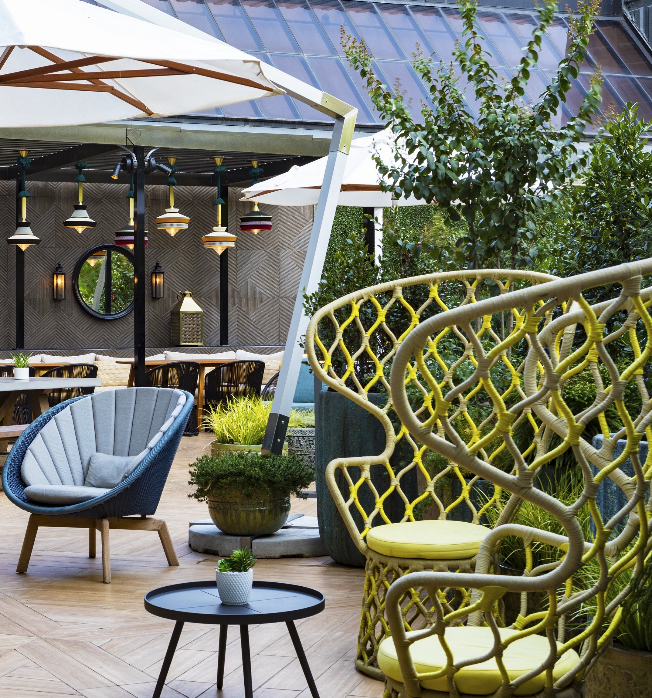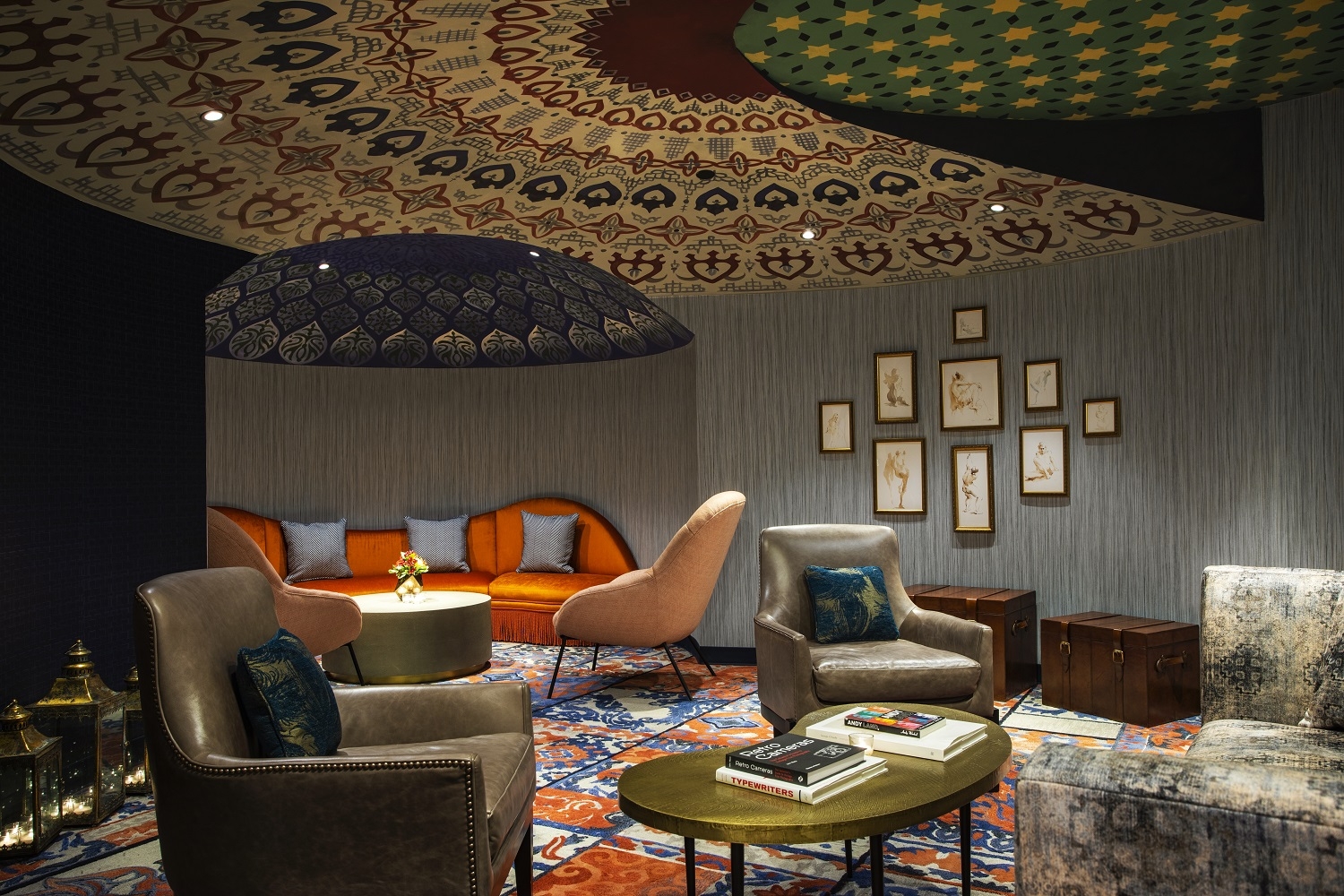 From the moment guests arrive they are transported into Arthur’s world. We wanted the space to reveal this new guest experience bit by bit. They are immediately welcomed by curved slats on the wall that caress and invite; this ties into the curves on the stairs in the lobby leading to the mezzanine. Also in the lobby are tiered terraces with amphitheater seating. We created grand custom light pieces, cascading abstract birdcages representing those Arthur collected during his North African excursions. Graphically we began with darker colors and went lighter to create depth and layering. For the bar and lounge, we created a larger space providing seamless transition from indoor to outdoor living, allowing guests multiple areas to socialize. Arthur's global sensibility is on full display, curated with one-of-a-kind pieces throughout.