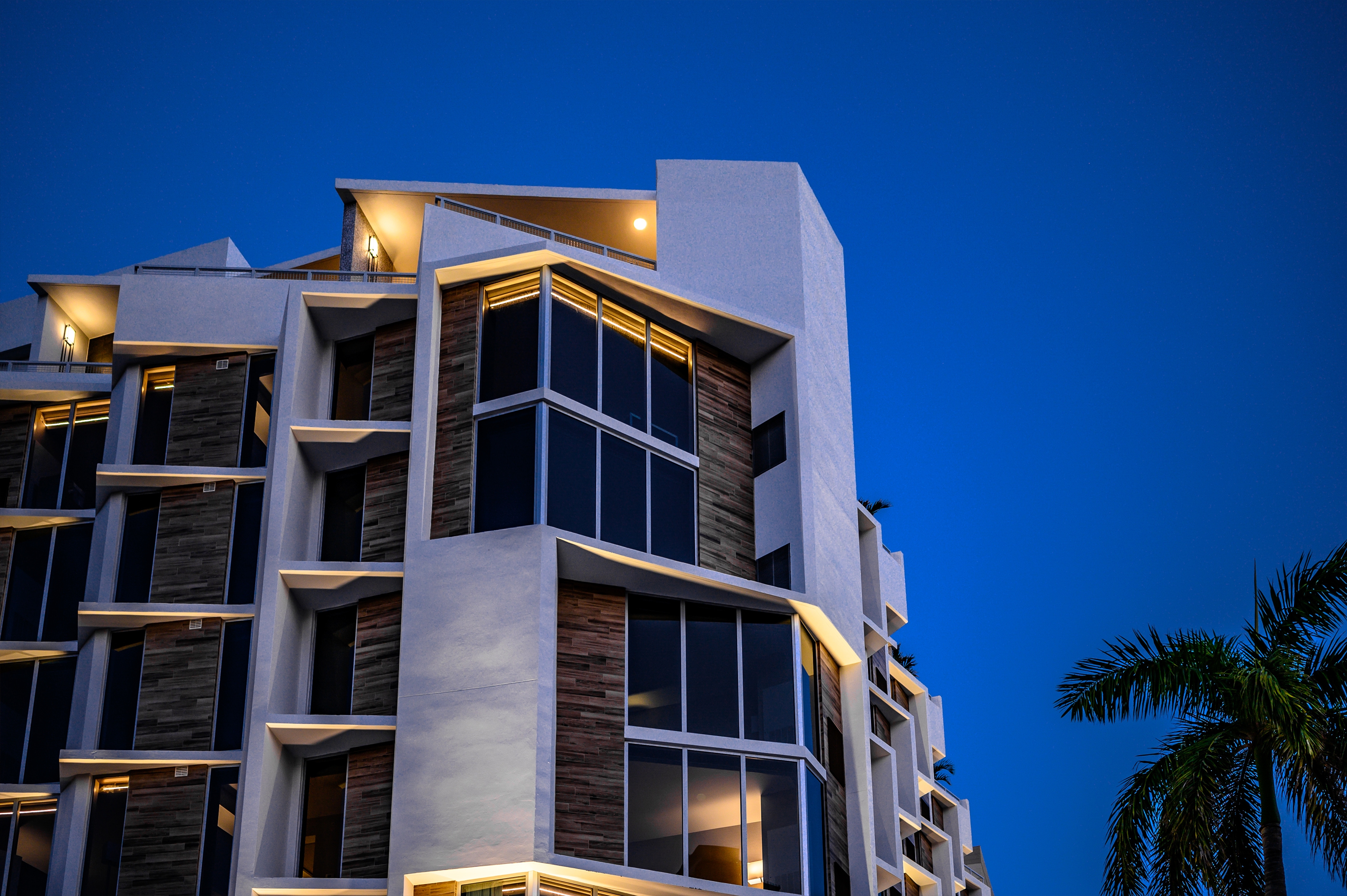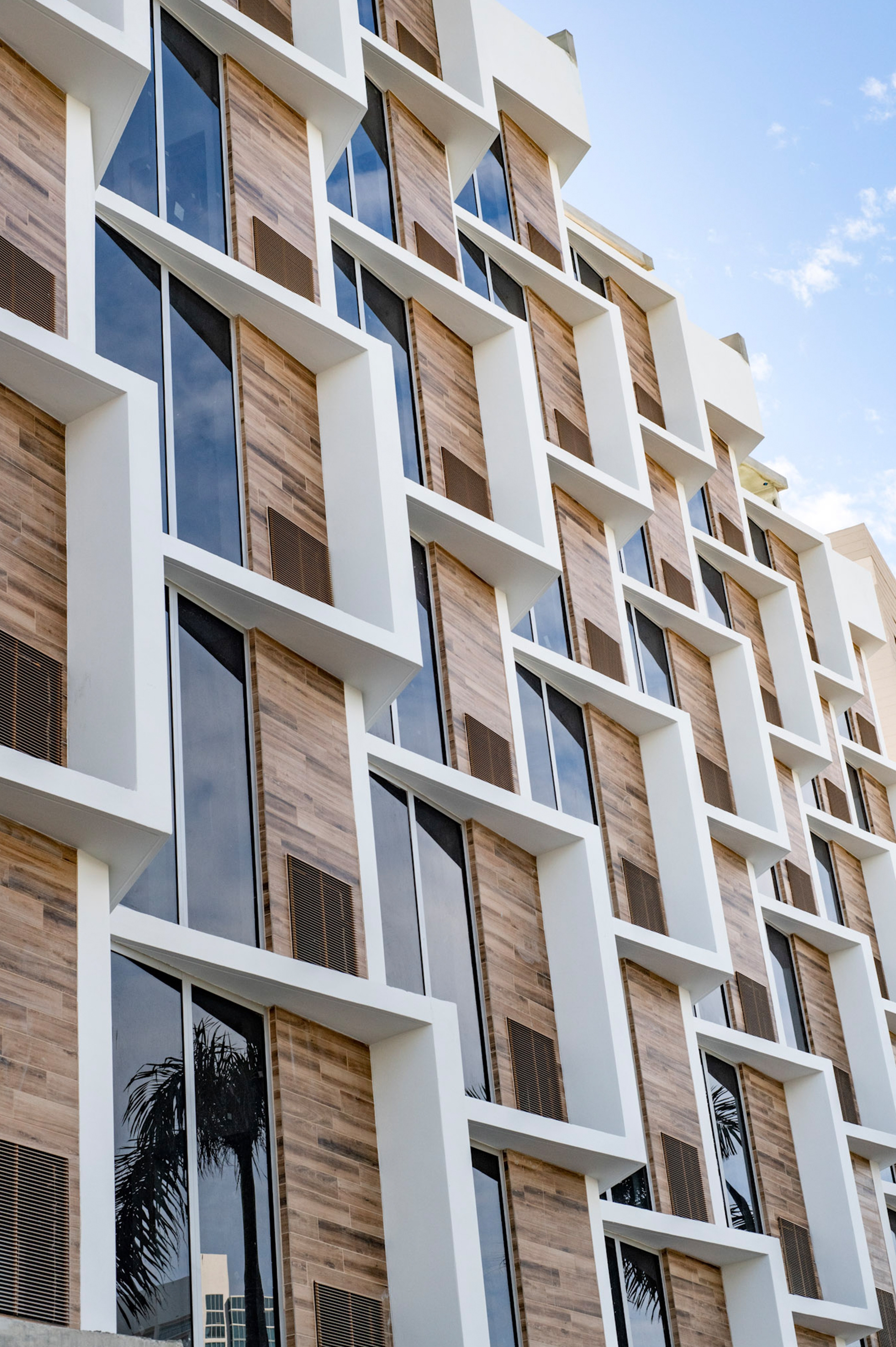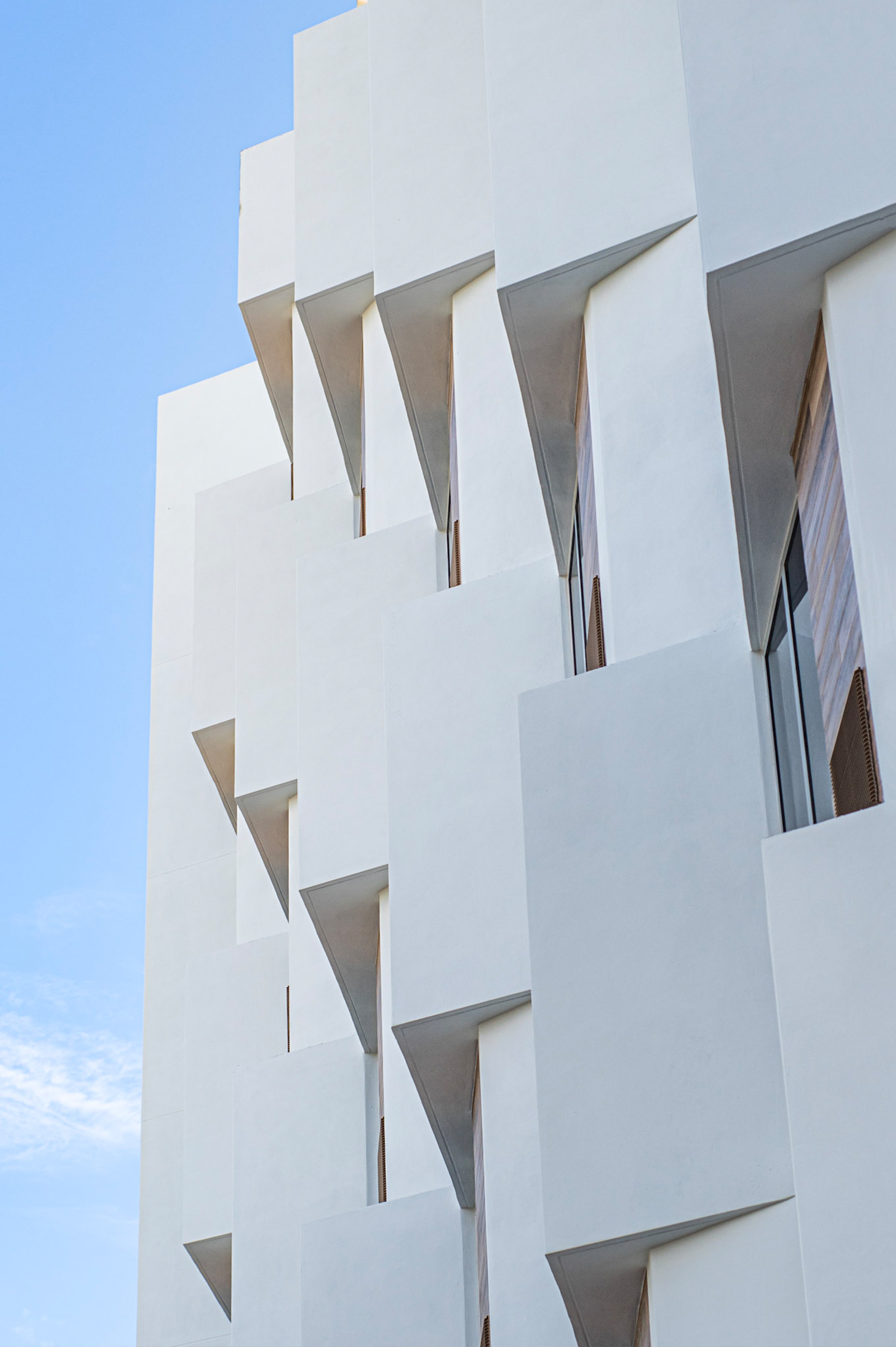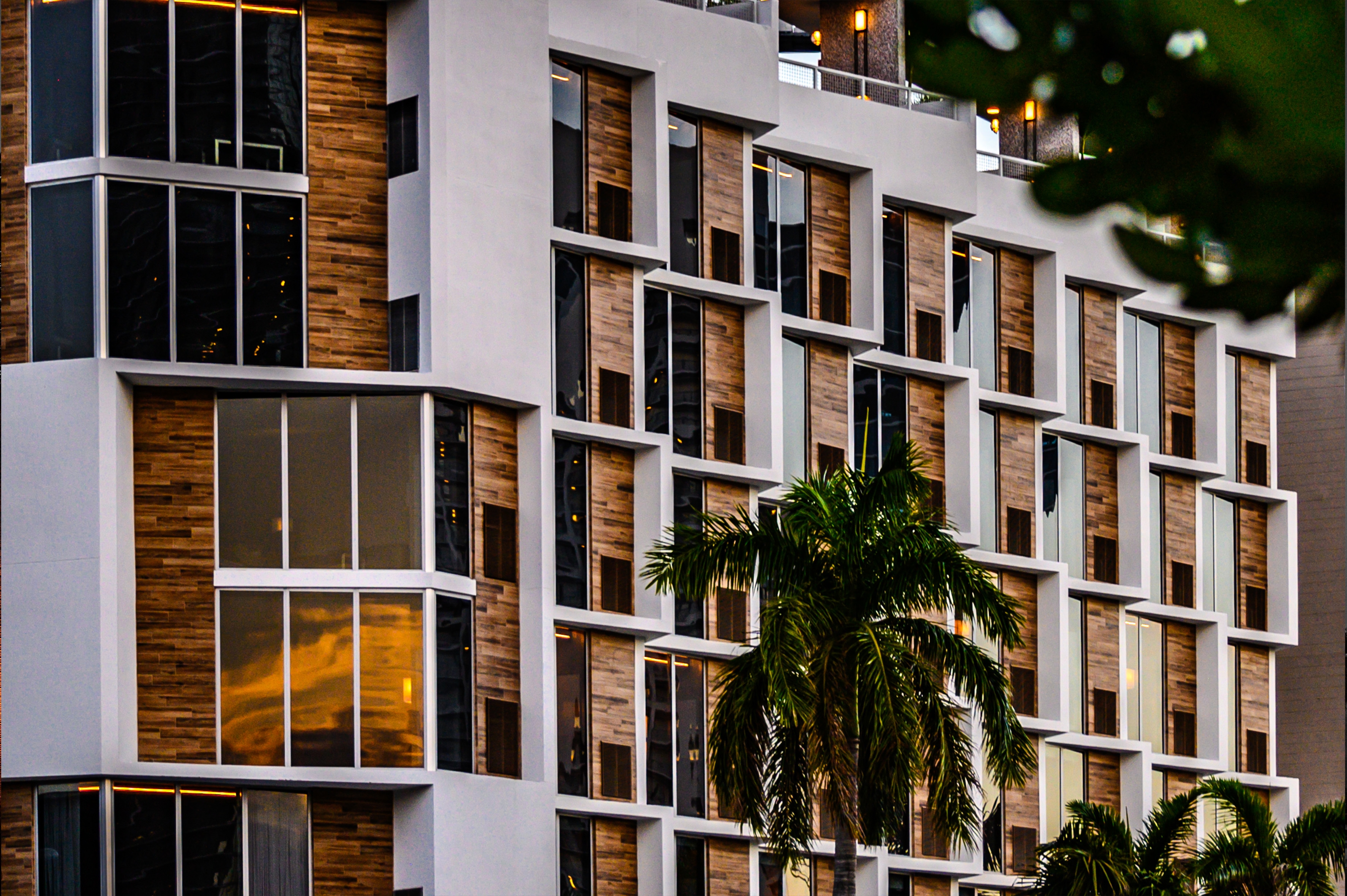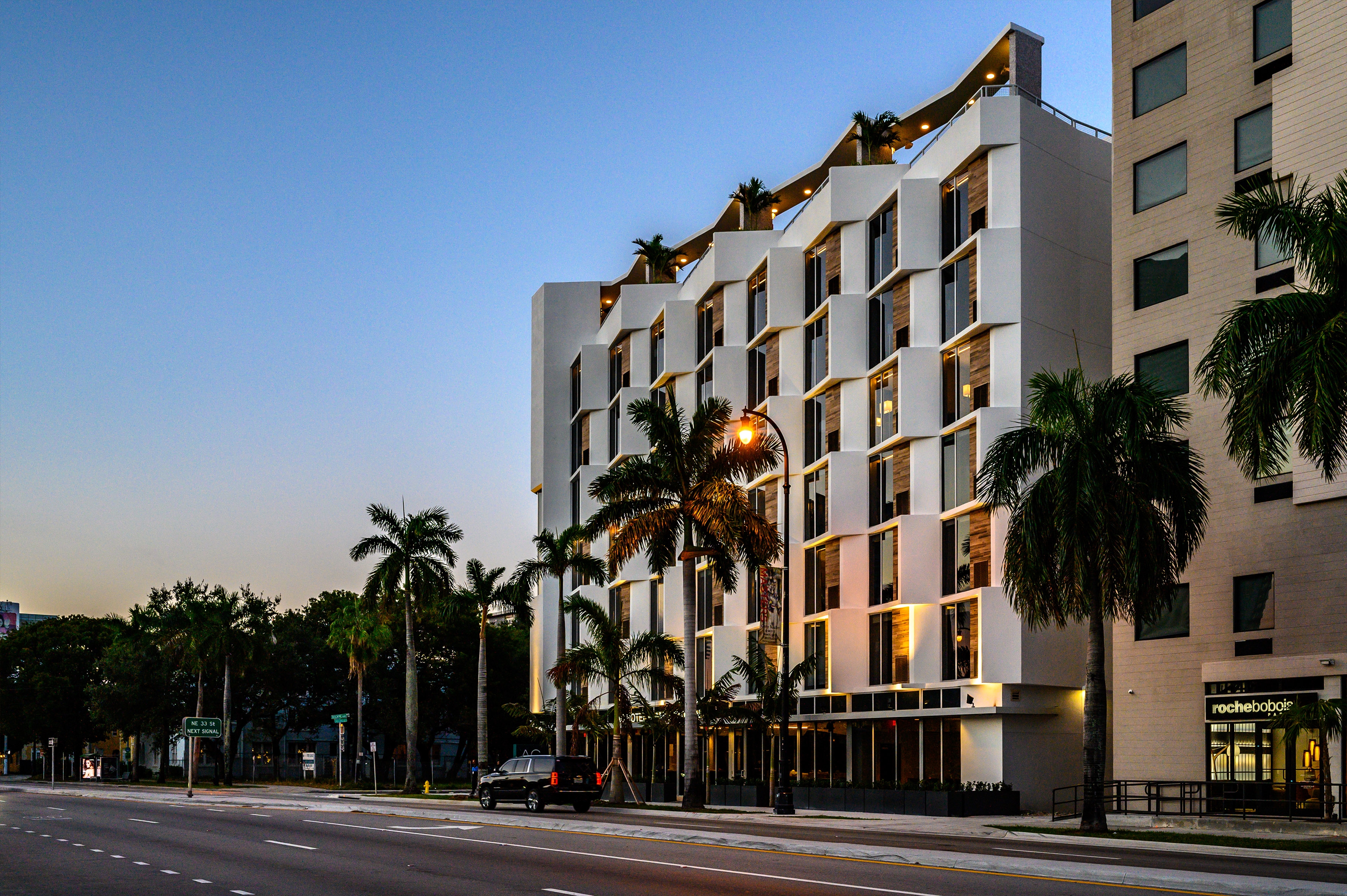 Its cutting-edge design creates a dramatic, prominent building on Biscayne Blvd. The sophisticated geometry of the façade is a series of white protruding boxes with contrasting glass and wood panels, creating beautiful shadows on the façade of the building and adding a distinctive personality to the hotel.