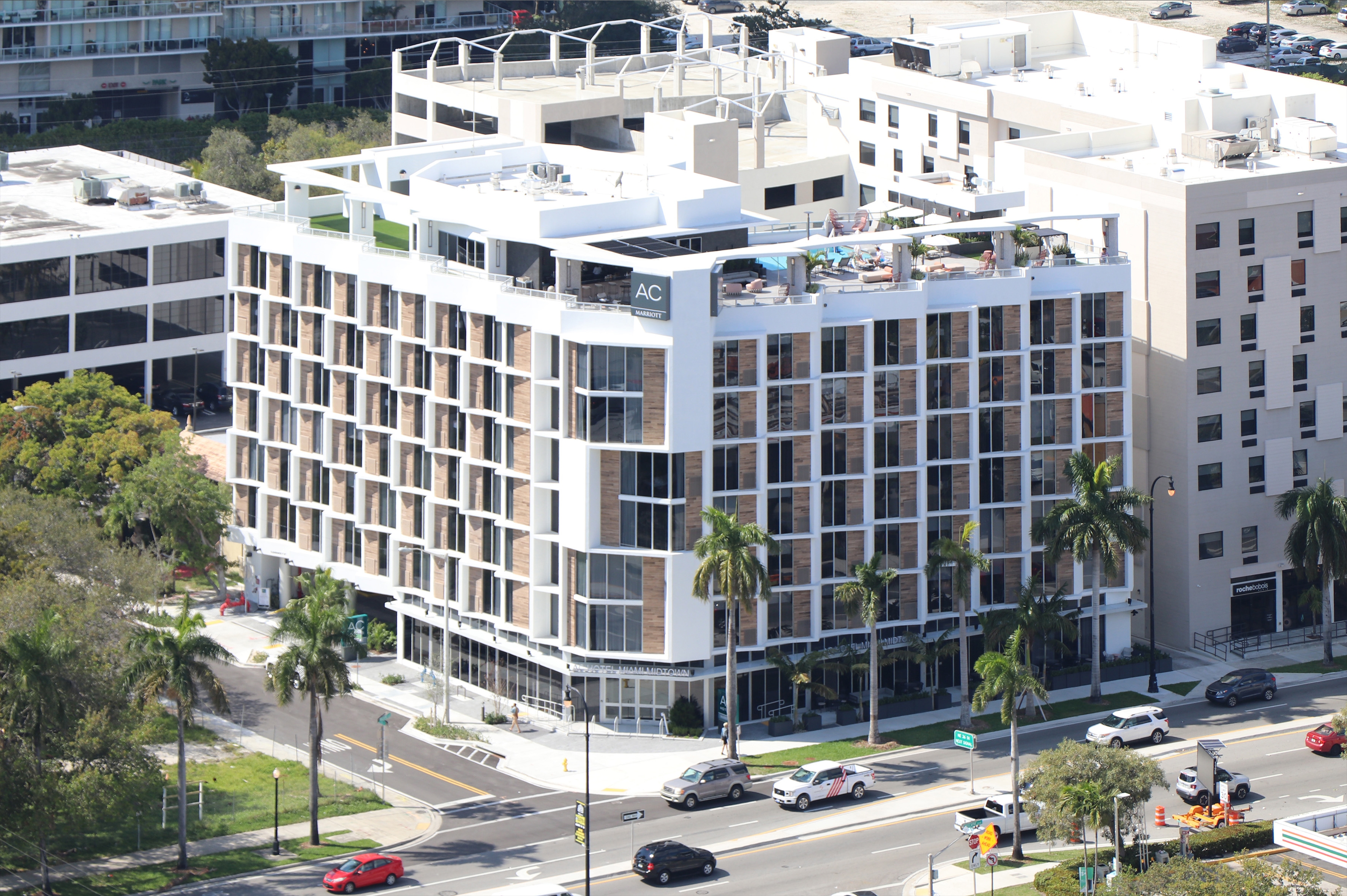 This seven-story hotel includes 153 hotel rooms and retail space on the ground floor. Amenities include a rooftop, ocean-view pool, fitness center, and communal spaces offering modern technology for guests to work, connect, explore, and socialize. A rooftop bar serves as a focal point, inviting guests to unwind while overlooking Biscayne Bay.