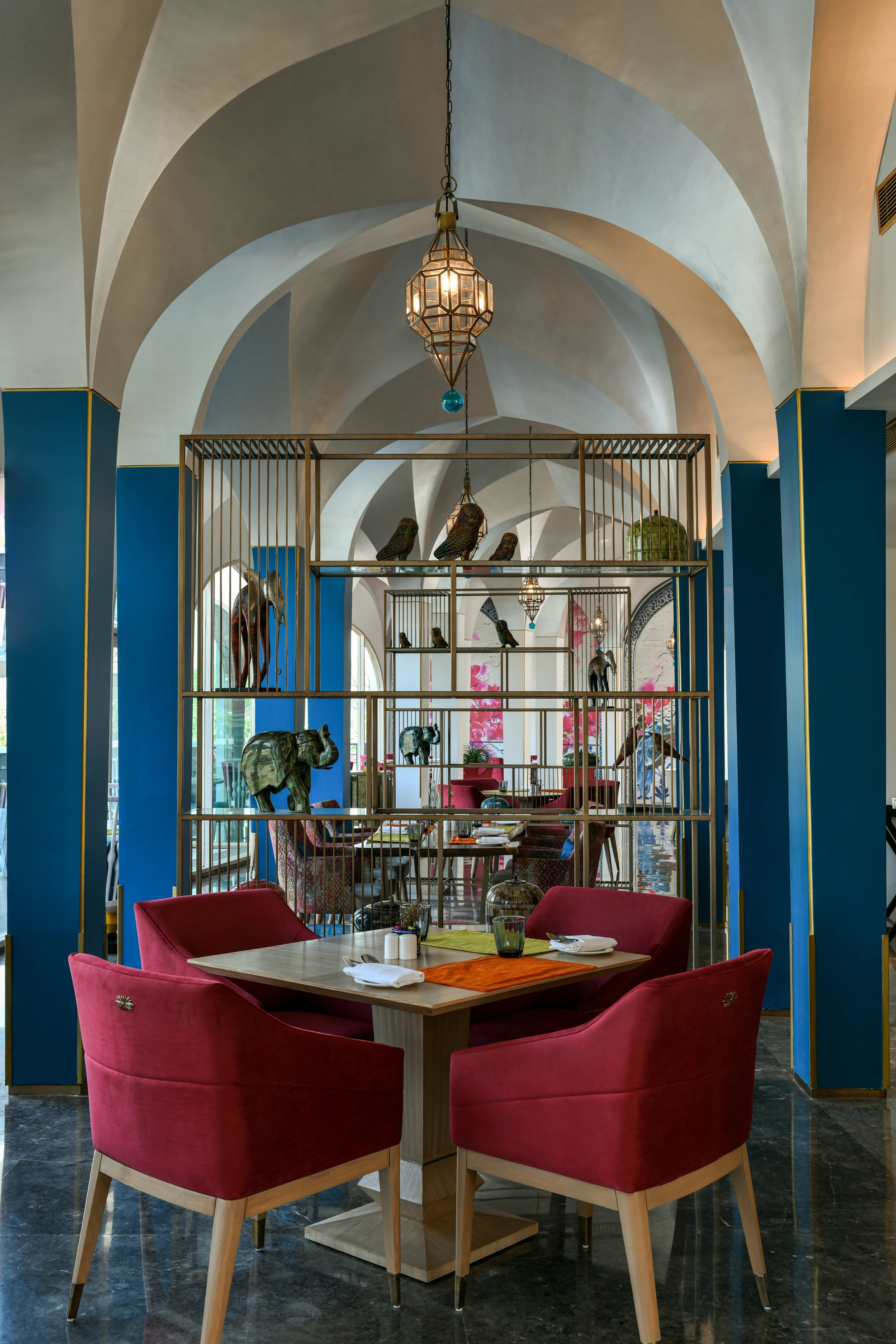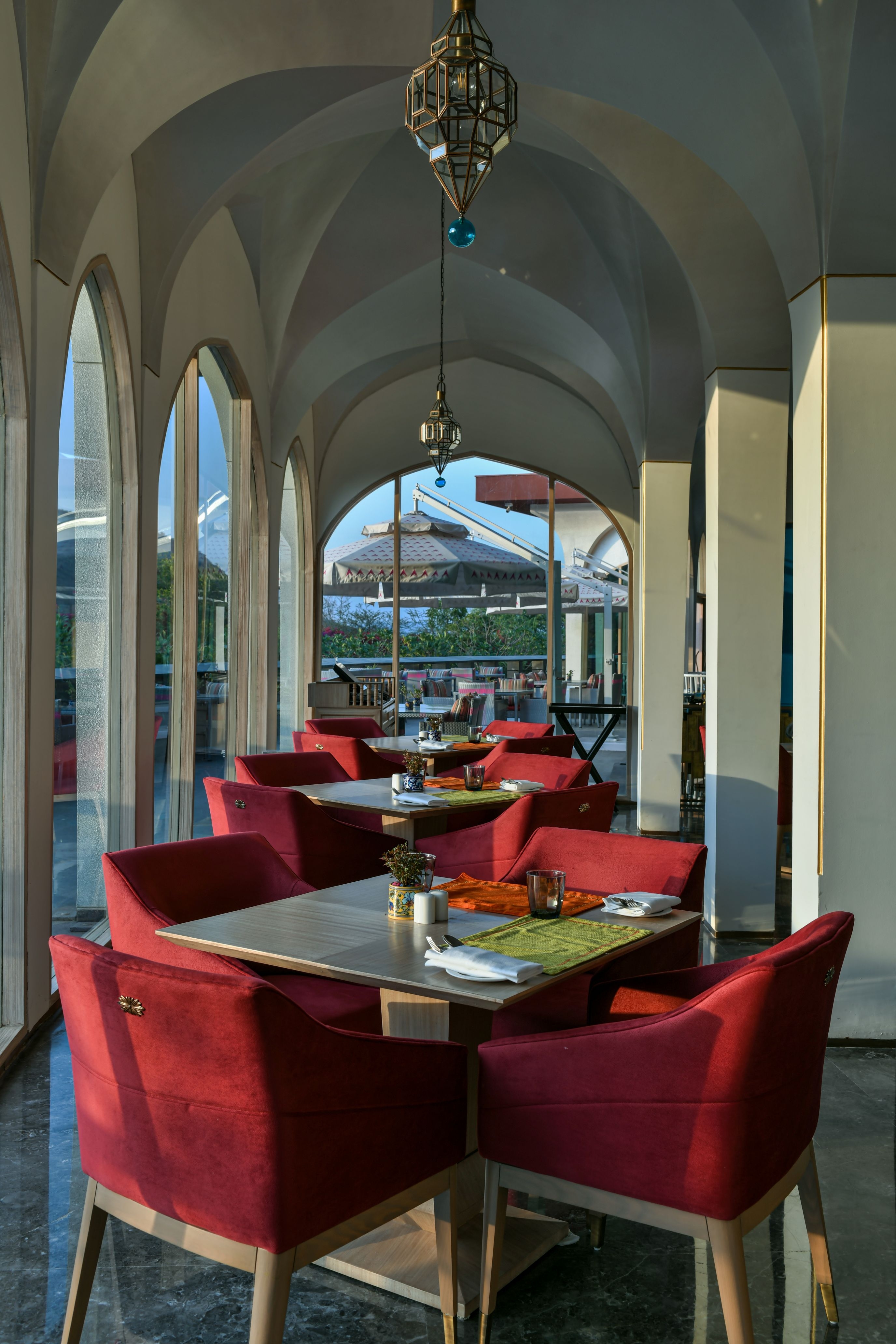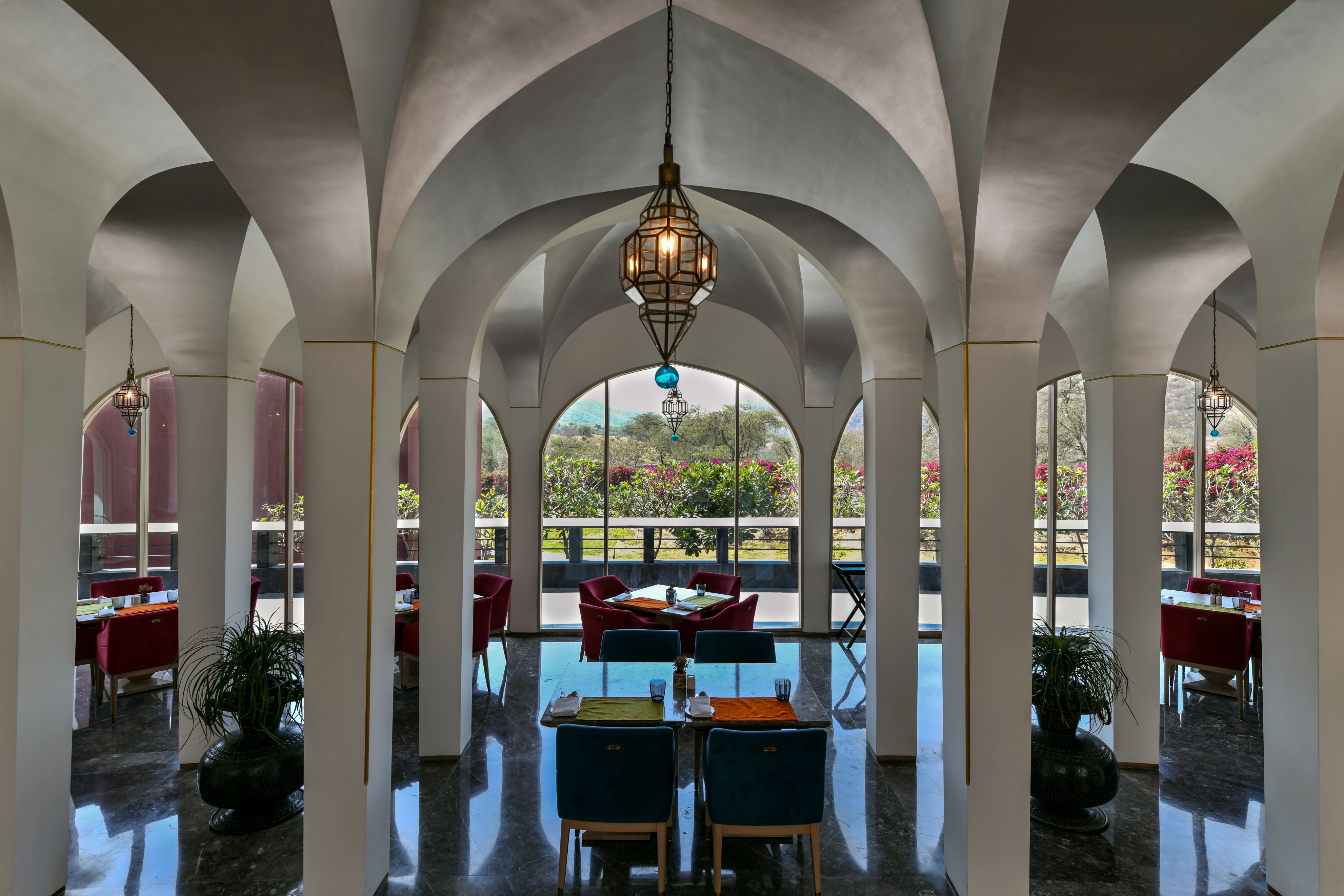 Spanning over an area of 20 acres, the entire hotel exemplifies bold, big, and captivating with subtle regional nuances. The project, being part of Taj Hotels’ new line of boutique spaces called ‘SeleQtion’ by IHCL, had to have an isolated identity and design language. The central theme of the hotel is "Ratn" (Jewel). This is prevalent in the glistening ceiling design and lighting elements, colourful hues with a composition of vibrant décor items, furniture configurations, and customized soft furnishings depicting Rajasthani culture. The landscaping stimulated by Mughal architecture adds to the regal essence of the space. A hidden gem as part of the boutique hotel is the all-day dining called “Vyom” that offers seating arrangement to experience the clear views of the Aravalli hills.