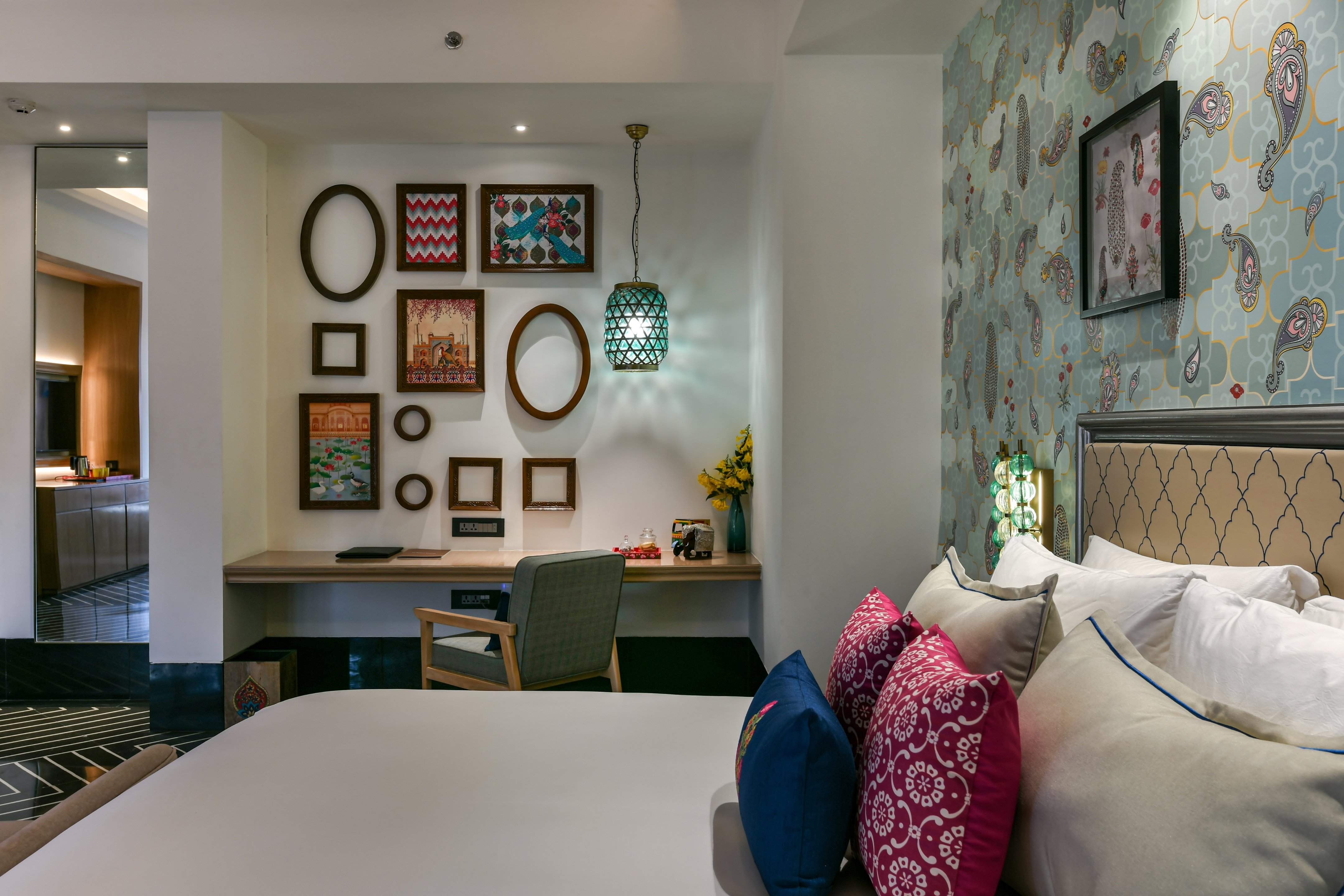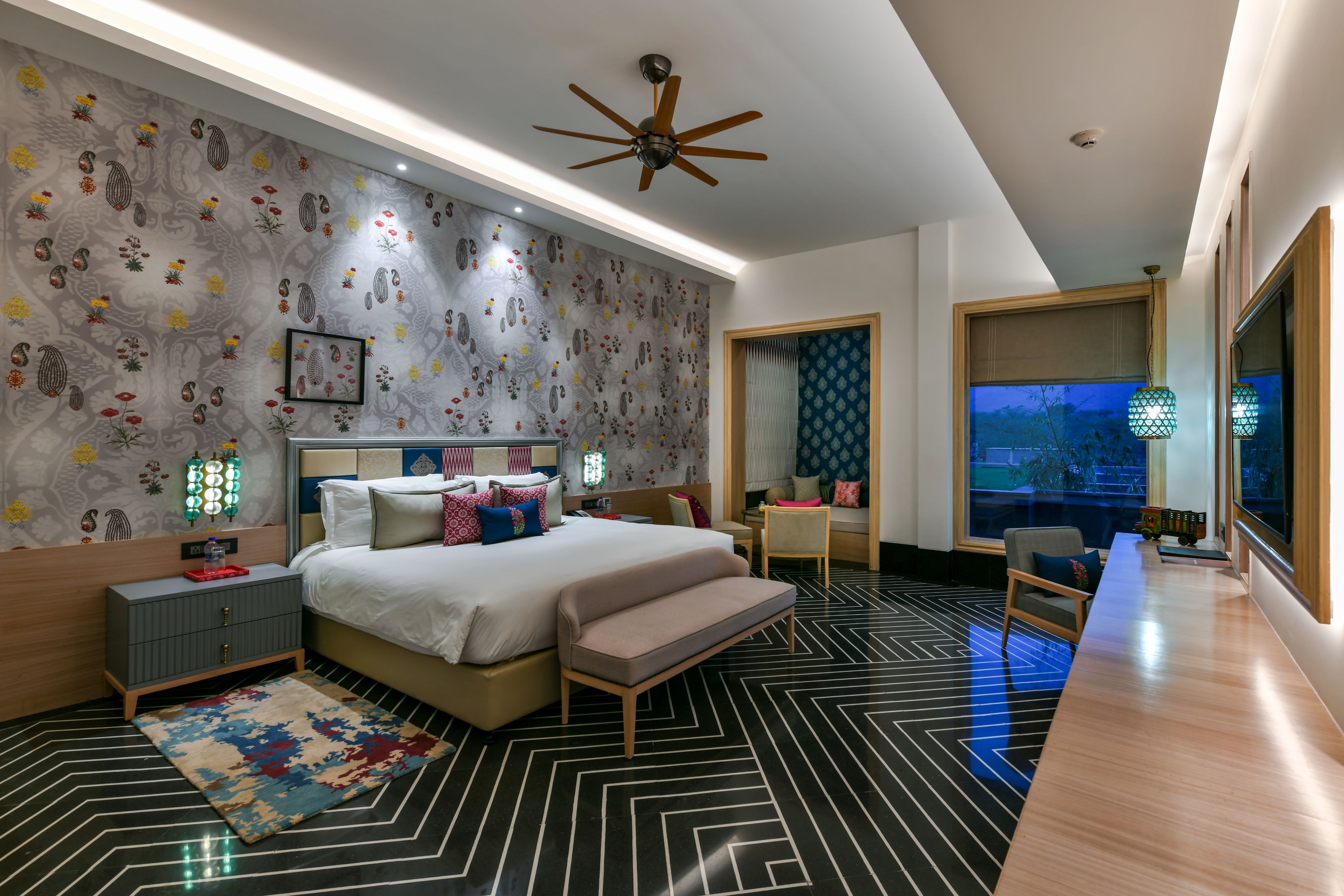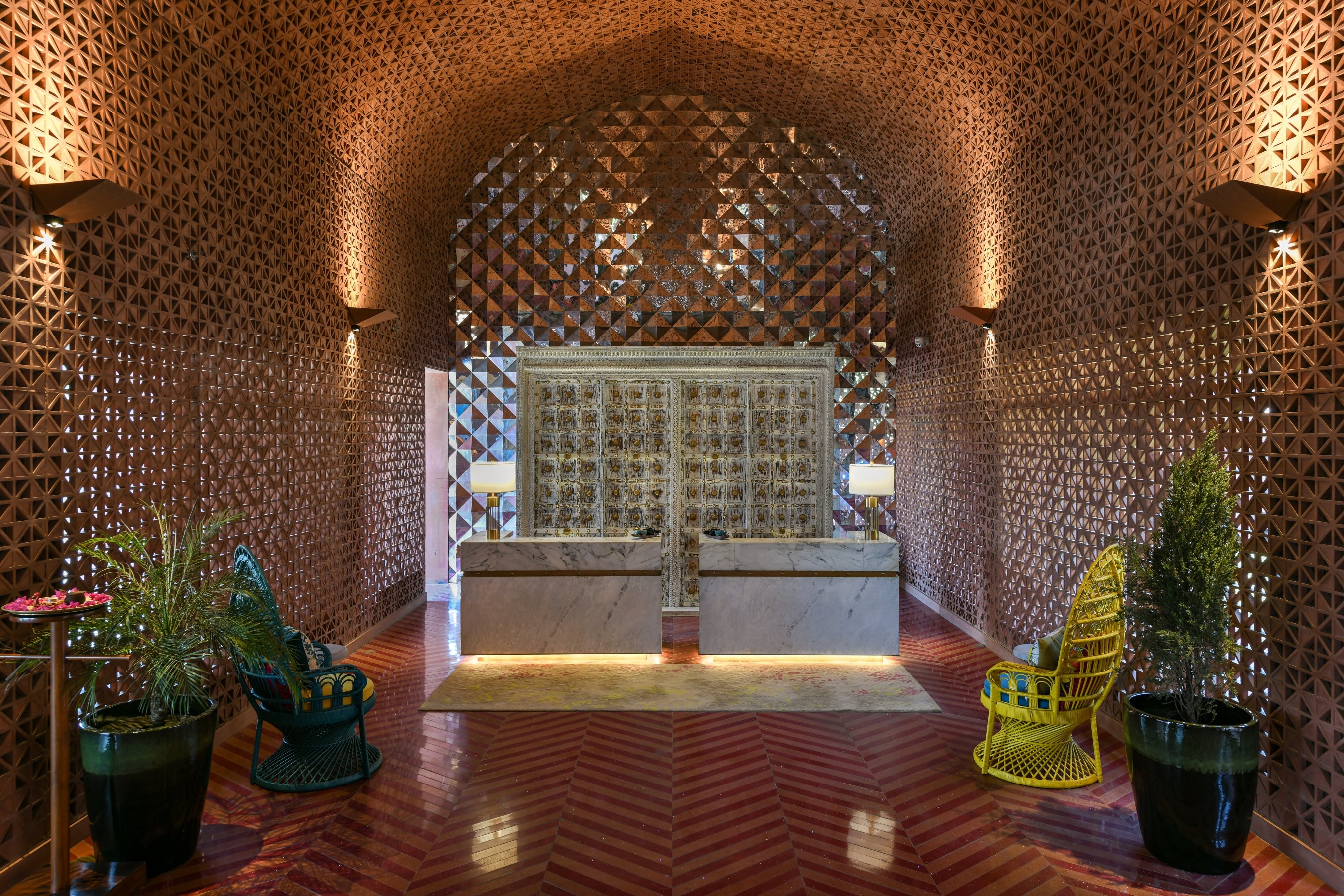 Spanning over an area of 20 acres, the entire hotel exemplifies bold, big, and captivating with subtle regional nuances. The project, being part of Taj Hotels’ new line of boutique spaces called ‘SeleQtion’ by IHCL, had to have an isolated identity and design language. The central theme of the hotel is "Ratn" (Jewel). This is prevalent in the glistening ceiling design and lighting elements, colourful hues with a composition of vibrant décor items, furniture configurations, and customized soft furnishings depicting Rajasthani culture. The landscaping stimulated by Mughal architecture adds to the regal essence of the space. A hidden gem as part of the boutique hotel is the all-day dining called “Vyom” that offers seating arrangement to experience the clear views of the Aravalli hills.