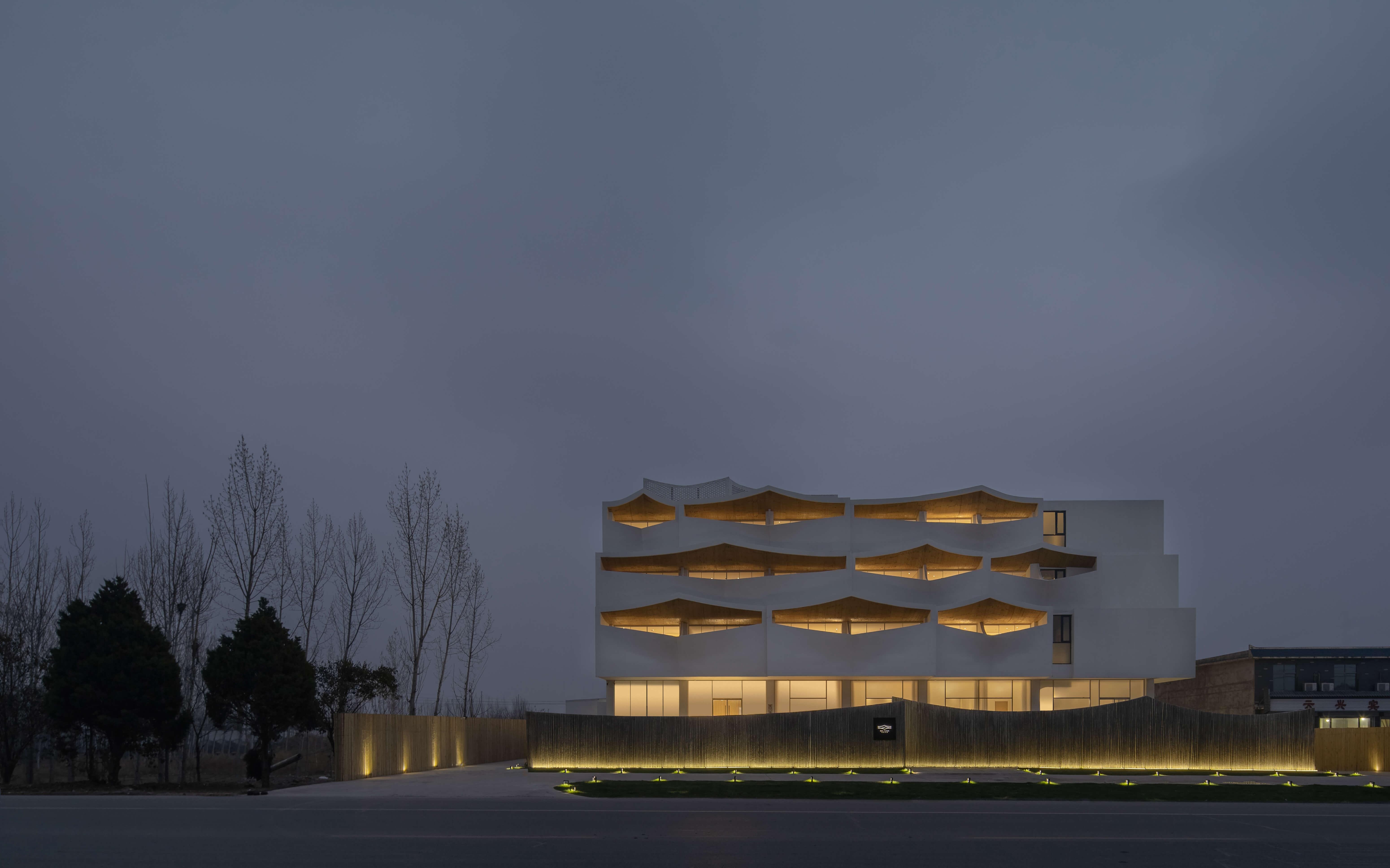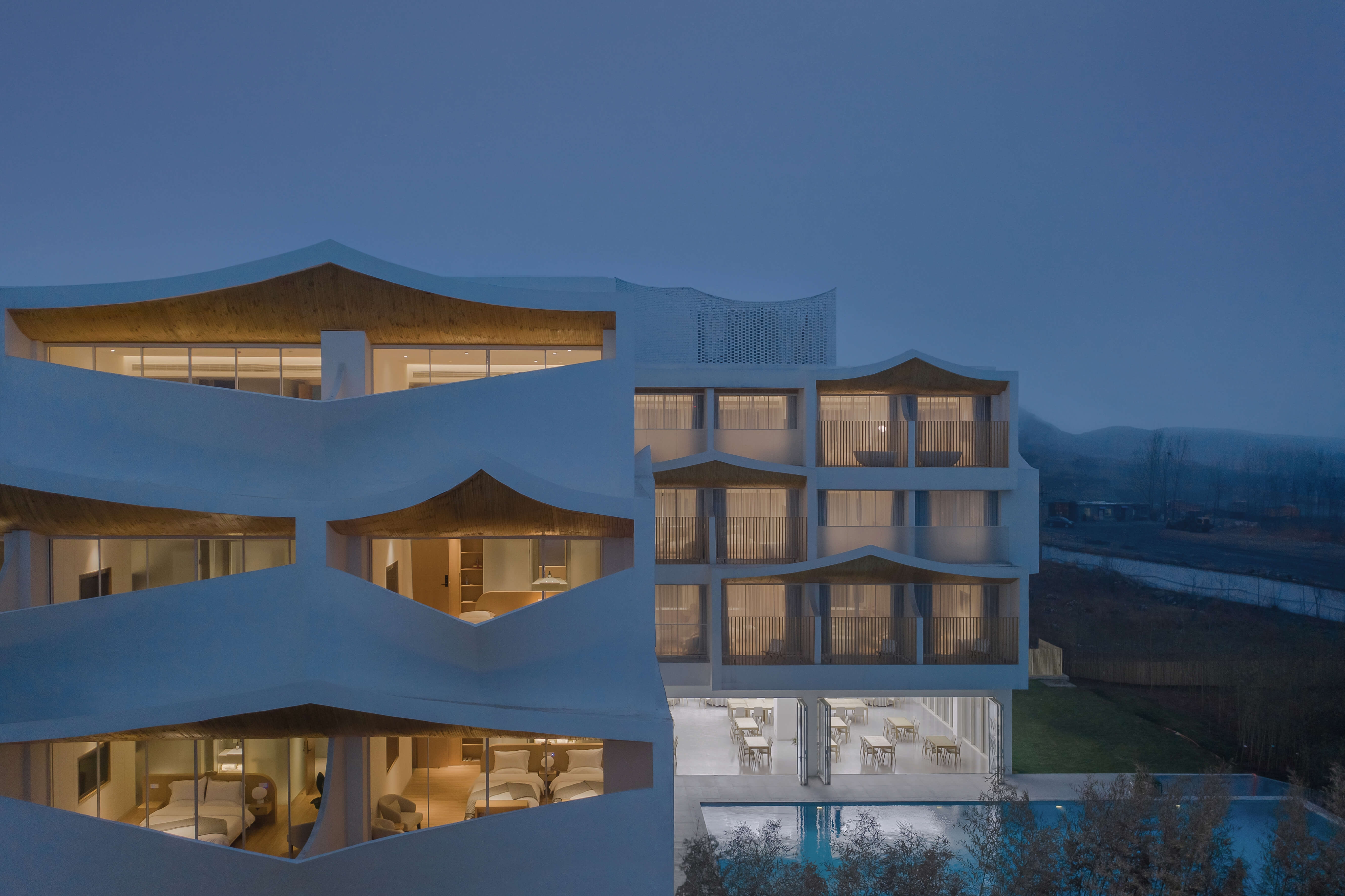 Surrounded by unfinished building site, waste land and industrial sites, this 48-room hotel and restaurant complex in a small town is not blessed with a beautiful site. The construction budget and time are also incredibly tight. Fortunately, Taihang Mountain is visible from two major sides.