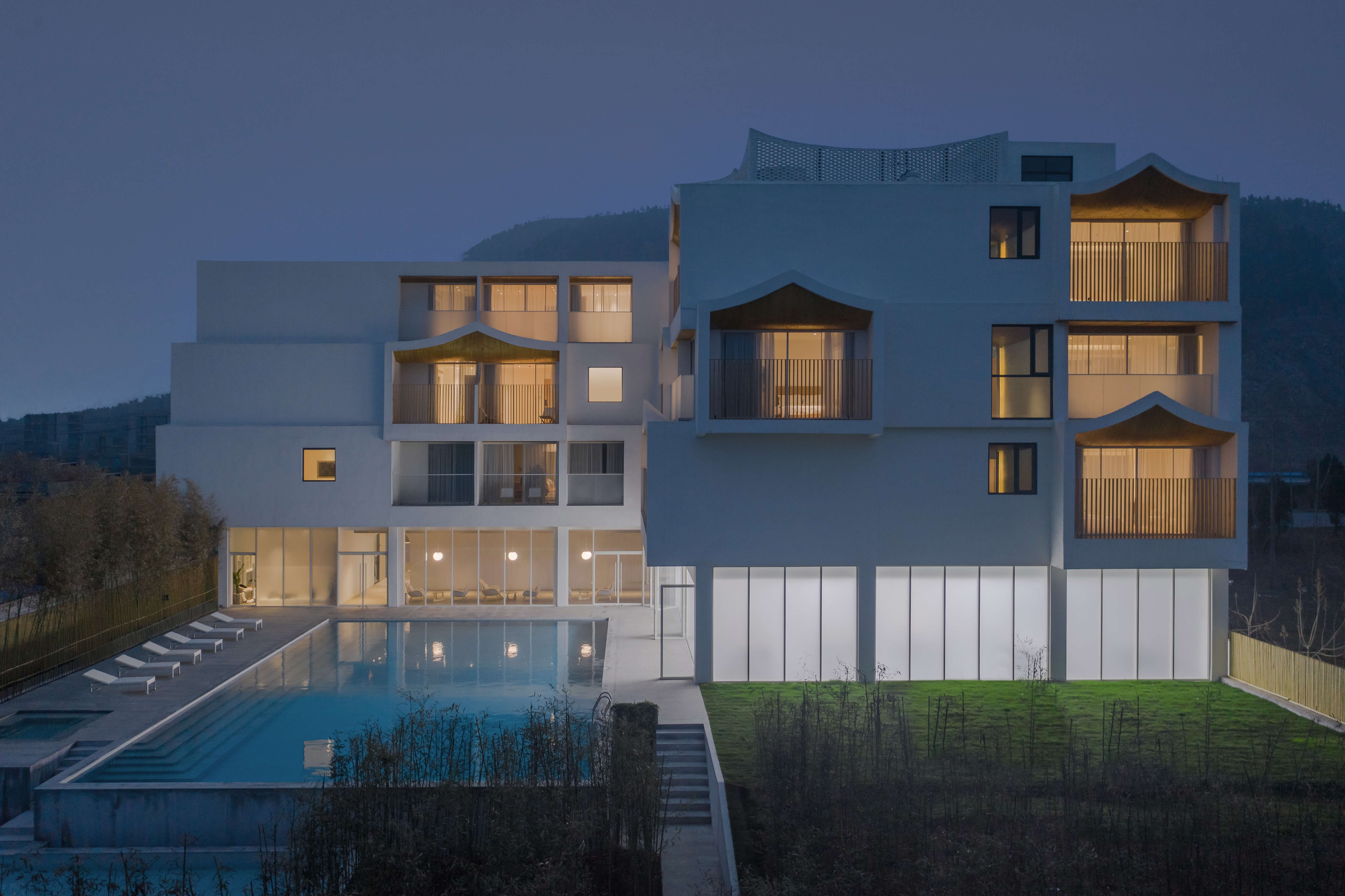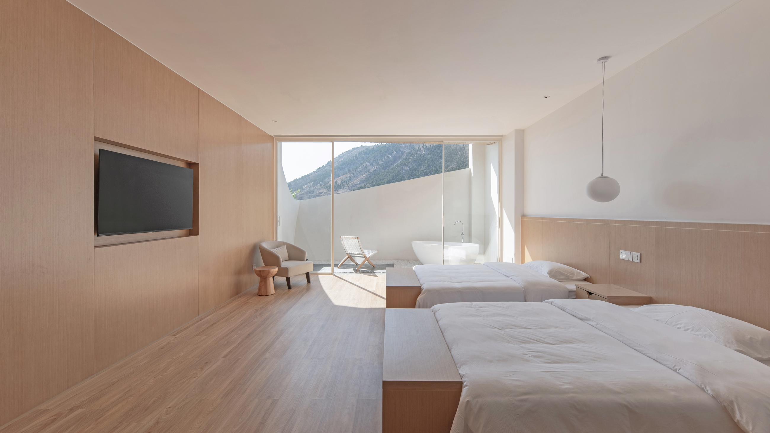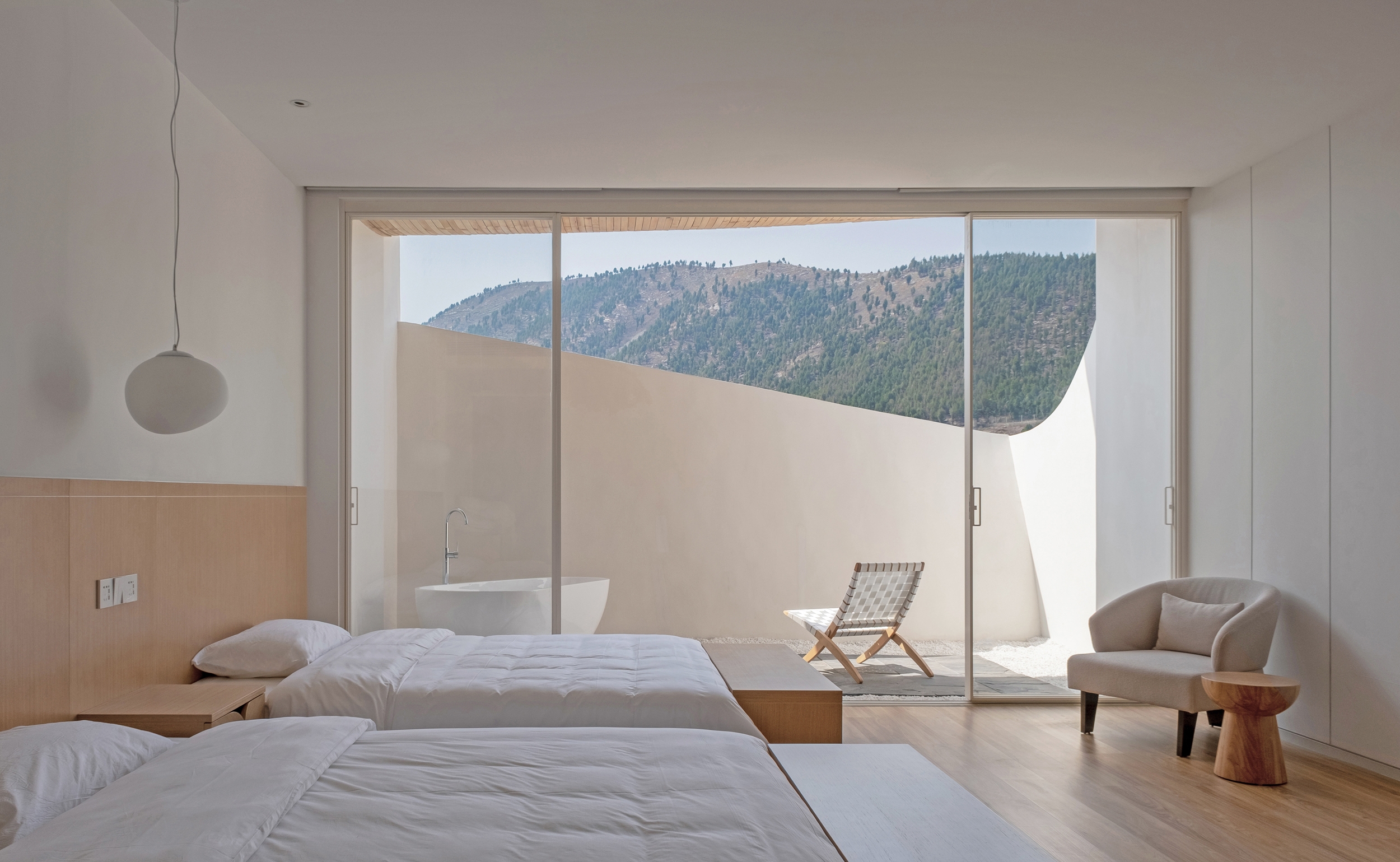 Usually a hotel room would be designed as an outward box to maximize the view. Consequently, a hotel building would be a collection of outward boxes. We rejected this conventional model and reinvented the actual experience in a typical unit: first, the exterior view below eye-level is blocked; then the opening is “lifted” or enlarged to invite more light and air; at last, the full-size glass door turned the unit into a combination of interior room and exterior micro courtyard, with a visually continuous experience of the scroll-like view of the sky and the mountain.