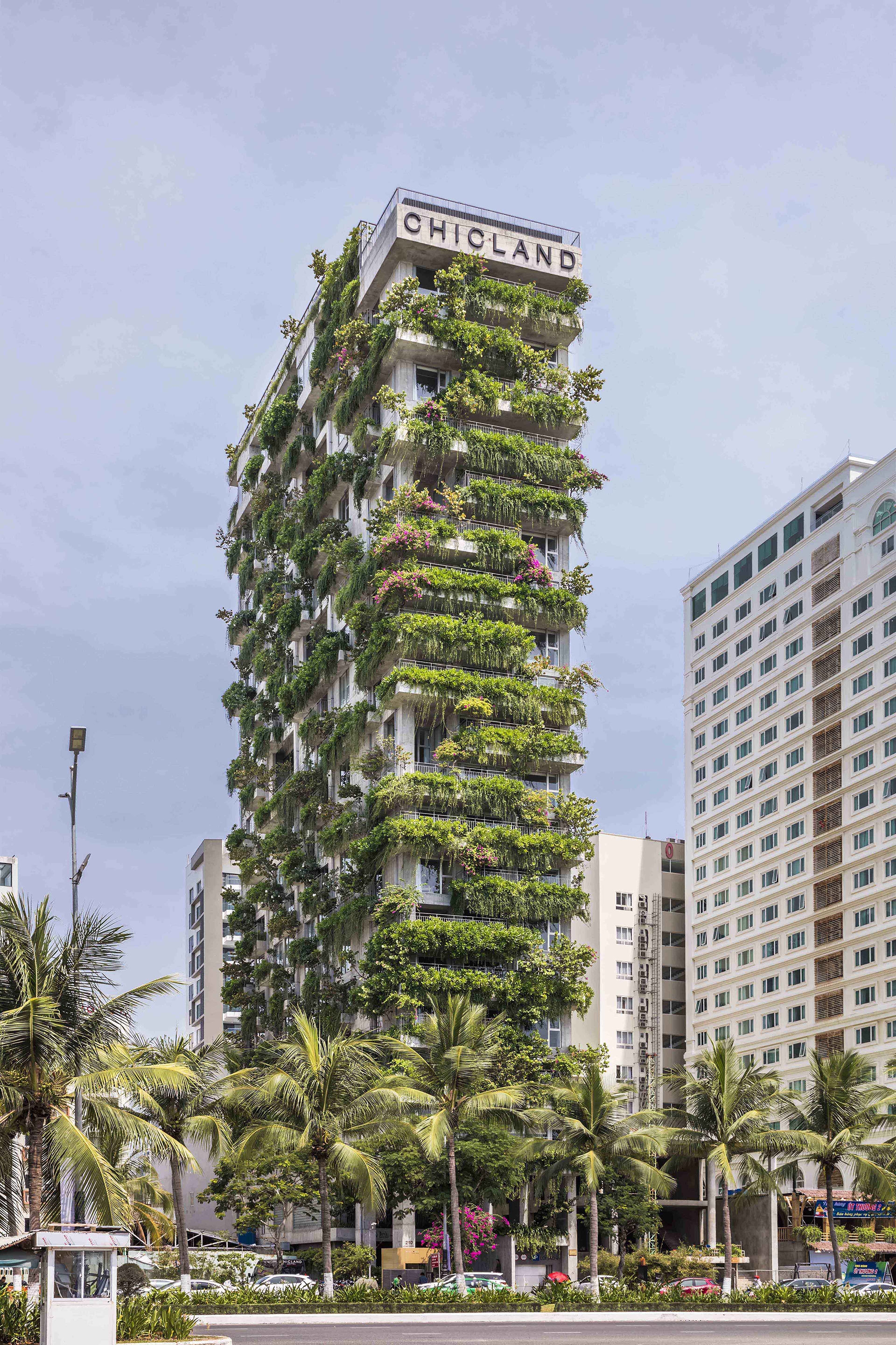 In such a context, VTN Architects’ solution was rather simple, yet elegant. On a small site of only 700 square meters, the design team’s approach was to create a structure that is vertically filled with as many plants as possible. Not only does the idea enhance the landscape of the building as well as the living quality of the visitors, but also drastically improves the area’s lack of greeneries situation. However, Danang's tropical climate meant the area experiences both strong amounts of sunlight and heavy rainfall throughout the year. Therefore, creating a vertical green façade system on a high-rise and experiencing the hefty prevailing wind of My Khe beach was not an easy challenge. Each balcony position and level had to be carefully studied to select the appropriate types of plants or soils, hence the biodiversity changes on every level.