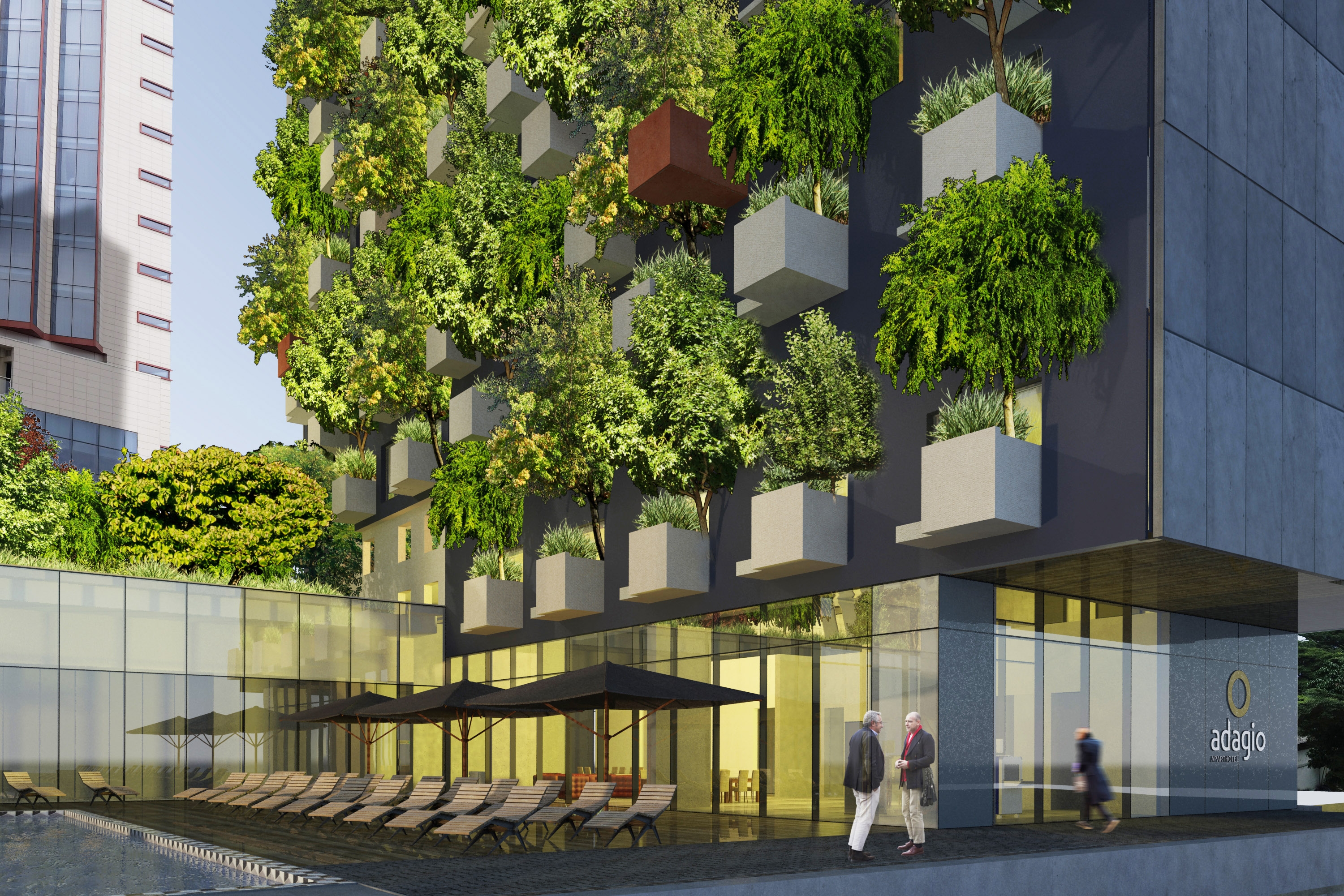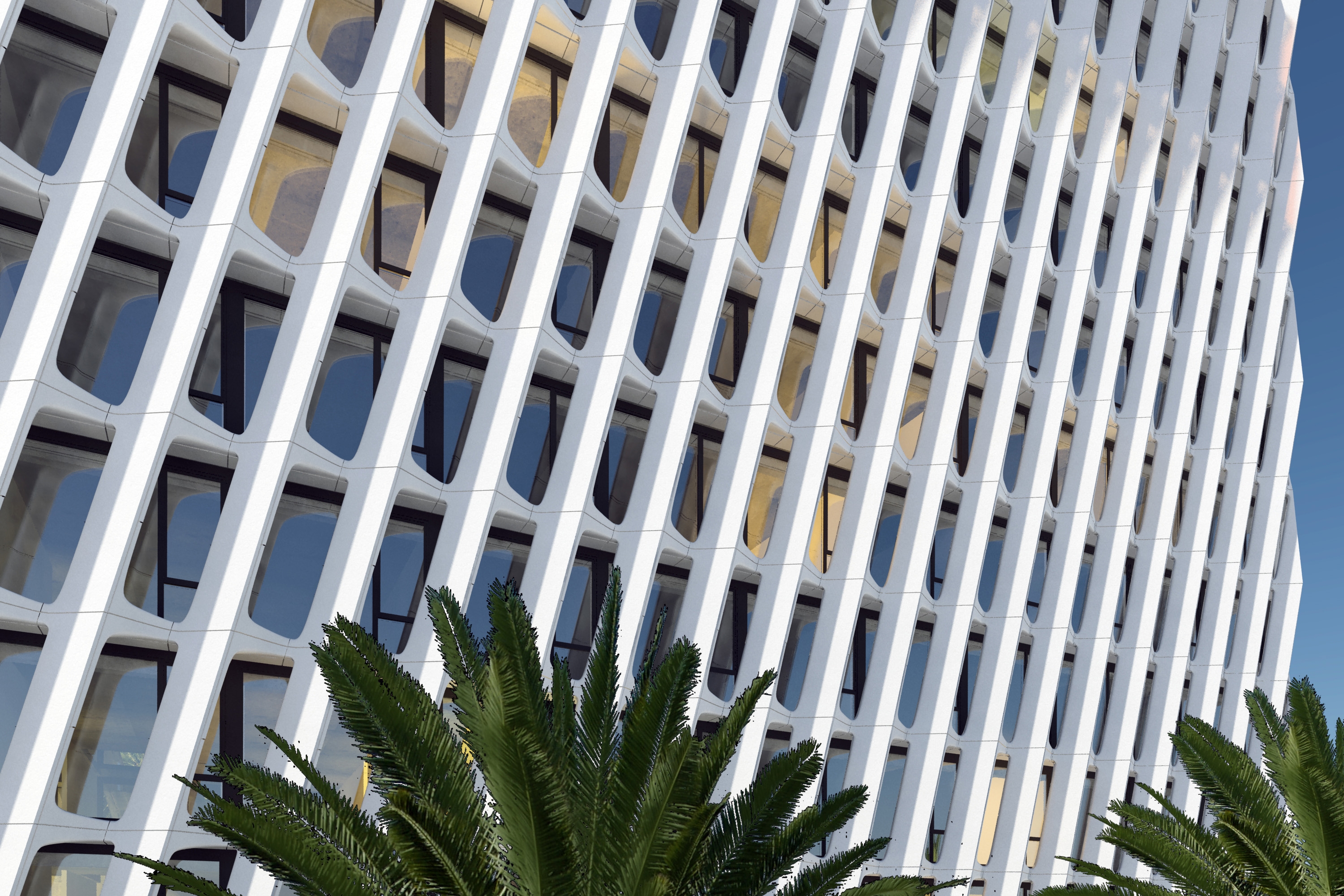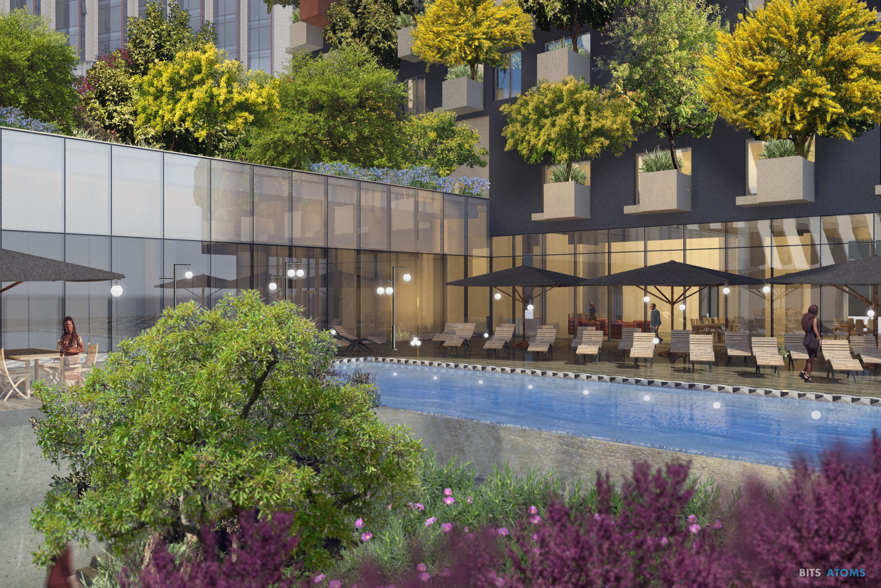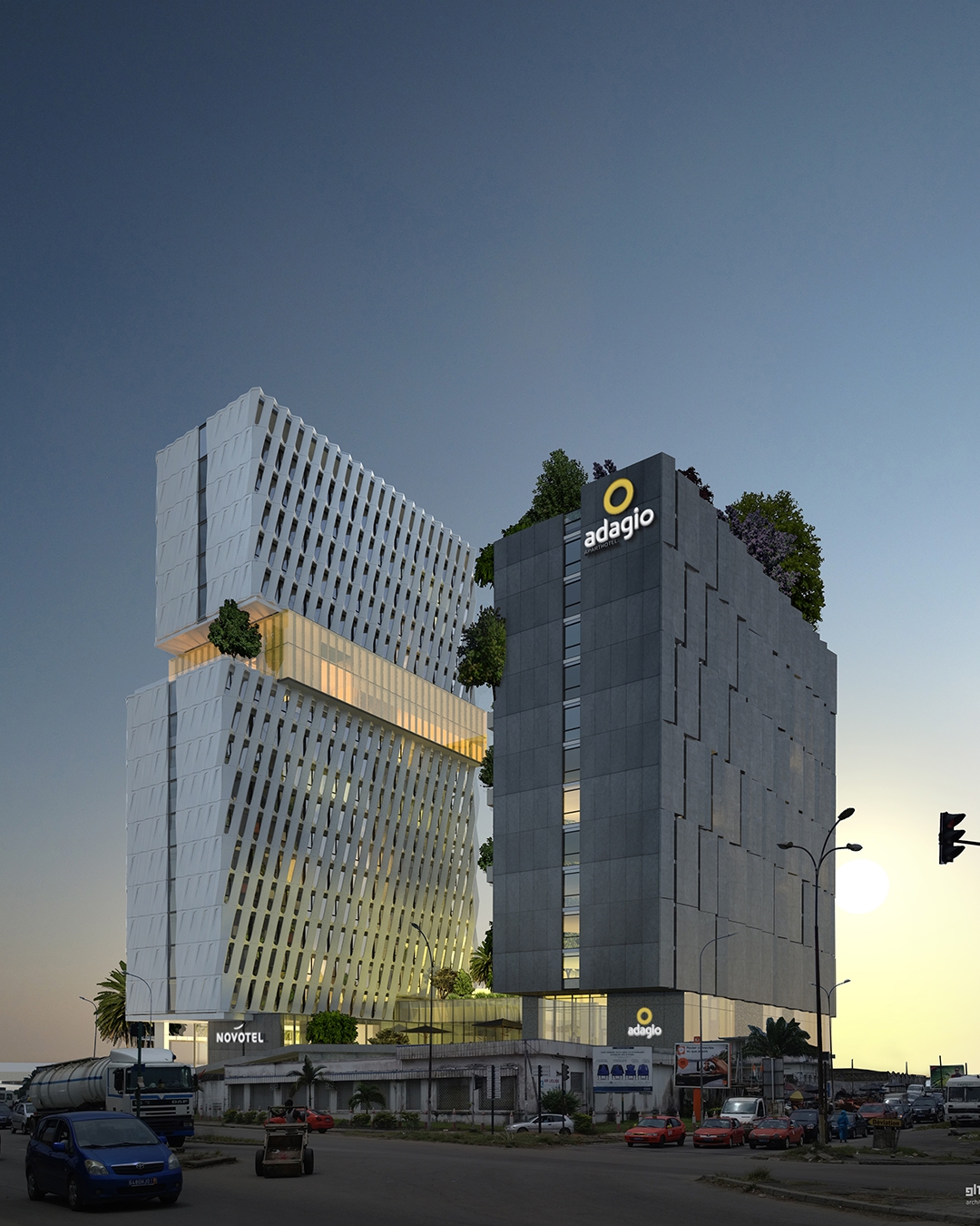 Construction is well underway for our design of Accor's new complex of hotels on the VGE Boulevard of Abidjan,Ivory Coast. Taking cue from the tilt of the city grid against that of the sun's path, Novotel features prefab shading panels that ramp up from one elevation to the next, catching the light and rendering the built masses into scaleless platonic wholes. Acting as a passive approach to temperature regulation, and saving on energy throughout the year, the sculptural silhouette also eliminates visually most of the slabs to give the building its status of an urban landmark, despite being only 18 stories. The skin is made of white ultra-high performance concrete (UHPC)and cast in molds that are cut by our 7-axis robot arm. While the Novotel is extremely mineral,the facing Adagio reads as a vast vertical forest, bursting with lush variety of native trees that extend from a shared courtyard with its pool and decks.This graft of vegetation not only muffles the bustling sounds of the city, but presents the guests with the extended choice of sea or forest.The complex presents a spectacular opposition between mineral and vegetal, thriving on Abidjan’s rich history and natural setting.