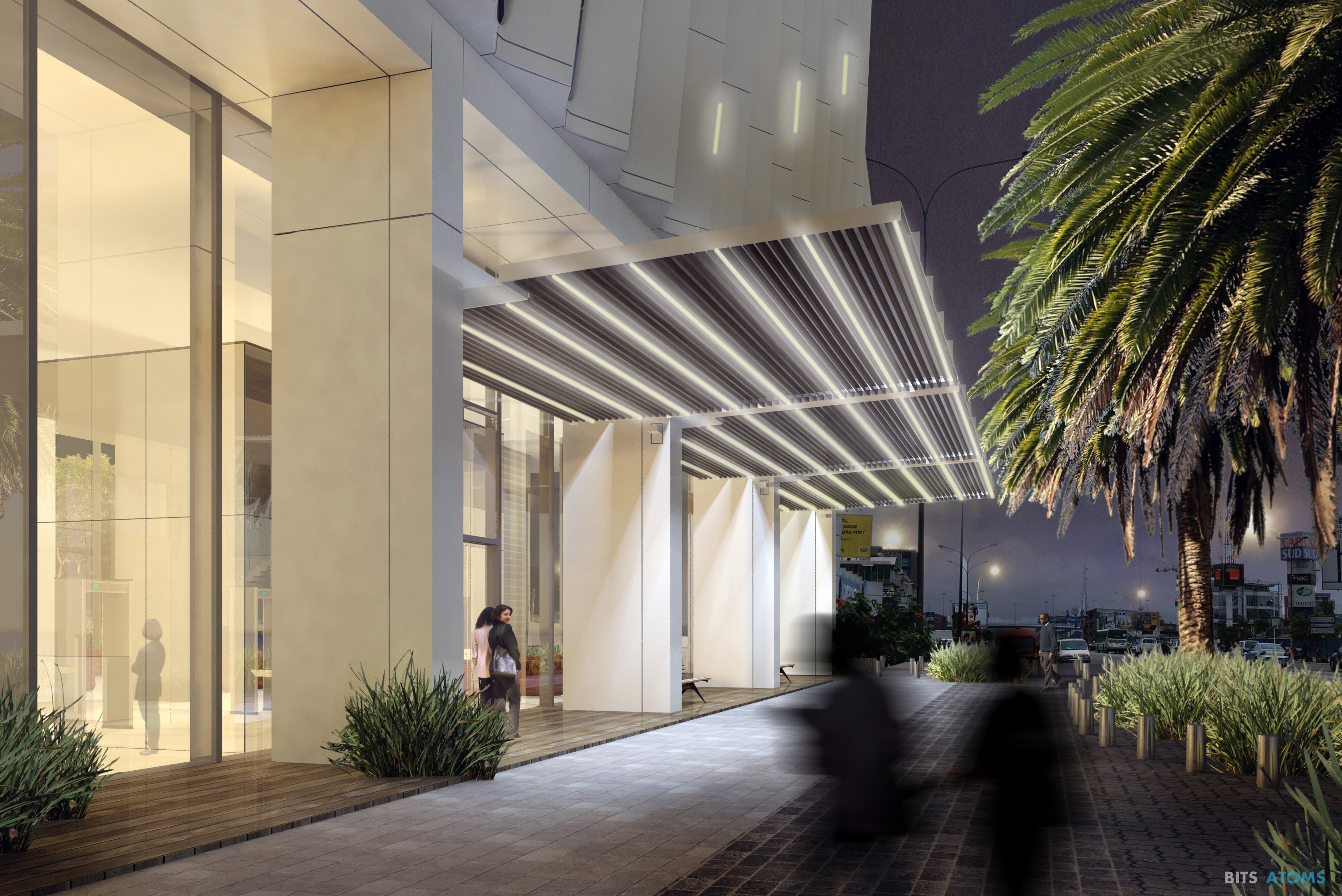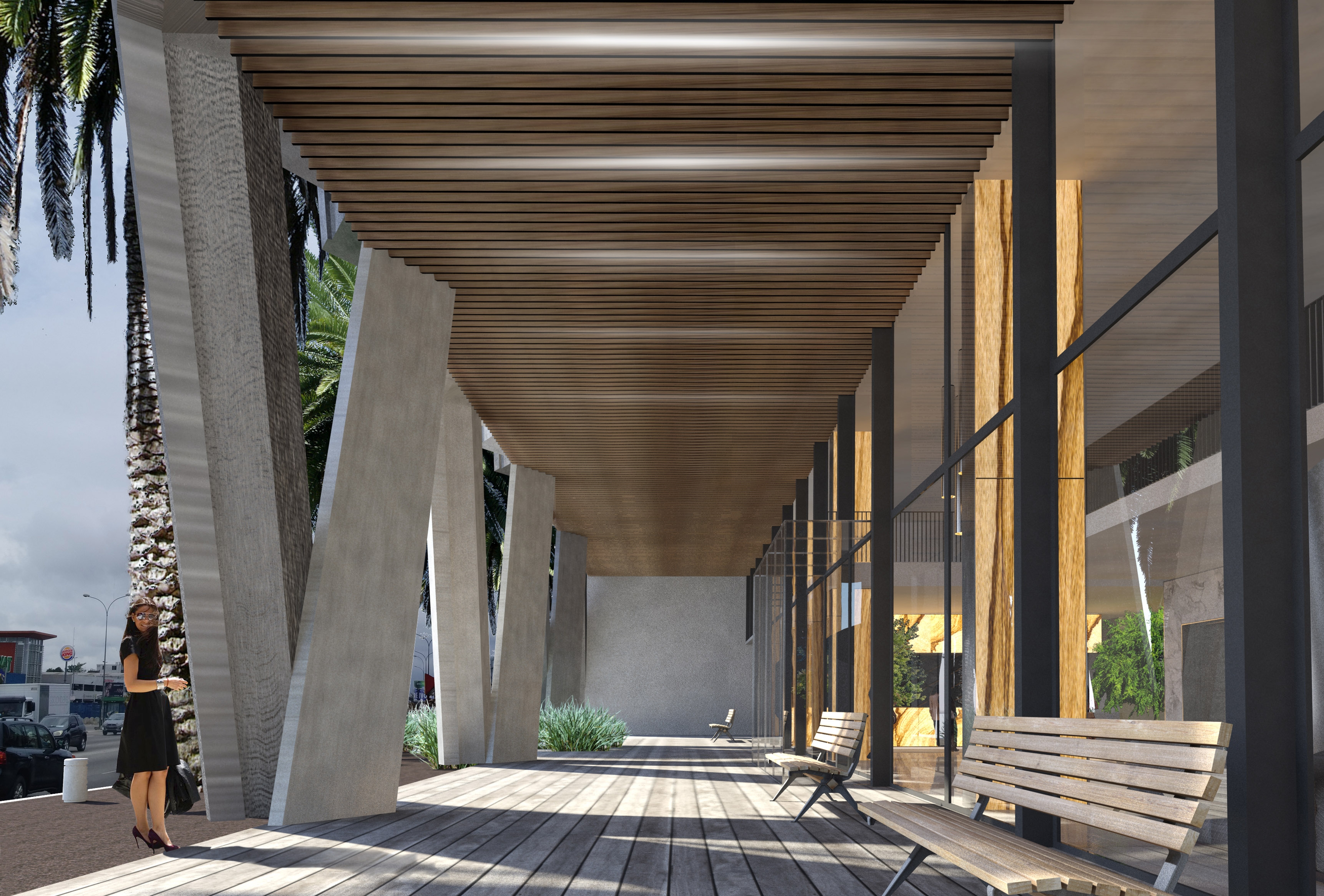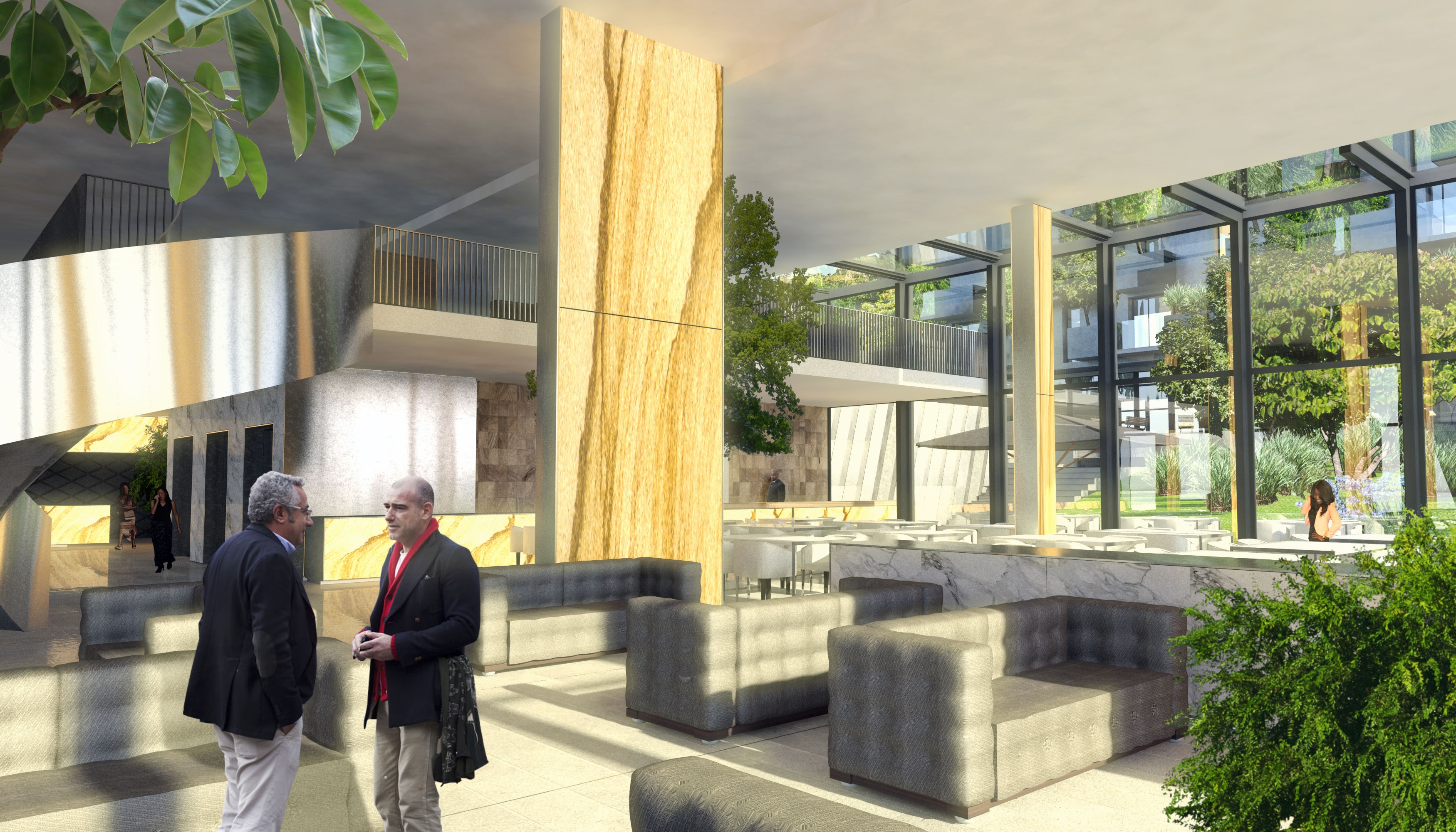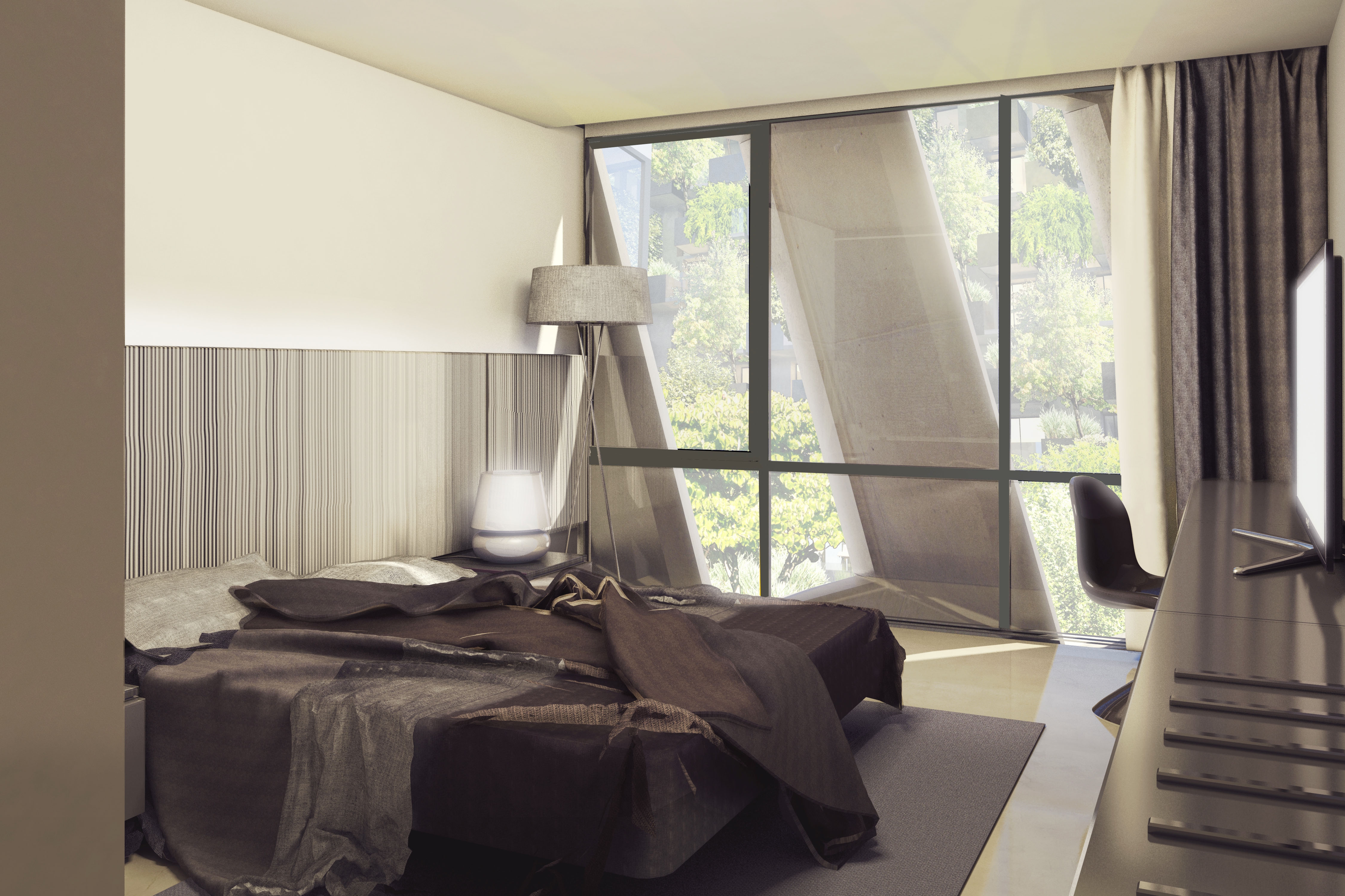 Construction is well underway for our design of Accor's new complex of hotels on the VGE Boulevard of Abidjan,Ivory Coast. Taking cue from the tilt of the city grid against that of the sun's path, Novotel features prefab shading panels that ramp up from one elevation to the next, catching the light and rendering the built masses into scaleless platonic wholes. Acting as a passive approach to temperature regulation, and saving on energy throughout the year, the sculptural silhouette also eliminates visually most of the slabs to give the building its status of an urban landmark, despite being only 18 stories. The skin is made of white ultra-high performance concrete (UHPC)and cast in molds that are cut by our 7-axis robot arm. While the Novotel is extremely mineral,the facing Adagio reads as a vast vertical forest, bursting with lush variety of native trees that extend from a shared courtyard with its pool and decks.This graft of vegetation not only muffles the bustling sounds of the city, but presents the guests with the extended choice of sea or forest.The complex presents a spectacular opposition between mineral and vegetal, thriving on Abidjan’s rich history and natural setting.