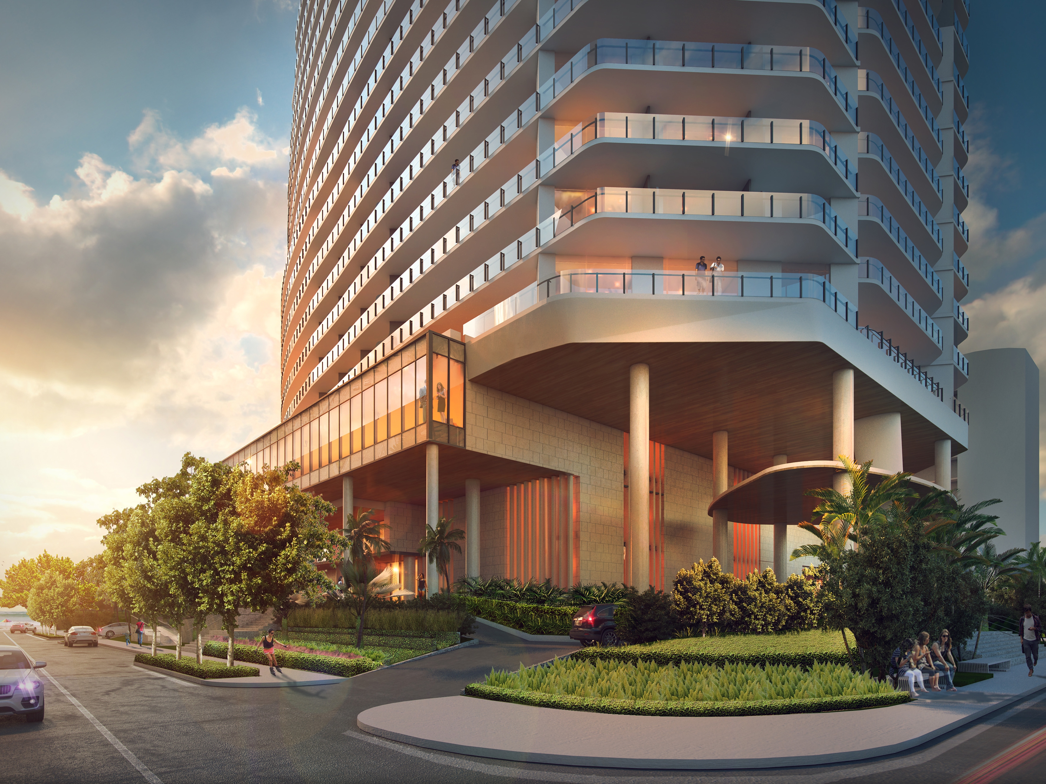 The design originates from its relationship with the sea. Its unique elements aspire to fuse comfort, space, and a sense of place with a big dose of character. Its shape resembles that of a ship, a narrow front with a broader back and curvilinear edges that allow for strong winds and gentle moist breezes to wrap around the structure and flow smoothly from the ocean to the bay. Positioned adjacent to some of the most renowned deep-water marinas in the United States, it is designed for a luxurious yachting lifestyle.