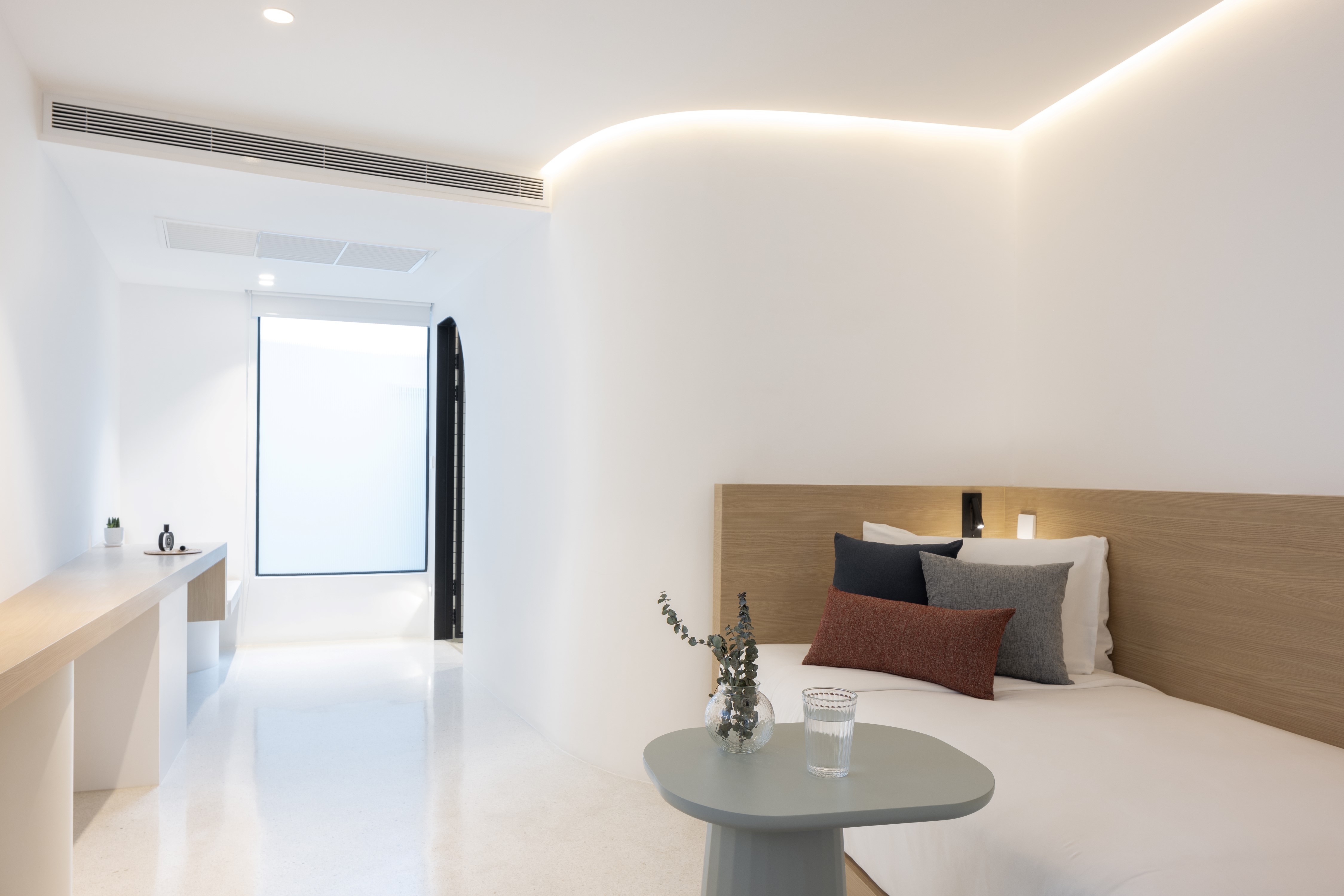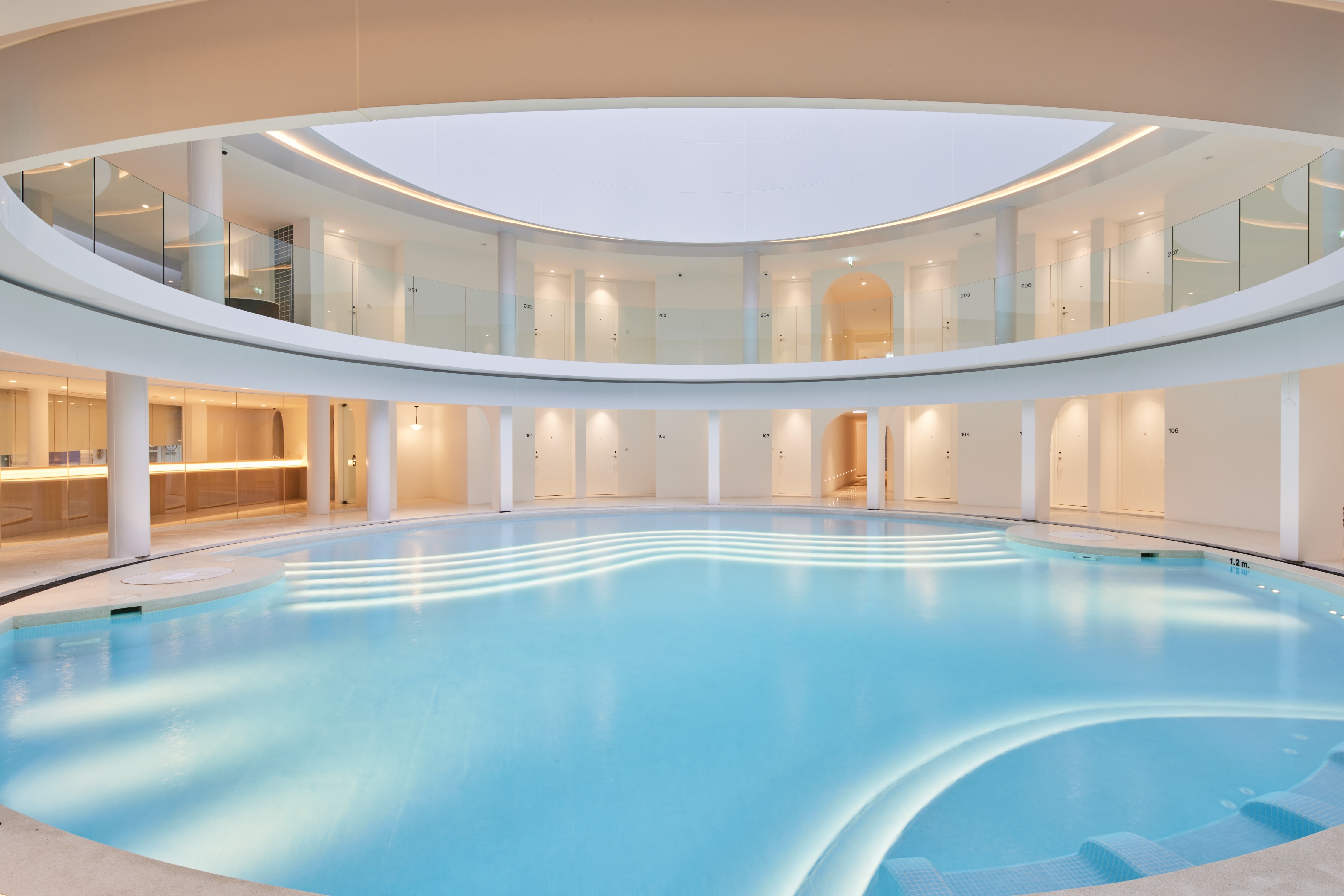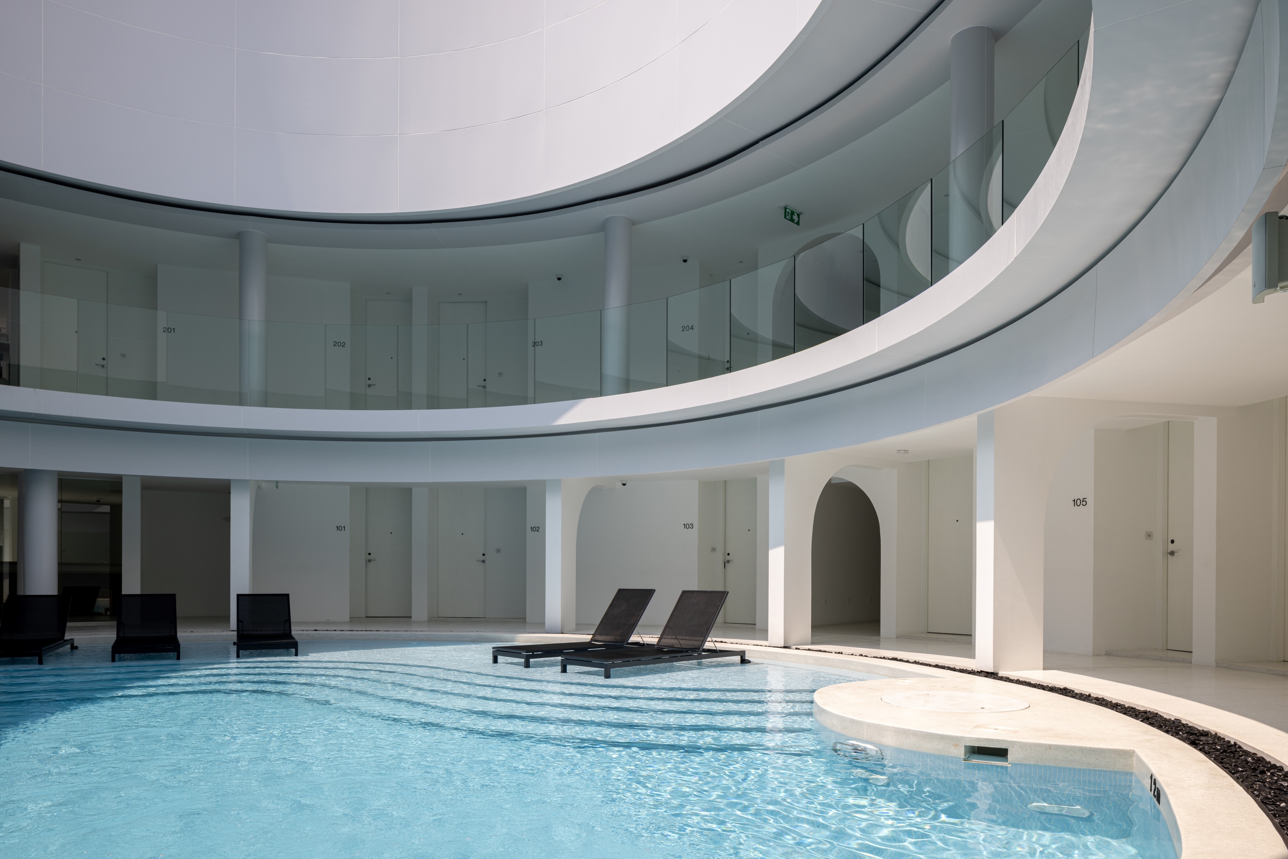 Since the site is in an area without natural scenery, the team used the pool, paired with an open ceiling, to create a picturesque view. Natural lighting and shadows at different times of the day, or in different weather conditions, give the hotel an ever-changing look, and the glass railings allow the guests to enjoy the view without obstruction. The design circles around round shapes and curves. Using a white palette, the beauty of the architectural forms can be further accentuated by the shadows and light.