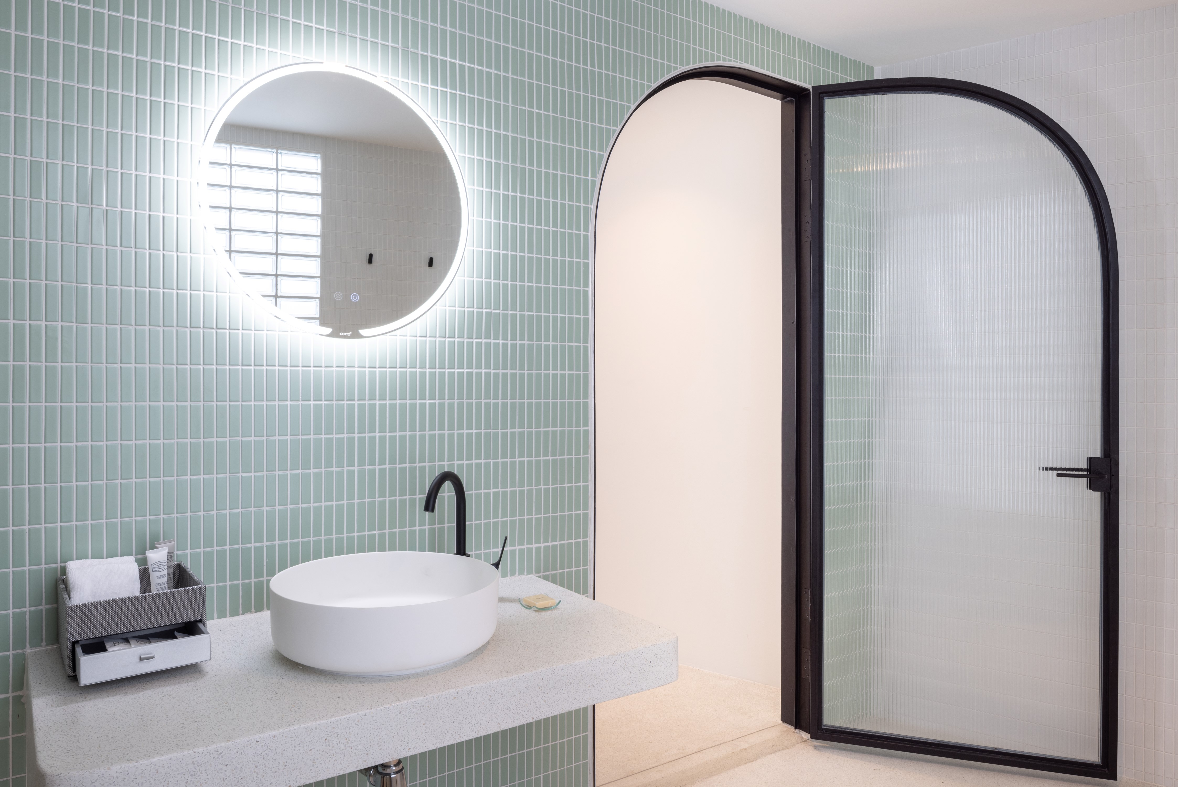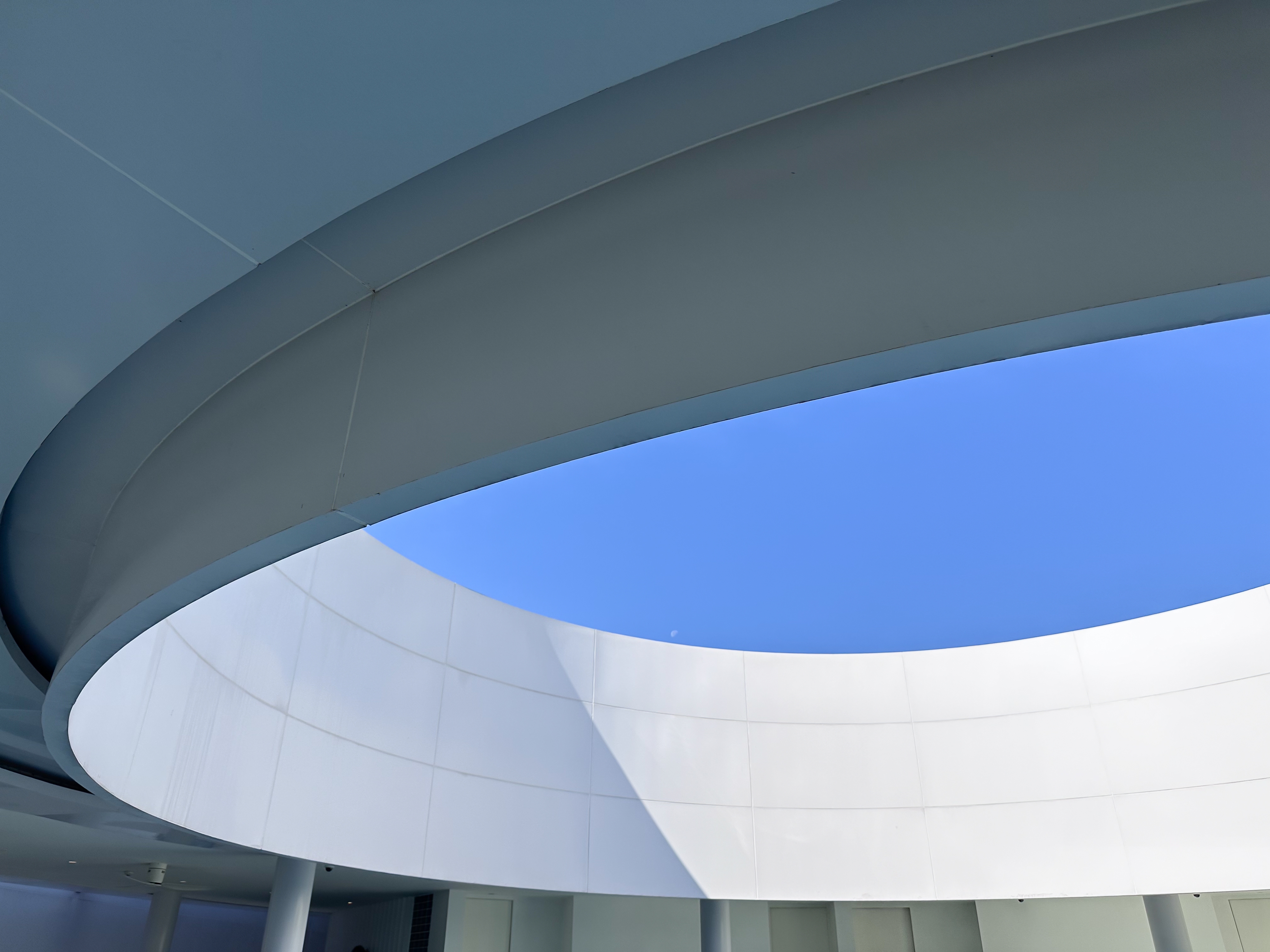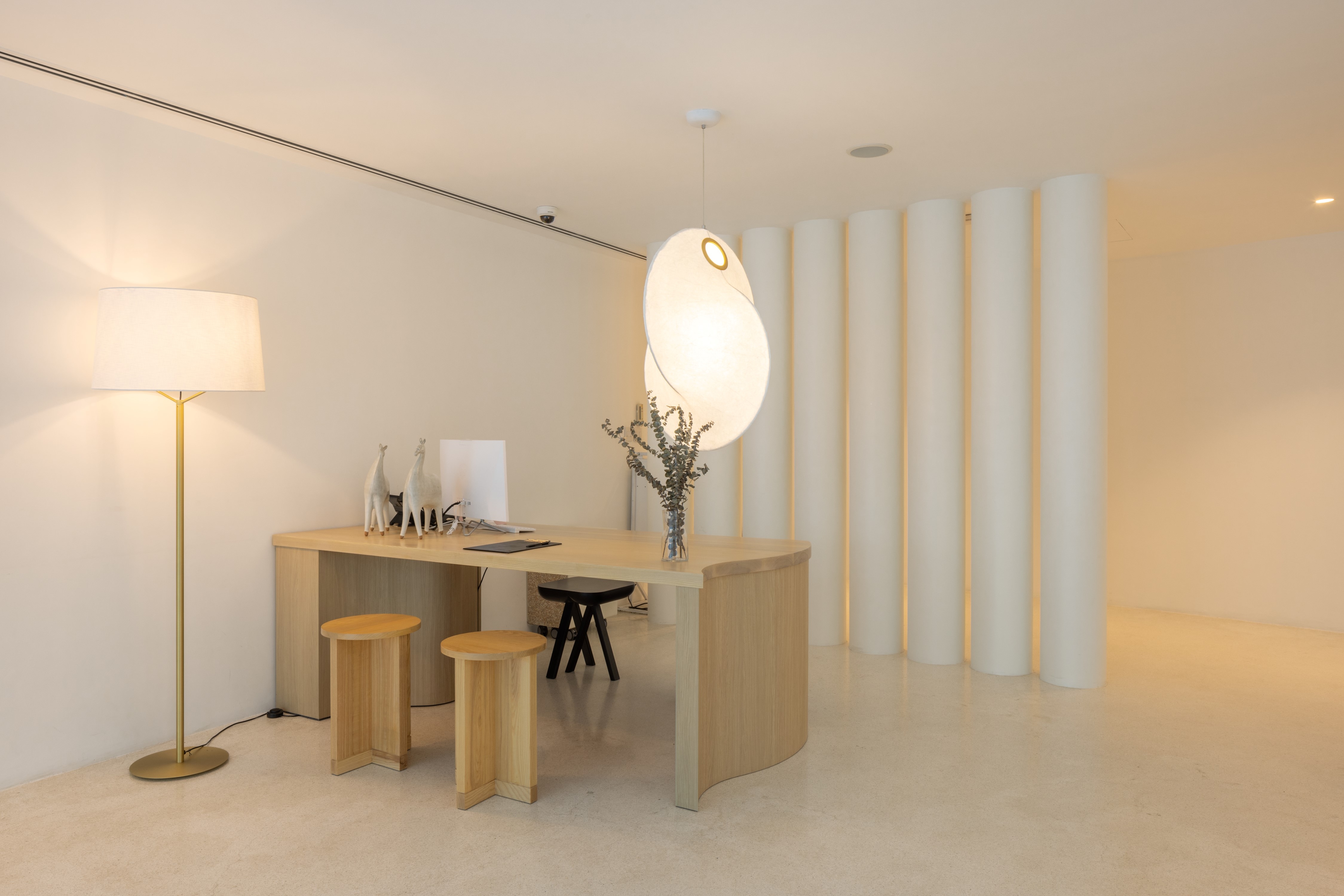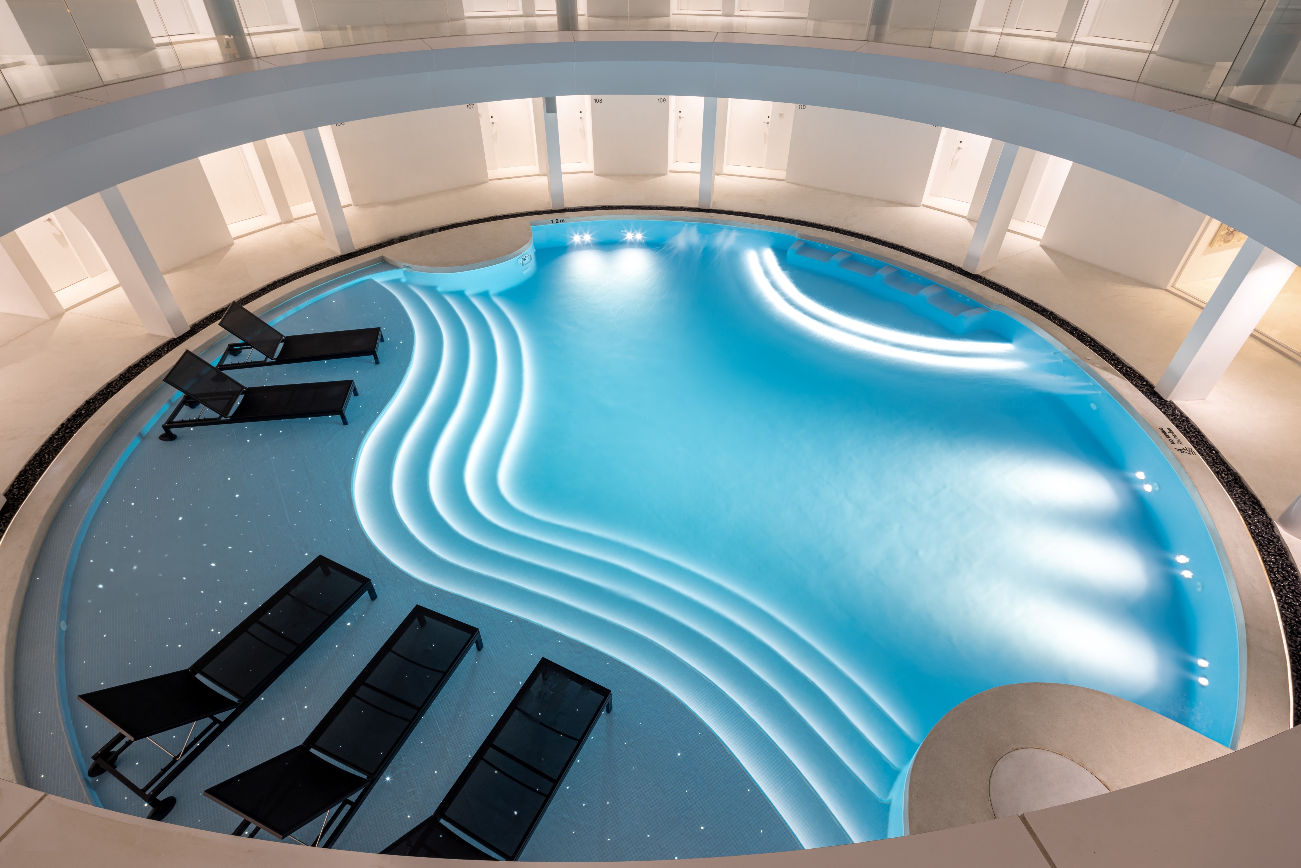 Since the site is in an area without natural scenery, the team used the pool, paired with an open ceiling, to create a picturesque view. Natural lighting and shadows at different times of the day, or in different weather conditions, give the hotel an ever-changing look, and the glass railings allow the guests to enjoy the view without obstruction. The design circles around round shapes and curves. Using a white palette, the beauty of the architectural forms can be further accentuated by the shadows and light.