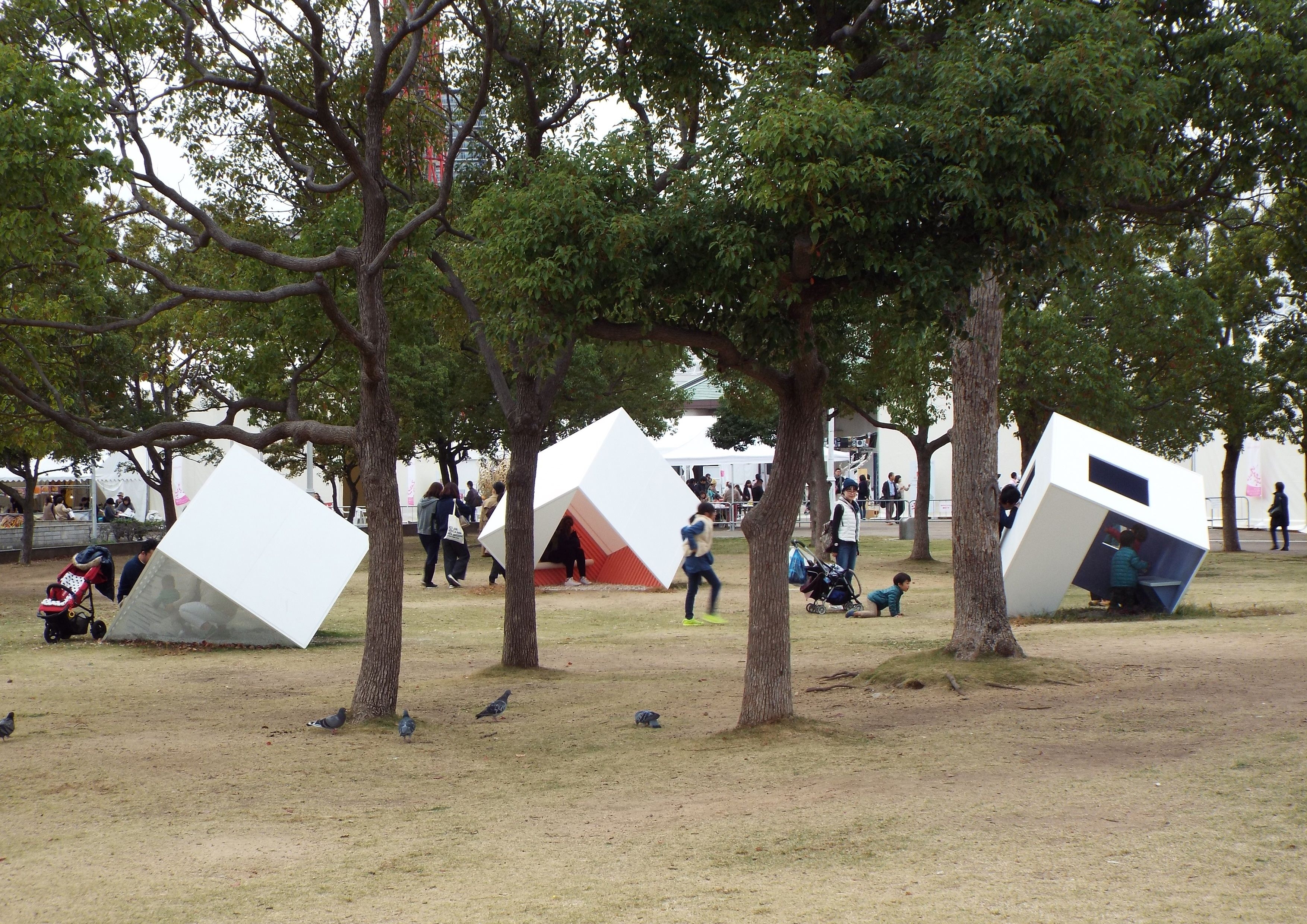 Playground equipment for children, public furniture, art objects, meditation rooms, small rest spaces, waiting rooms. “Three Cubes in the Forest“ are the micro-architectures with the various characteristics and functions. Three Cubes can be easily transported by a truck and can be installed.