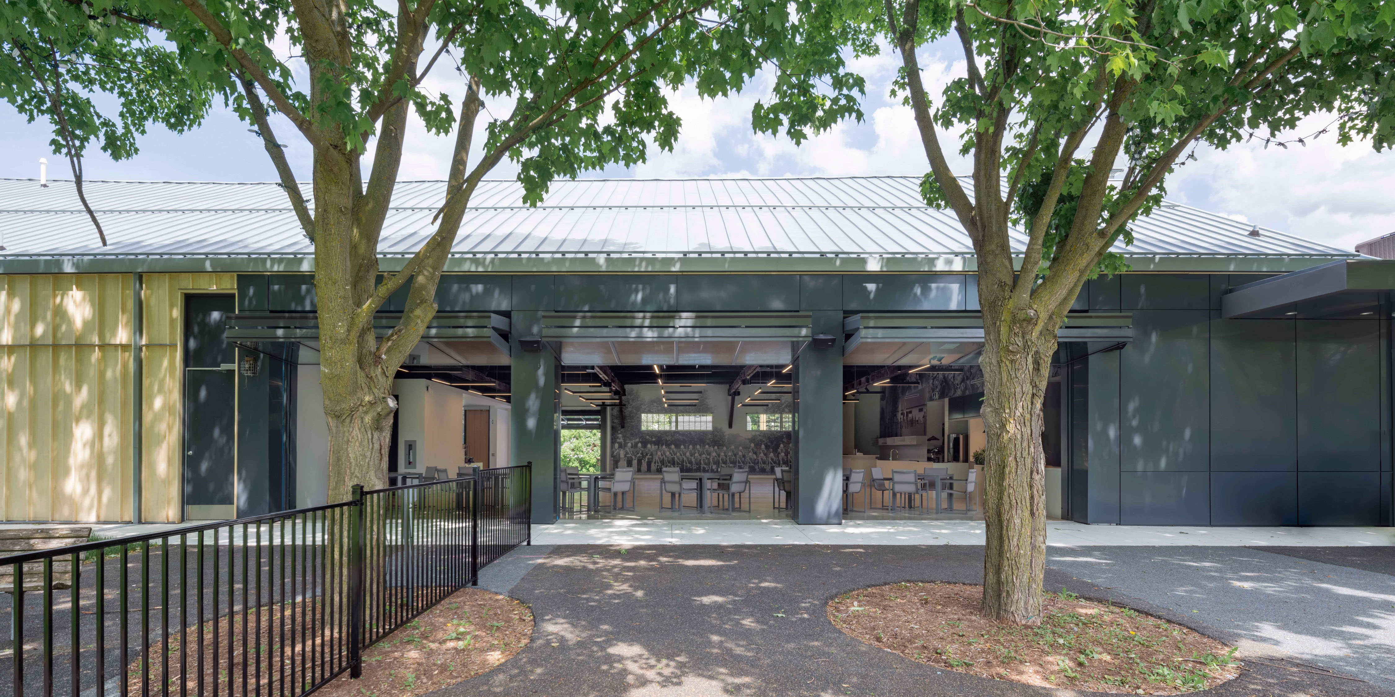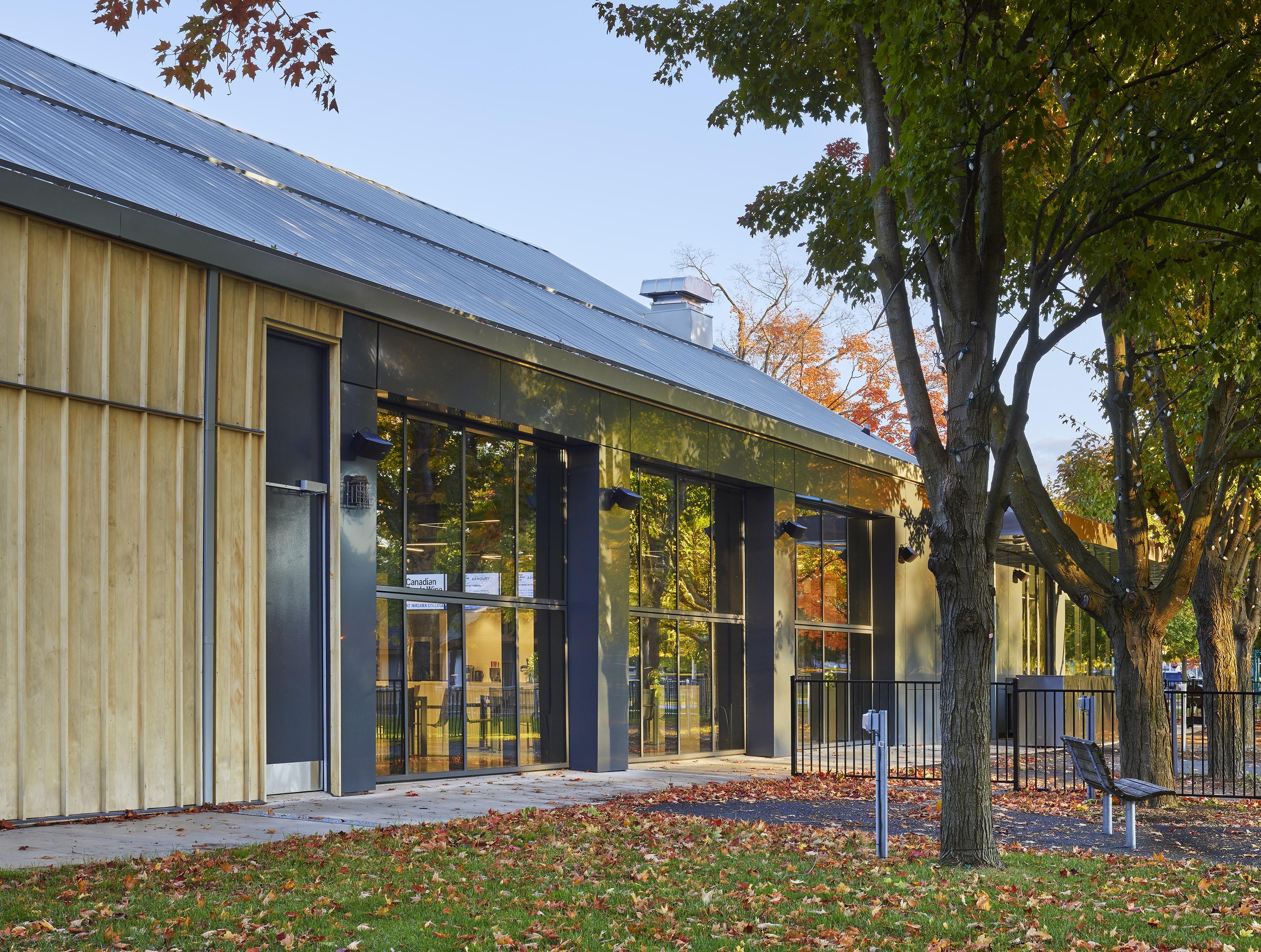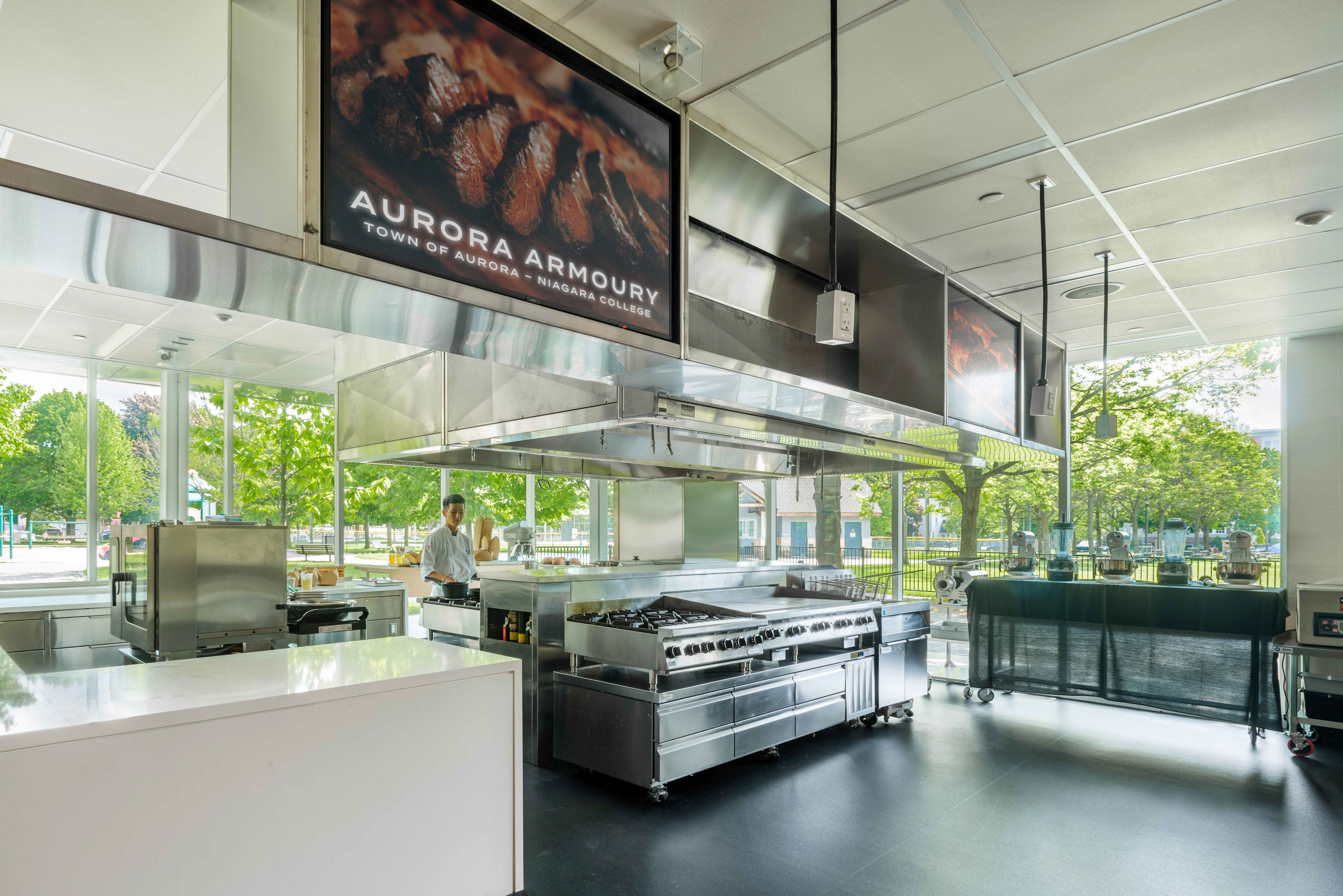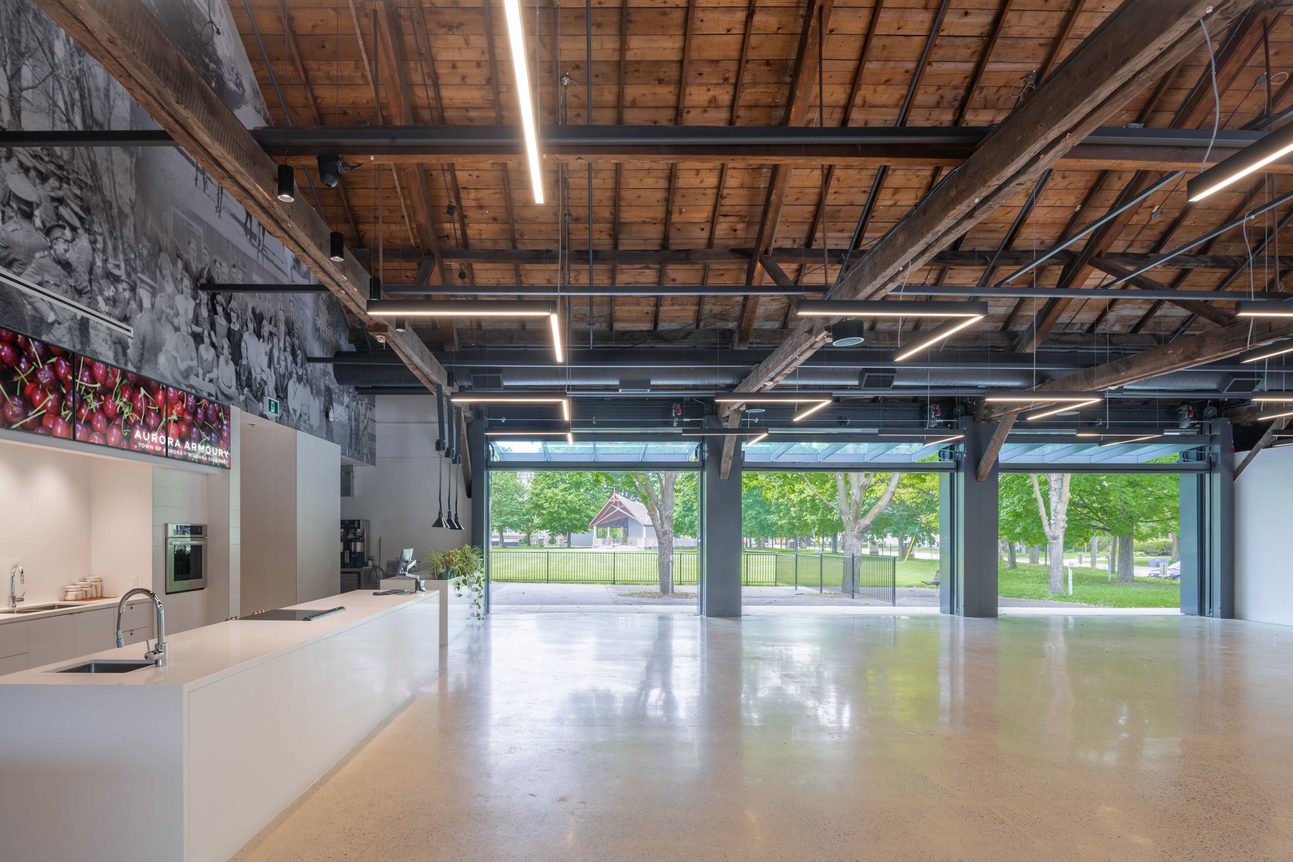 Located in the heart of Aurora, Ontario, the Aurora Armoury Canadian Food & Wine Institute (CFWI) is a revitalized culinary and community hub. Originally built in 1874 as a drill shed for the Department of National Defence, the restoration of the designated Canadian Federal Heritage Building was realized through an innovative partnership between the Town of Aurora and Niagara College. Envisioned as an outpost location for the Niagara College CFWI, the Armoury is a space for post-secondary culinary instruction, and a venue for general interest courses and community events. Led by esteemed Toronto chef Soohyeong Lee, the building features an interactive demonstration kitchen with a 10-foot-wide chef’s table that functions as a culinary theatre. The kitchen opens onto a 200-person event space, which celebrates the Armoury’s original Agrarian-style post-and-beam construction and refurbished terrazzo floor. The building’s design incorporates 48-foot wide, full height automatic bifold doors, that embrace an indoor-outdoor dining experience rooted in the richness of the surrounding Town Park.