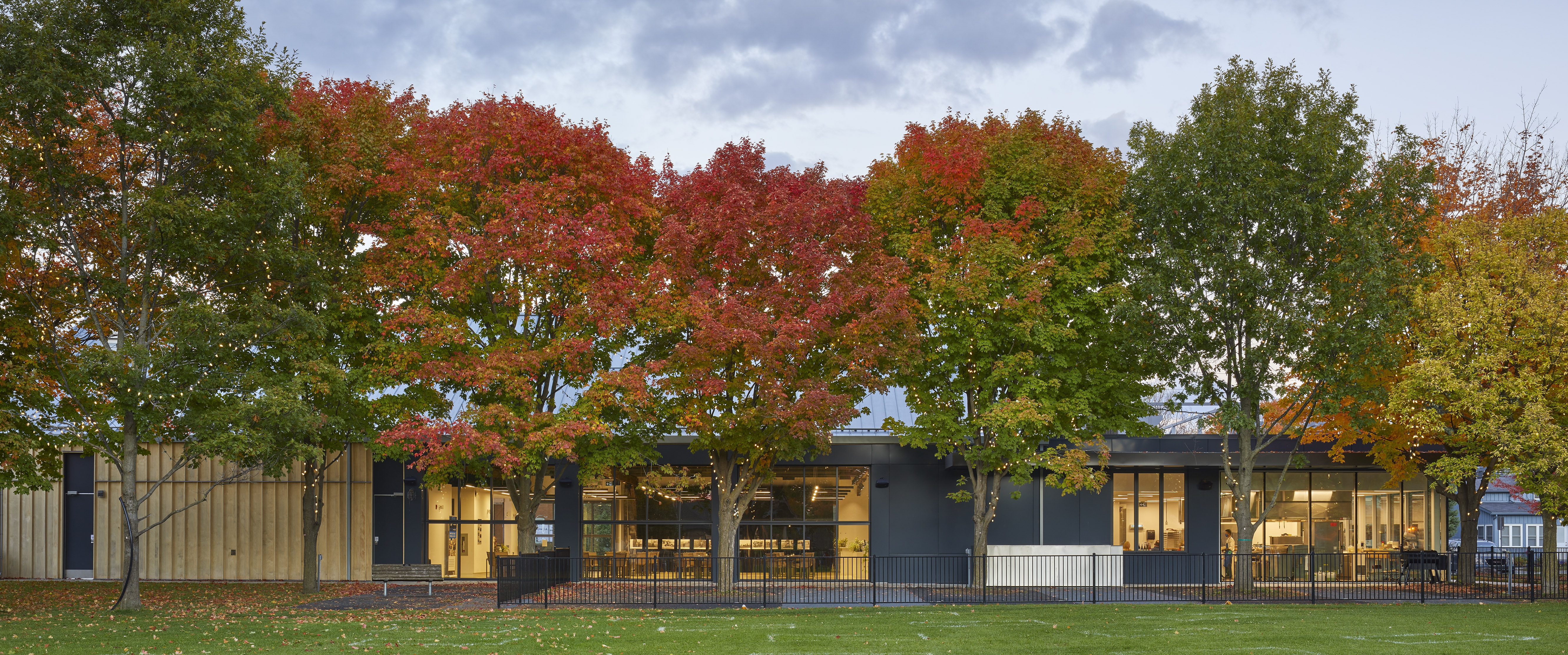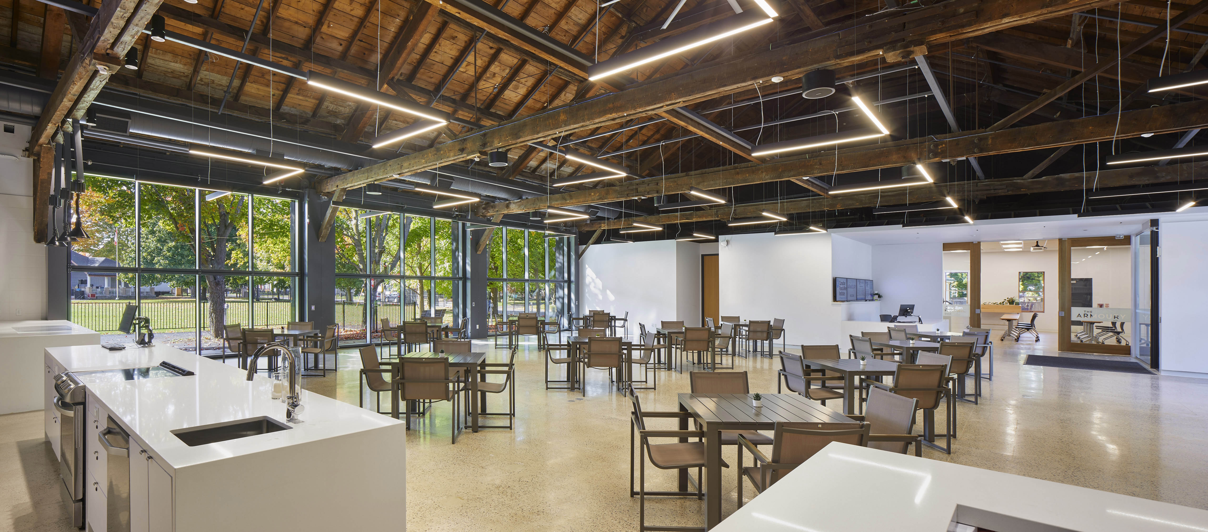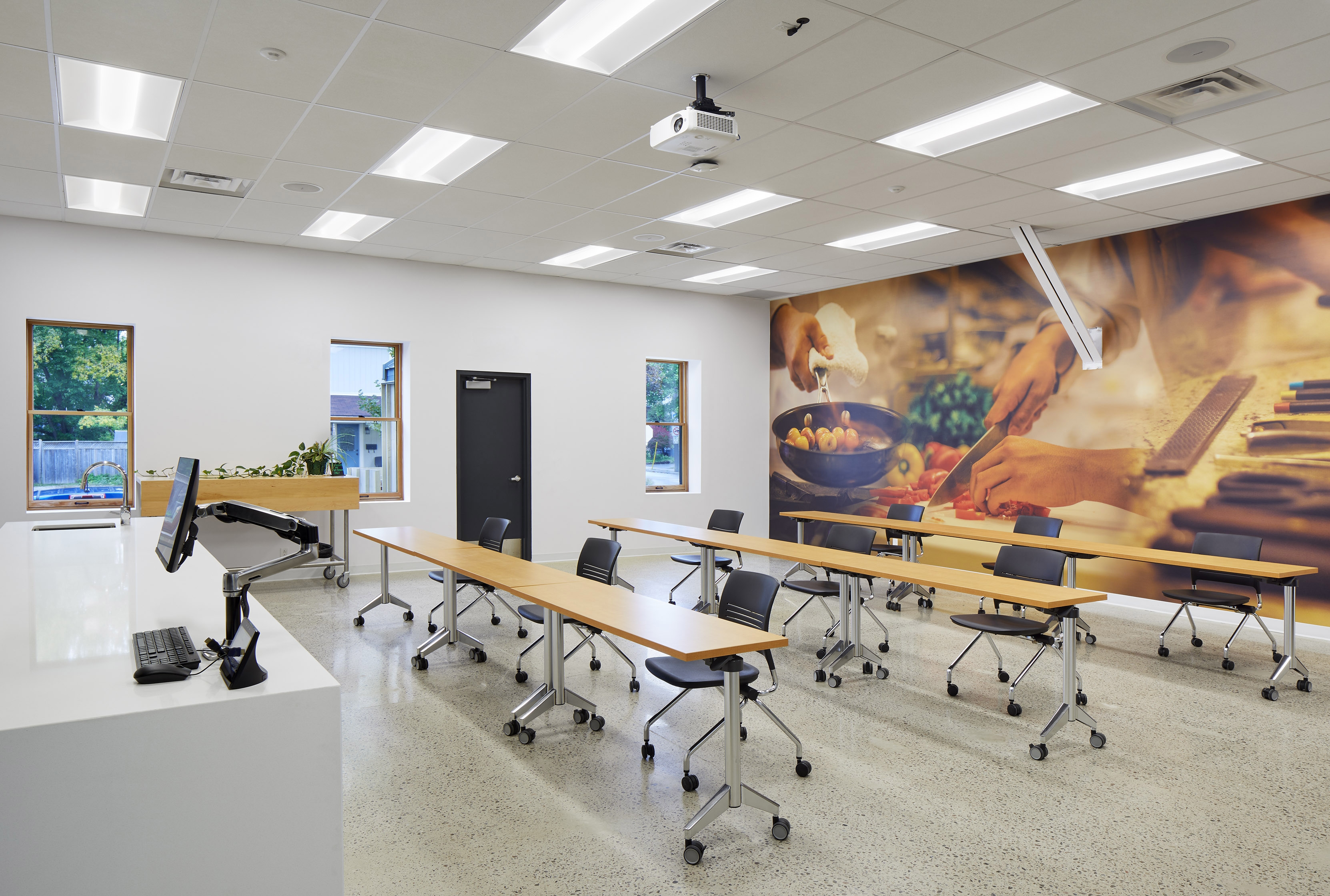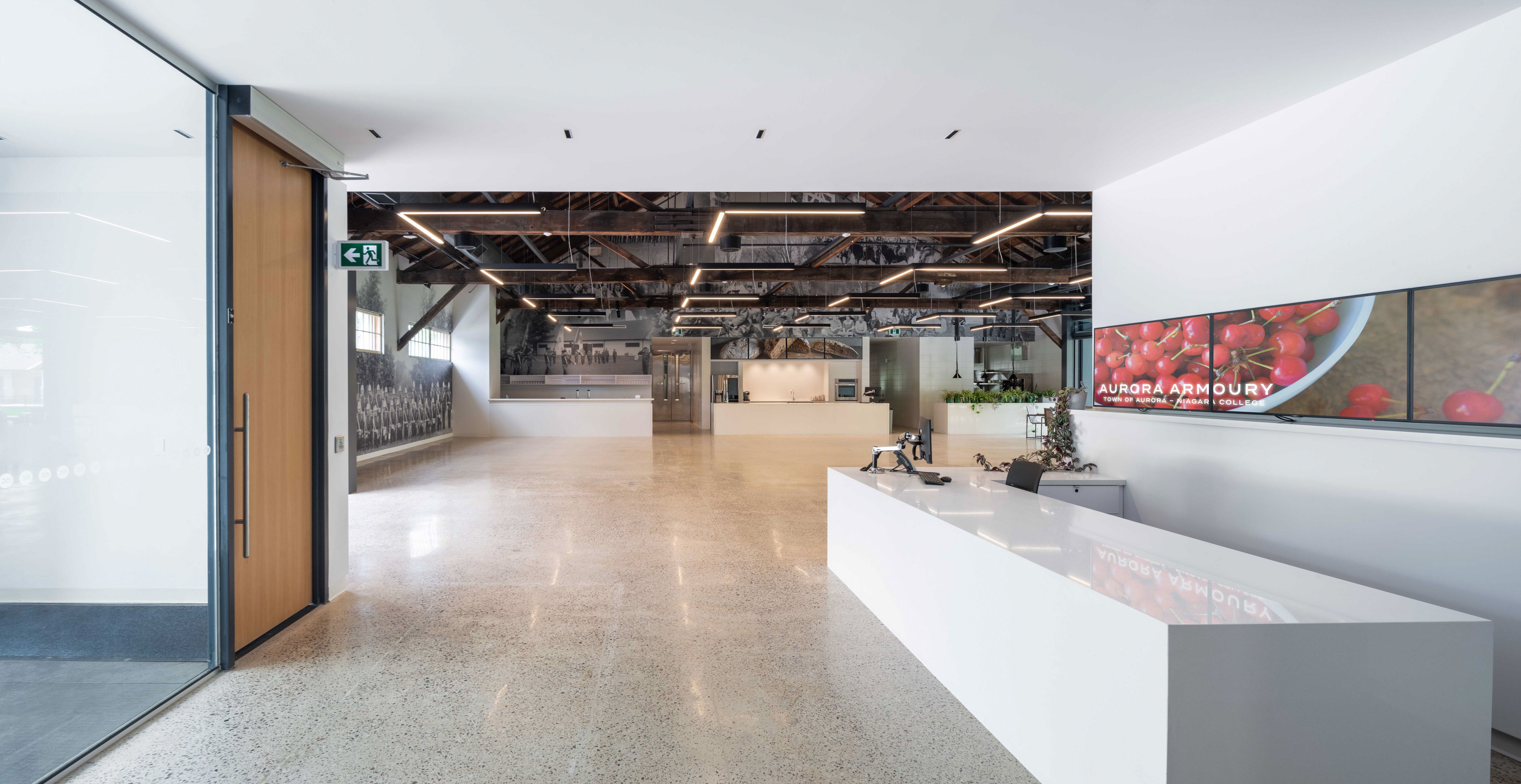 Located in the heart of Aurora, Ontario, the Aurora Armoury Canadian Food & Wine Institute (CFWI) is a revitalized culinary and community hub. Originally built in 1874 as a drill shed for the Department of National Defence, the restoration of the designated Canadian Federal Heritage Building was realized through an innovative partnership between the Town of Aurora and Niagara College. Envisioned as an outpost location for the Niagara College CFWI, the Armoury is a space for post-secondary culinary instruction, and a venue for general interest courses and community events. Led by esteemed Toronto chef Soohyeong Lee, the building features an interactive demonstration kitchen with a 10-foot-wide chef’s table that functions as a culinary theatre. The kitchen opens onto a 200-person event space, which celebrates the Armoury’s original Agrarian-style post-and-beam construction and refurbished terrazzo floor. The building’s design incorporates 48-foot wide, full height automatic bifold doors, that embrace an indoor-outdoor dining experience rooted in the richness of the surrounding Town Park.