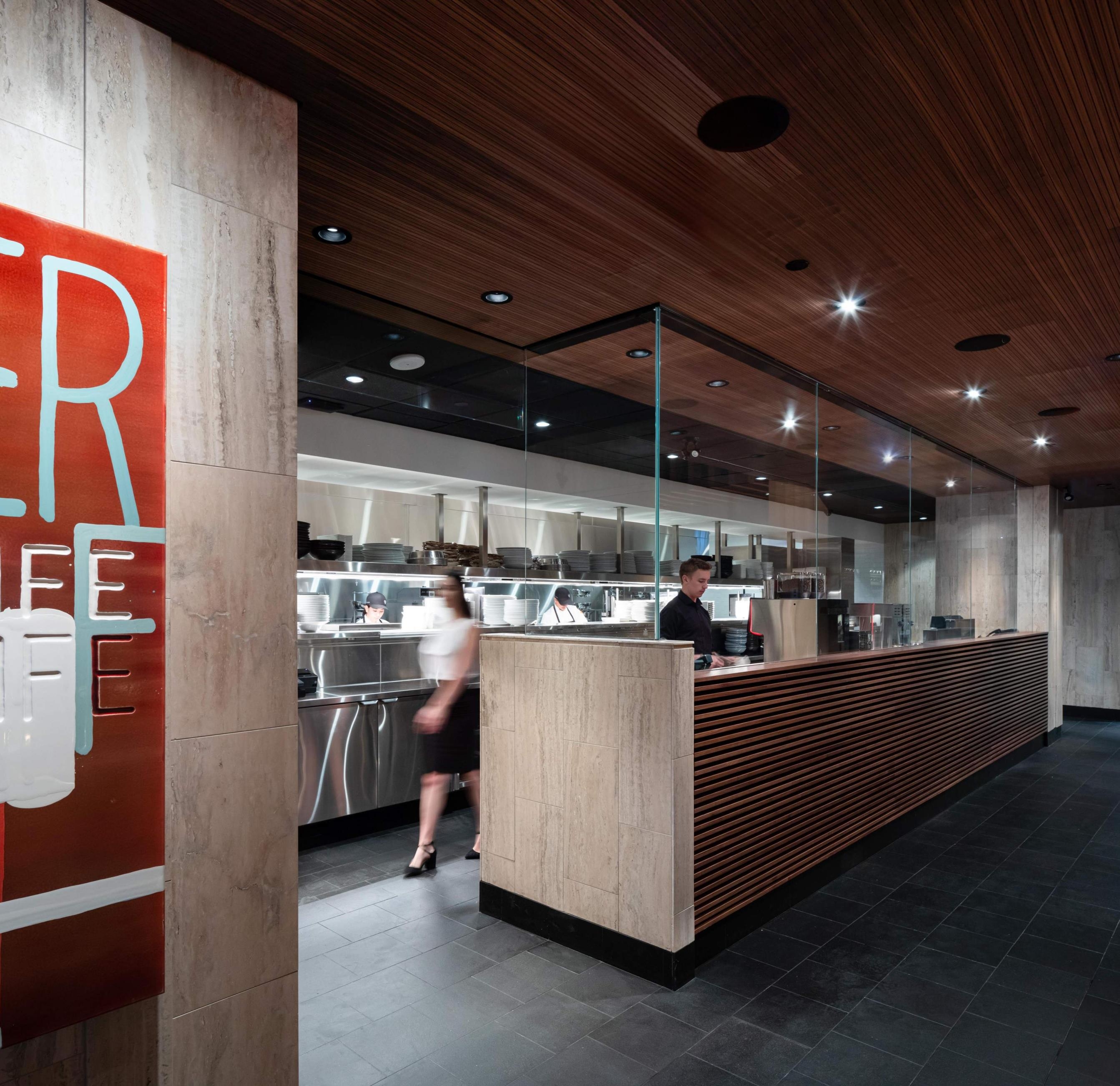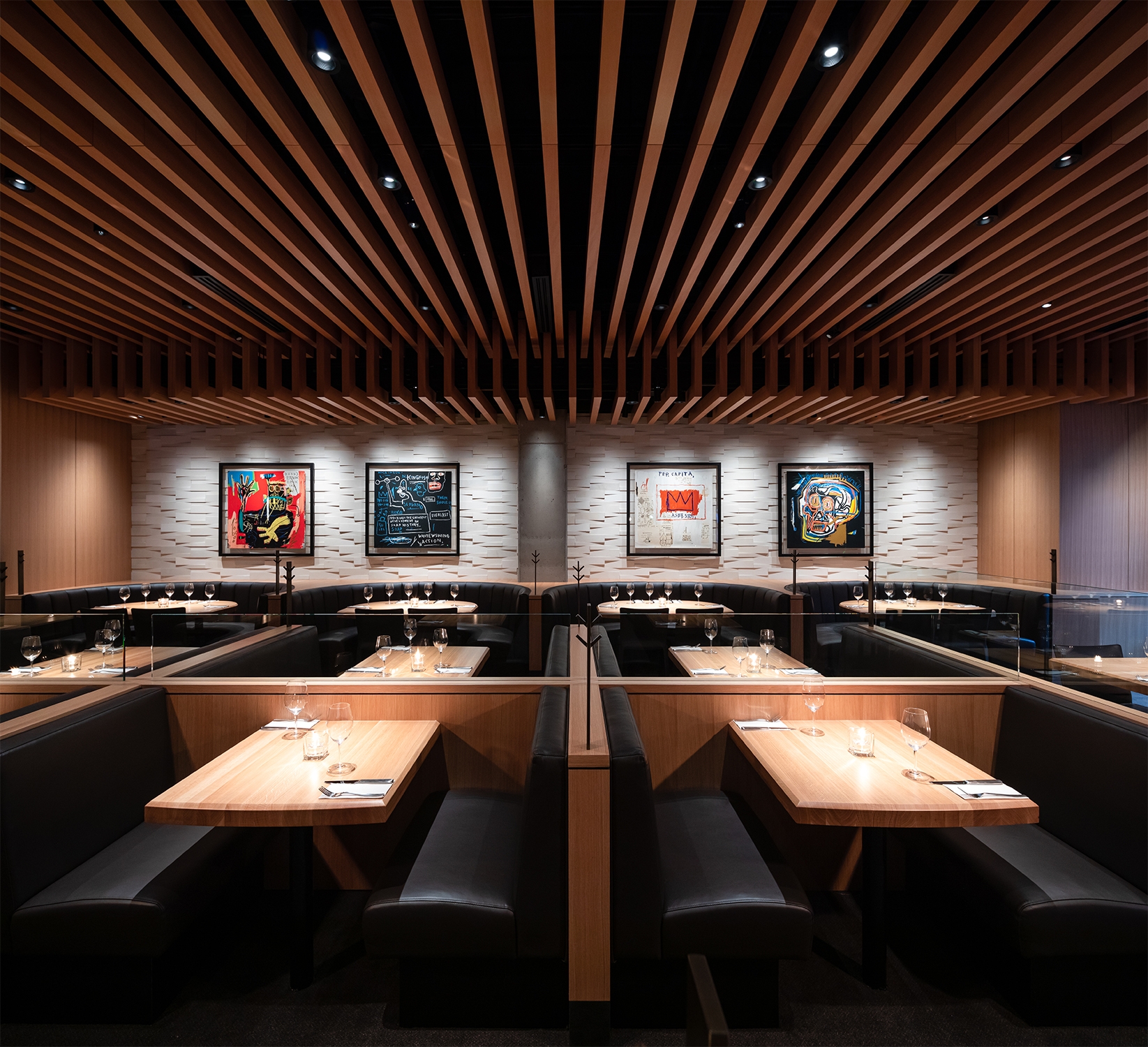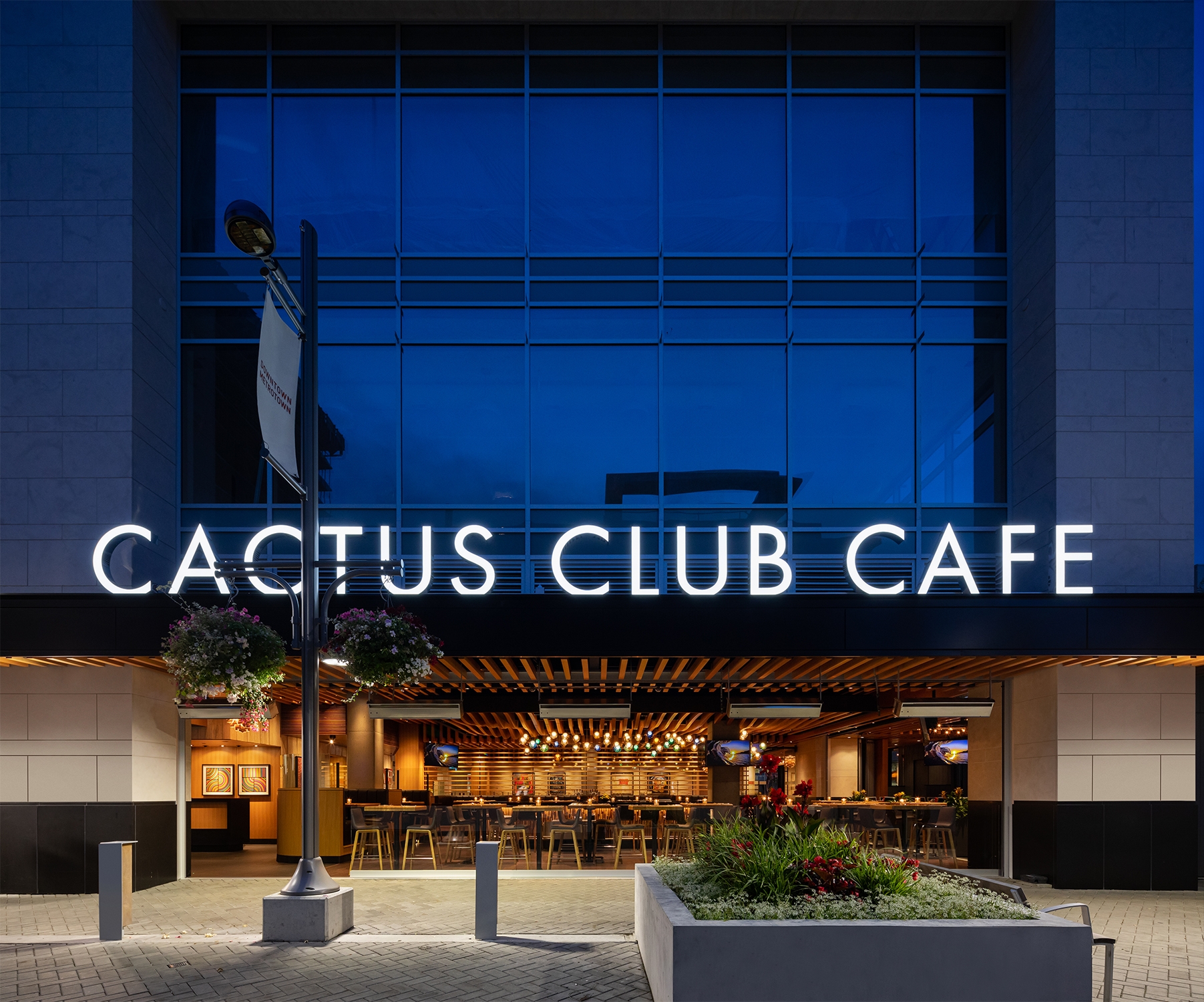 The project brings the brand’s hallmark formula of upscale, inventive, and global cuisine paired with a high-energy to a neighborhood accessible to a new segment of the city’s residents.With seating for nearly 300 guests both inside and on the patio, the lounge and dining room are clad in the signature material palate, consisting of the cornerstone finishes rift-cut white oak, oil-rubbed bronze, and dark leather. The interior design epitomizes the Cactus Club brand with its clean, modern, and sumptuous aesthetic. A continuous ribbon of wood ceiling transverses the space, creating a cohesive design element that unifies the dining experience. Situated at the base of new development, the exterior walls of the space are completely operable, seamlessly integrating interior and exterior spaces. A new canopy, clad in blackened steel, strikes a bold line to distinguish the restaurant from the tower above. The wood ribbon ceiling extends out with the canopy, projecting the signature design element of the space out into the public realm. The patio is capable of being operated year-round with a combination of sliding glass walls and radiant heat arrays integrated into the architecture.