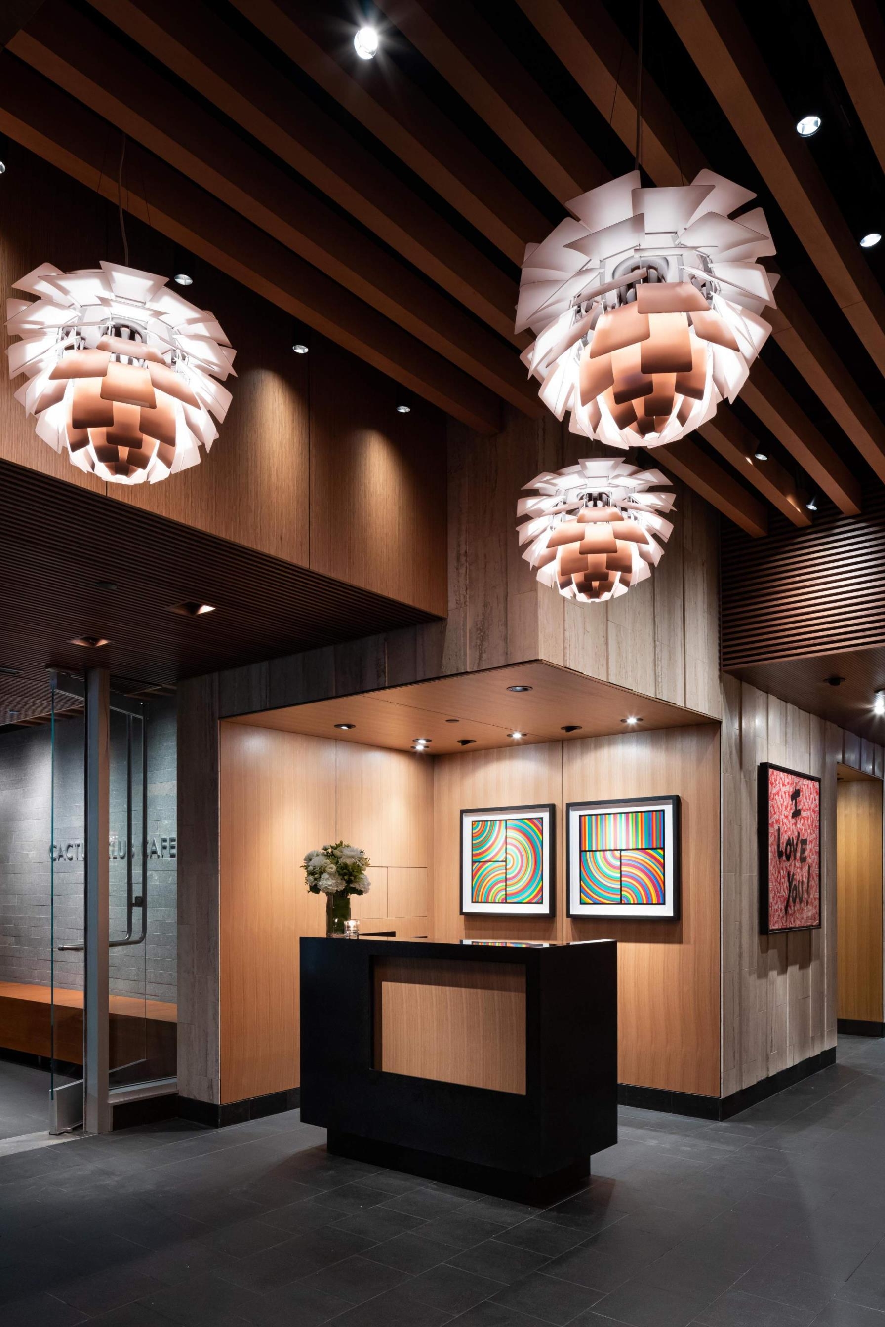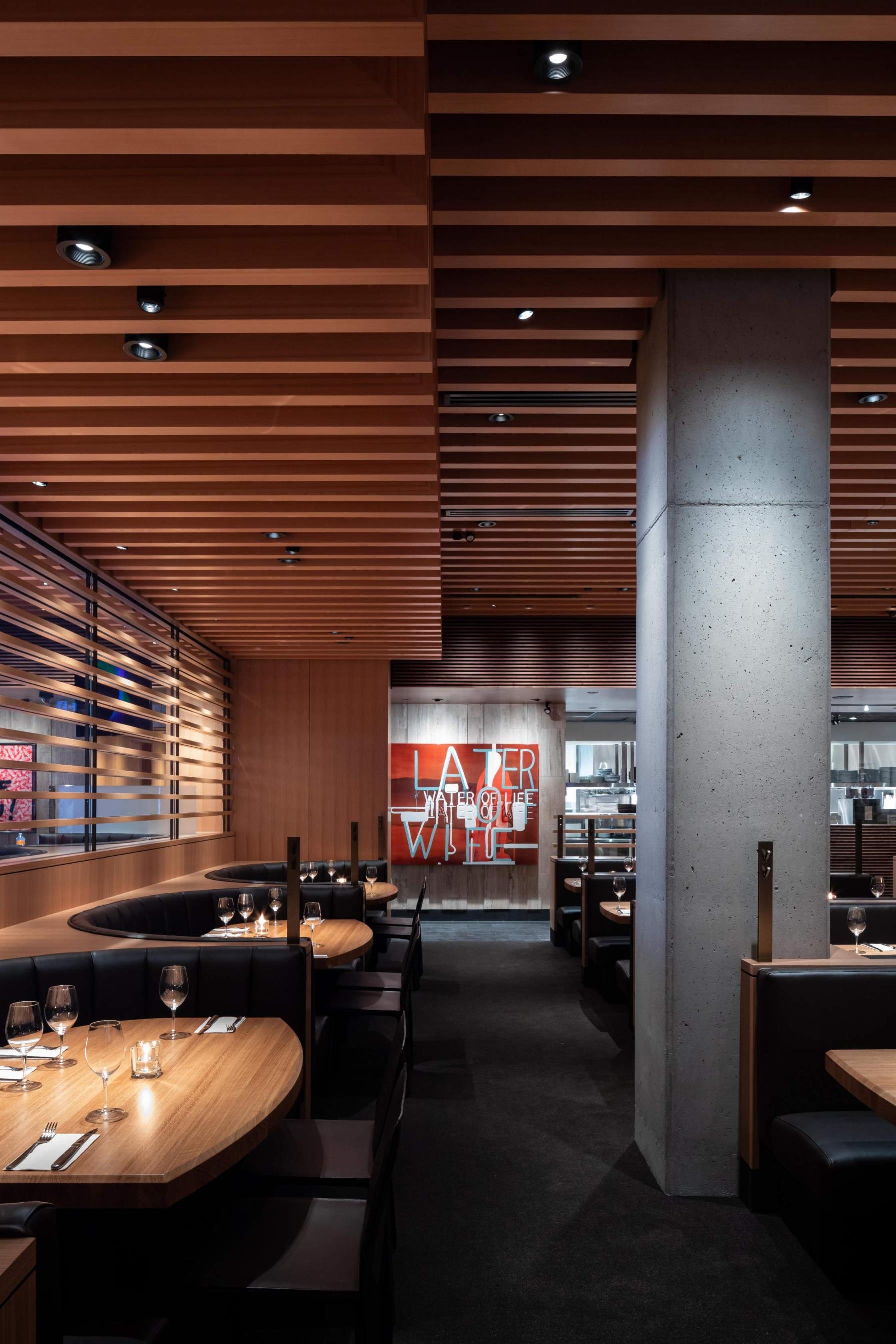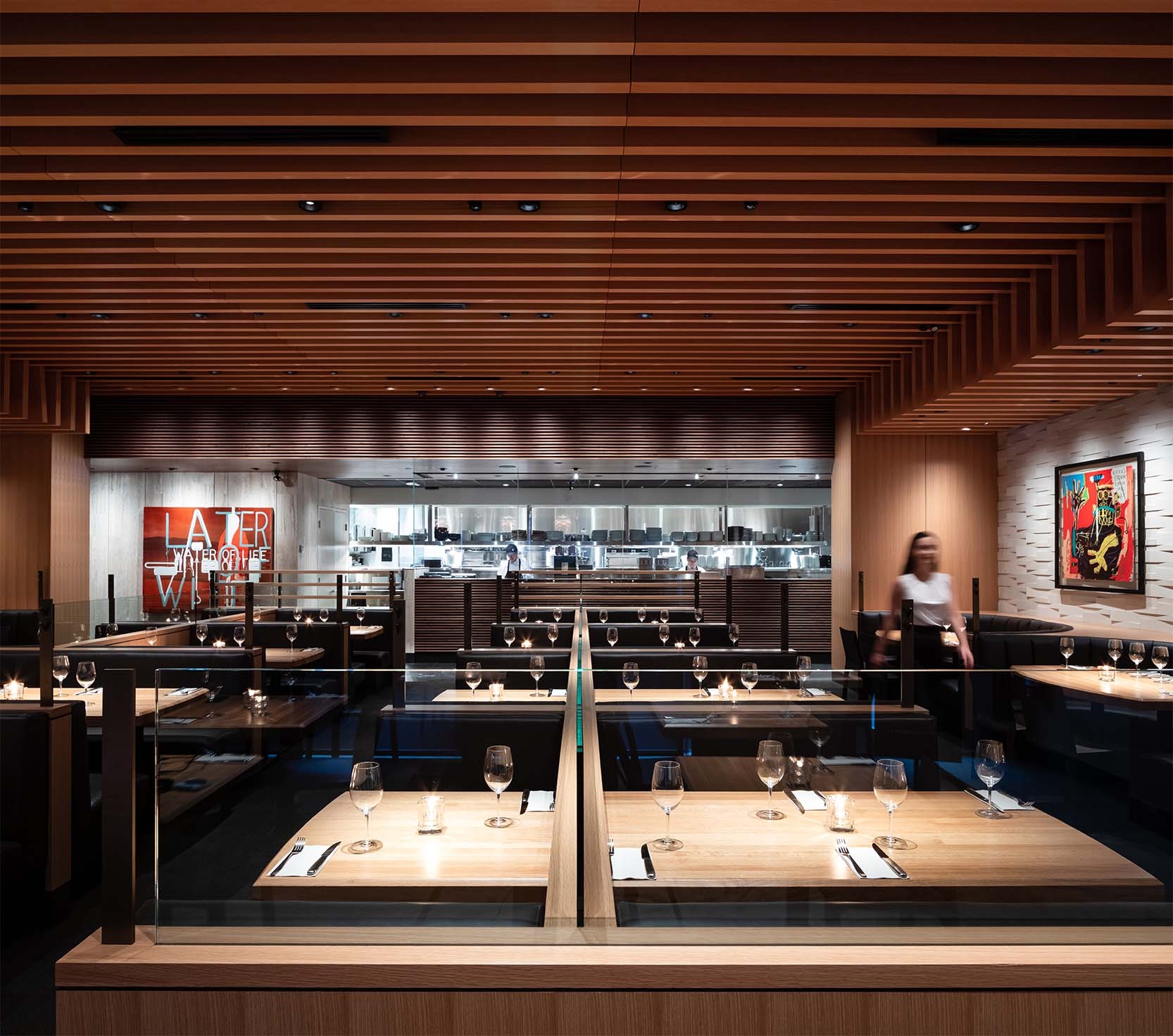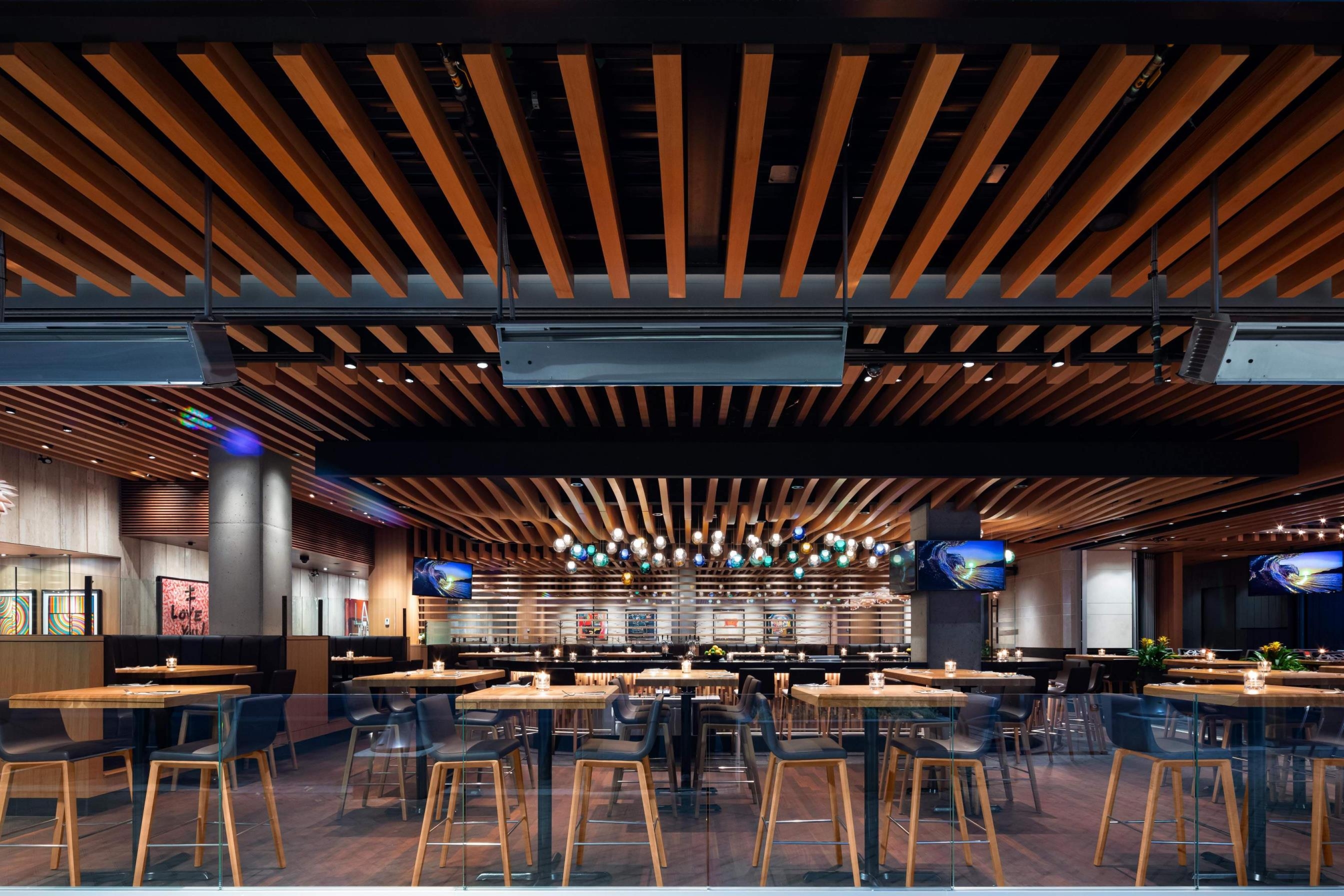 The project brings the brand’s hallmark formula of upscale, inventive, and global cuisine paired with a high-energy to a neighborhood accessible to a new segment of the city’s residents.With seating for nearly 300 guests both inside and on the patio, the lounge and dining room are clad in the signature material palate, consisting of the cornerstone finishes rift-cut white oak, oil-rubbed bronze, and dark leather. The interior design epitomizes the Cactus Club brand with its clean, modern, and sumptuous aesthetic. A continuous ribbon of wood ceiling transverses the space, creating a cohesive design element that unifies the dining experience. Situated at the base of new development, the exterior walls of the space are completely operable, seamlessly integrating interior and exterior spaces. A new canopy, clad in blackened steel, strikes a bold line to distinguish the restaurant from the tower above. The wood ribbon ceiling extends out with the canopy, projecting the signature design element of the space out into the public realm. The patio is capable of being operated year-round with a combination of sliding glass walls and radiant heat arrays integrated into the architecture.