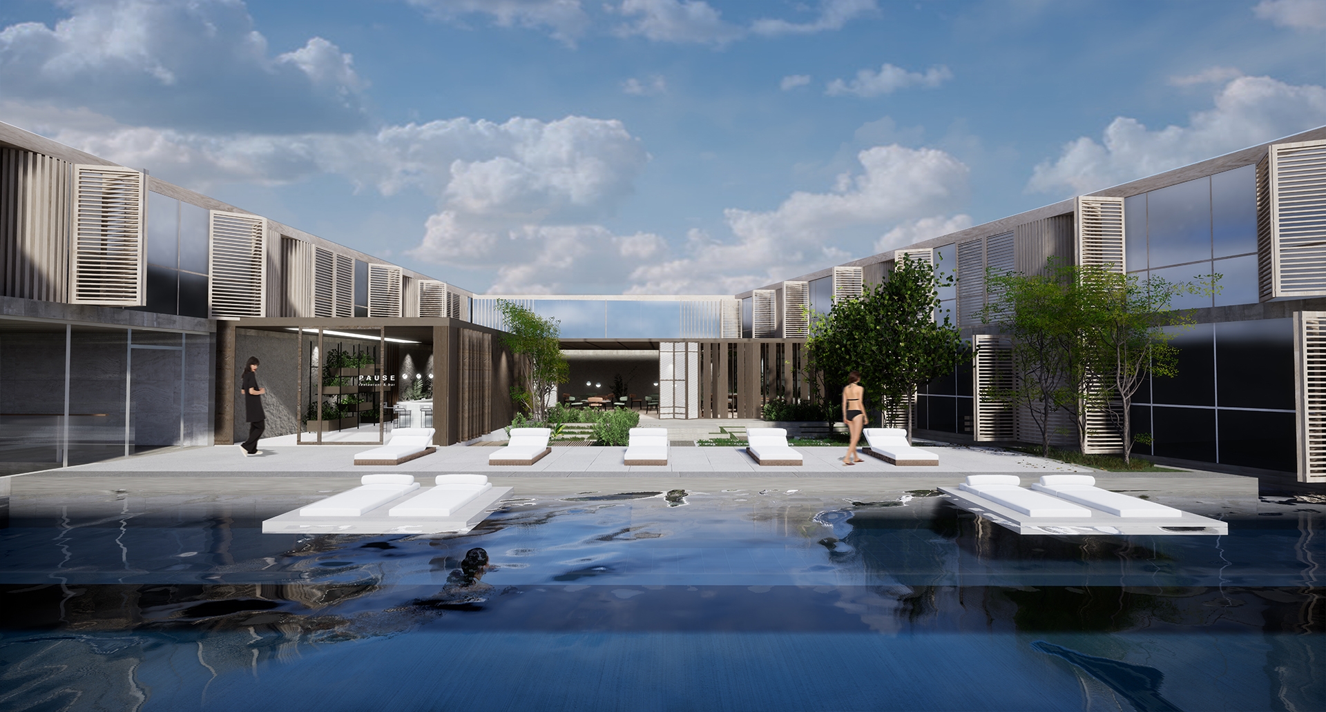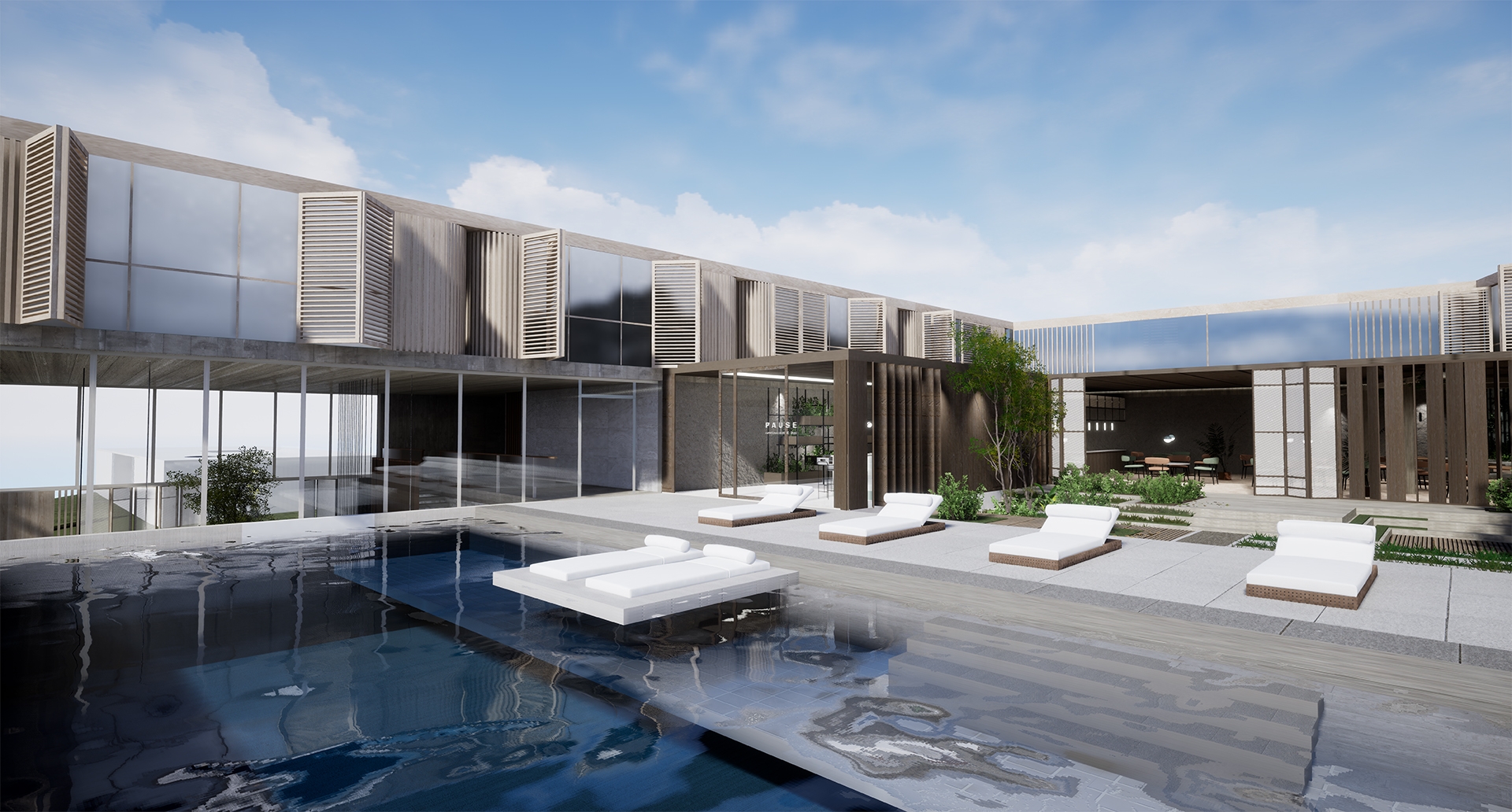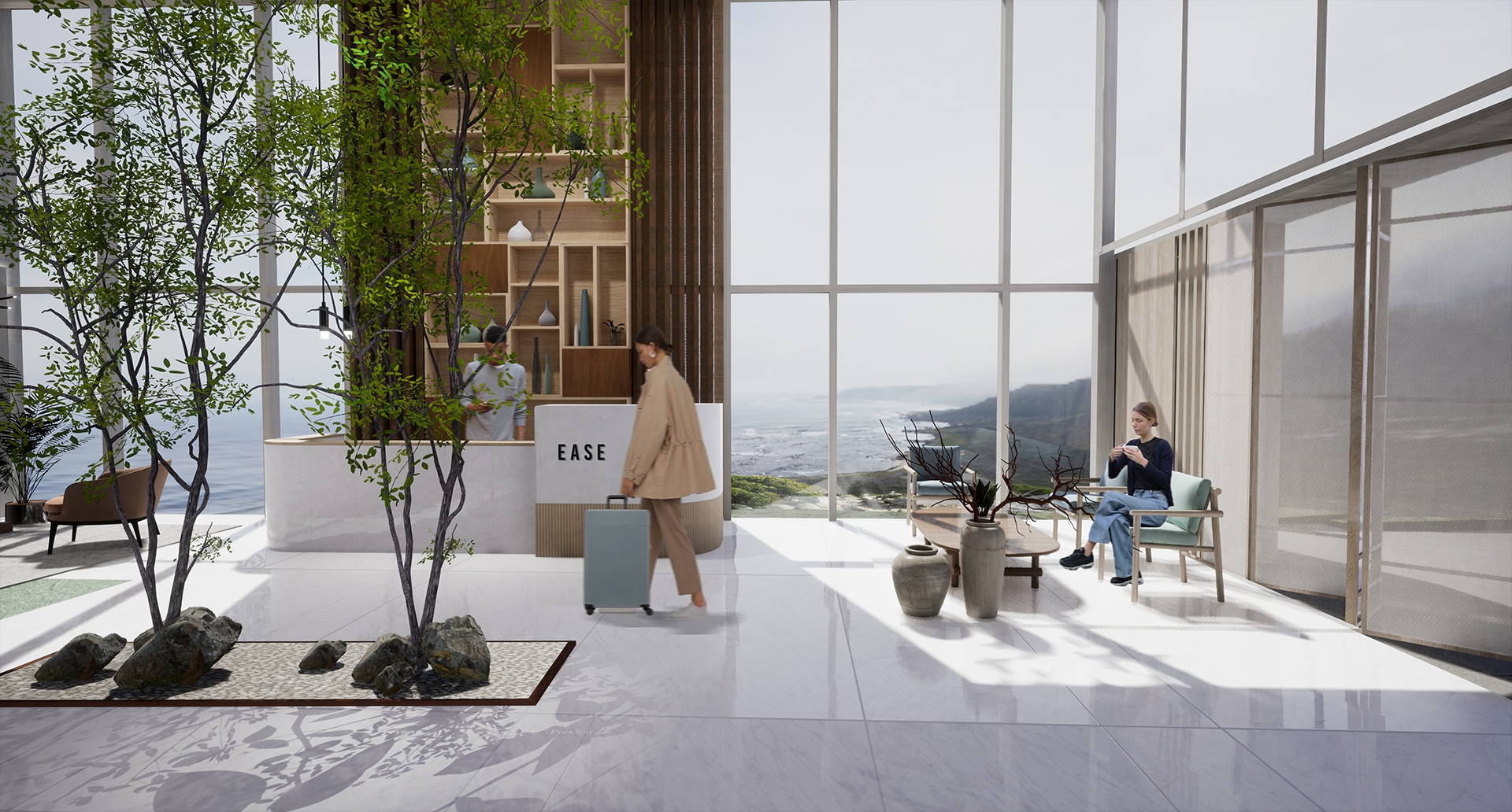 Ease is a tranquil resort which embodies the idea of Biophilia, with the goal of enhancing human connection to nature through incorporating natural elements such as natural material, fresh air, and sunlight into the overall experience. Ease create a balance between city and nature, allowing guests to release stress related to urban environment while improving well-being and health for guests upon arrival.