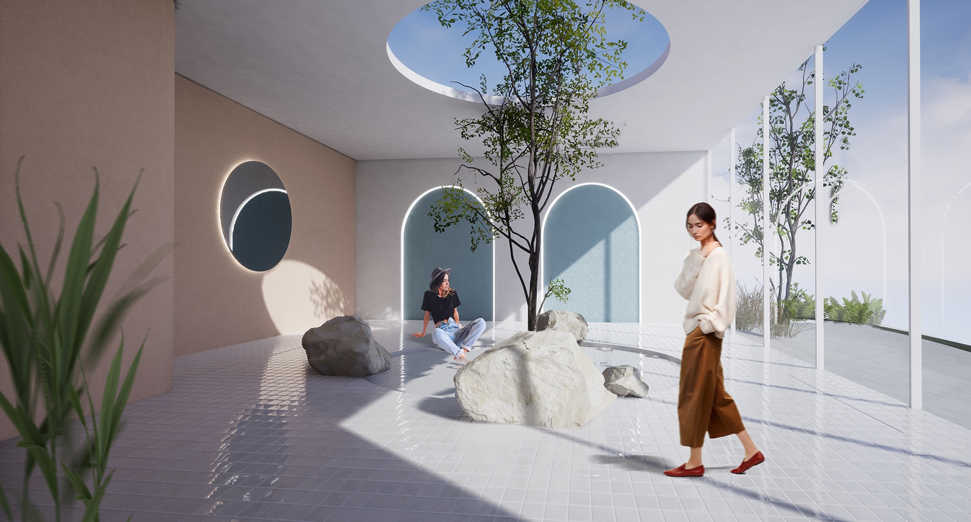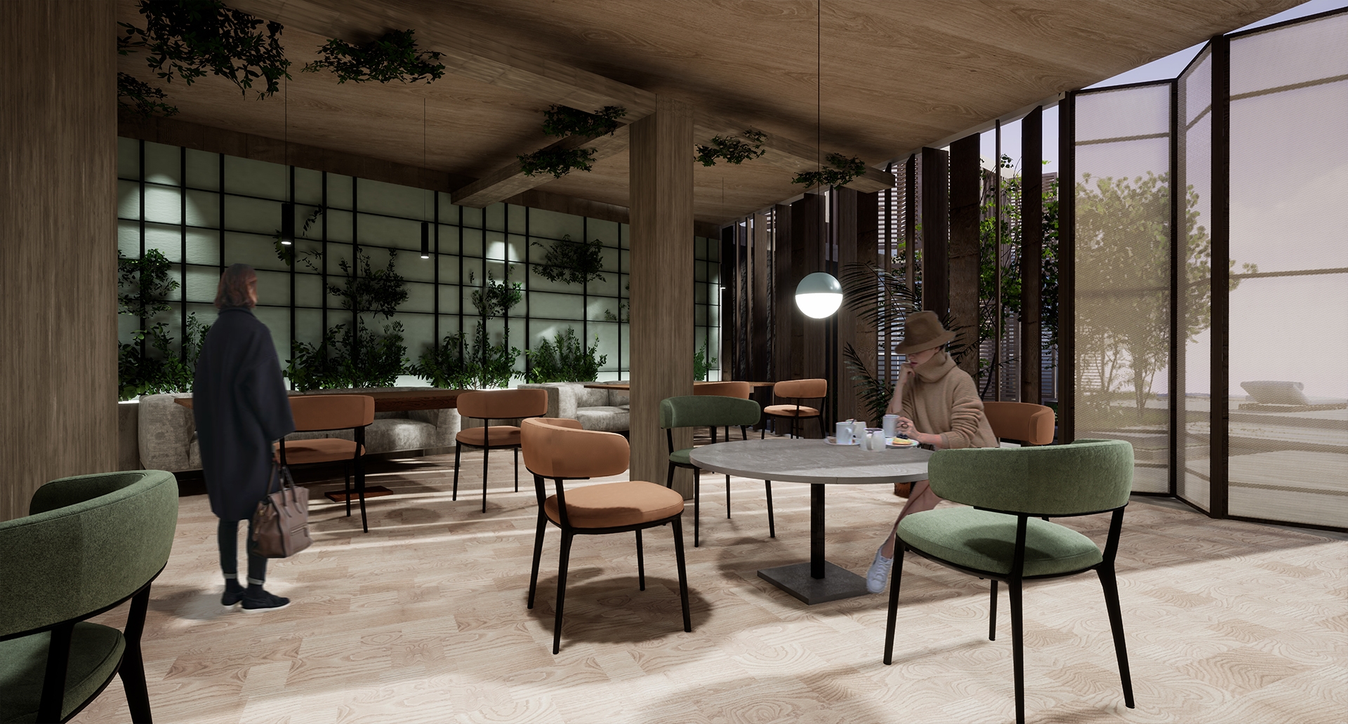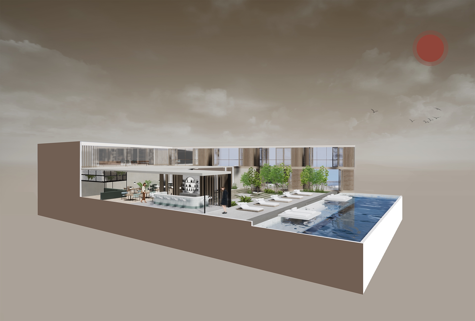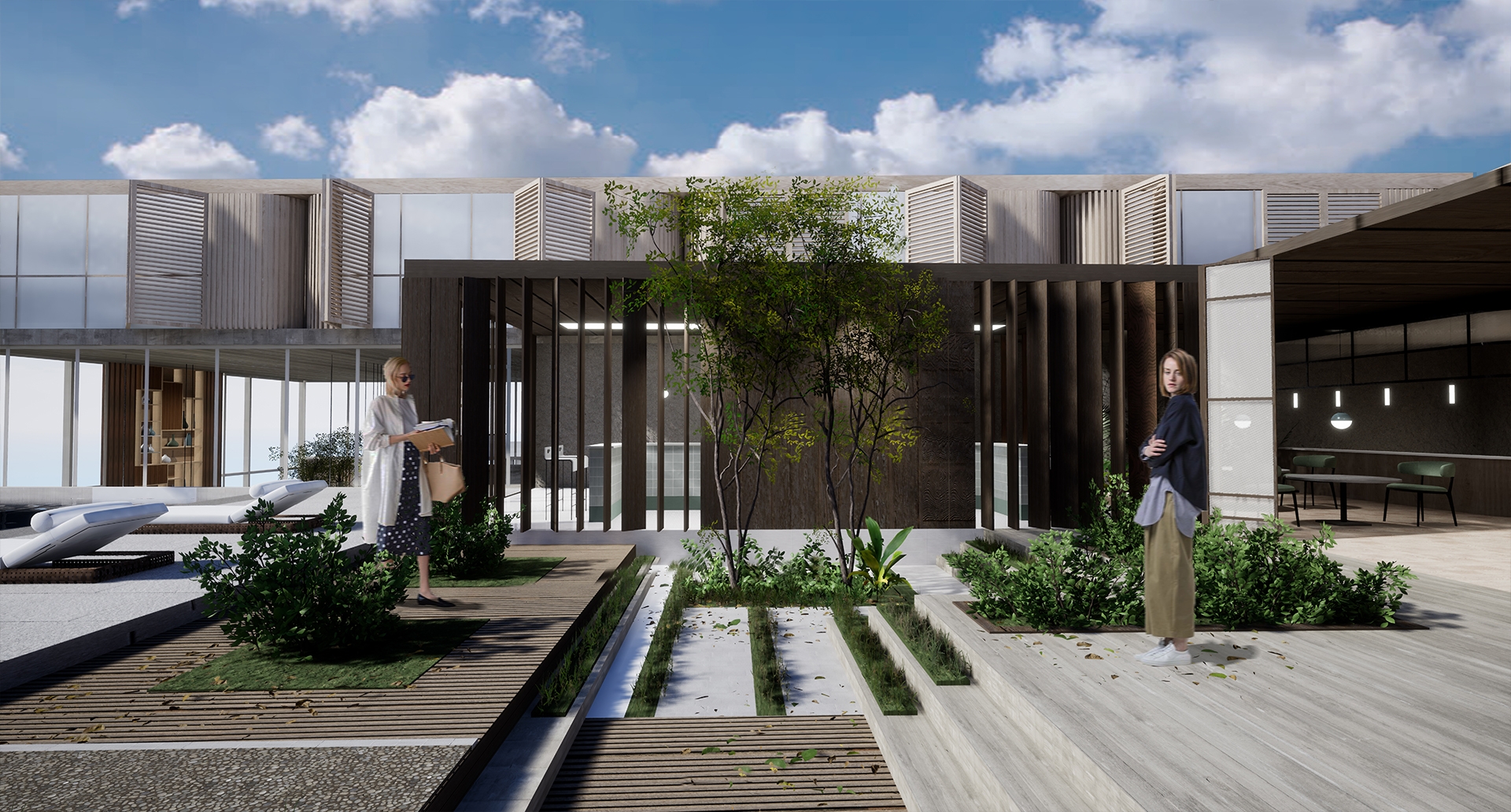 Ease is a tranquil resort which embodies the idea of Biophilia, with the goal of enhancing human connection to nature through incorporating natural elements such as natural material, fresh air, and sunlight into the overall experience. Ease create a balance between city and nature, allowing guests to release stress related to urban environment while improving well-being and health for guests upon arrival.