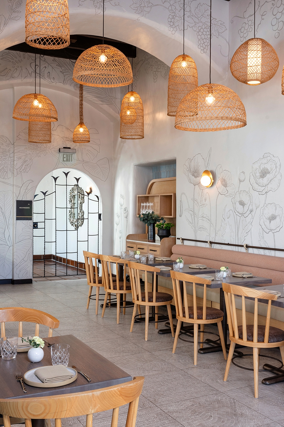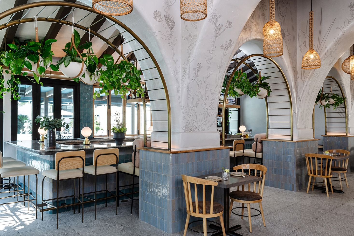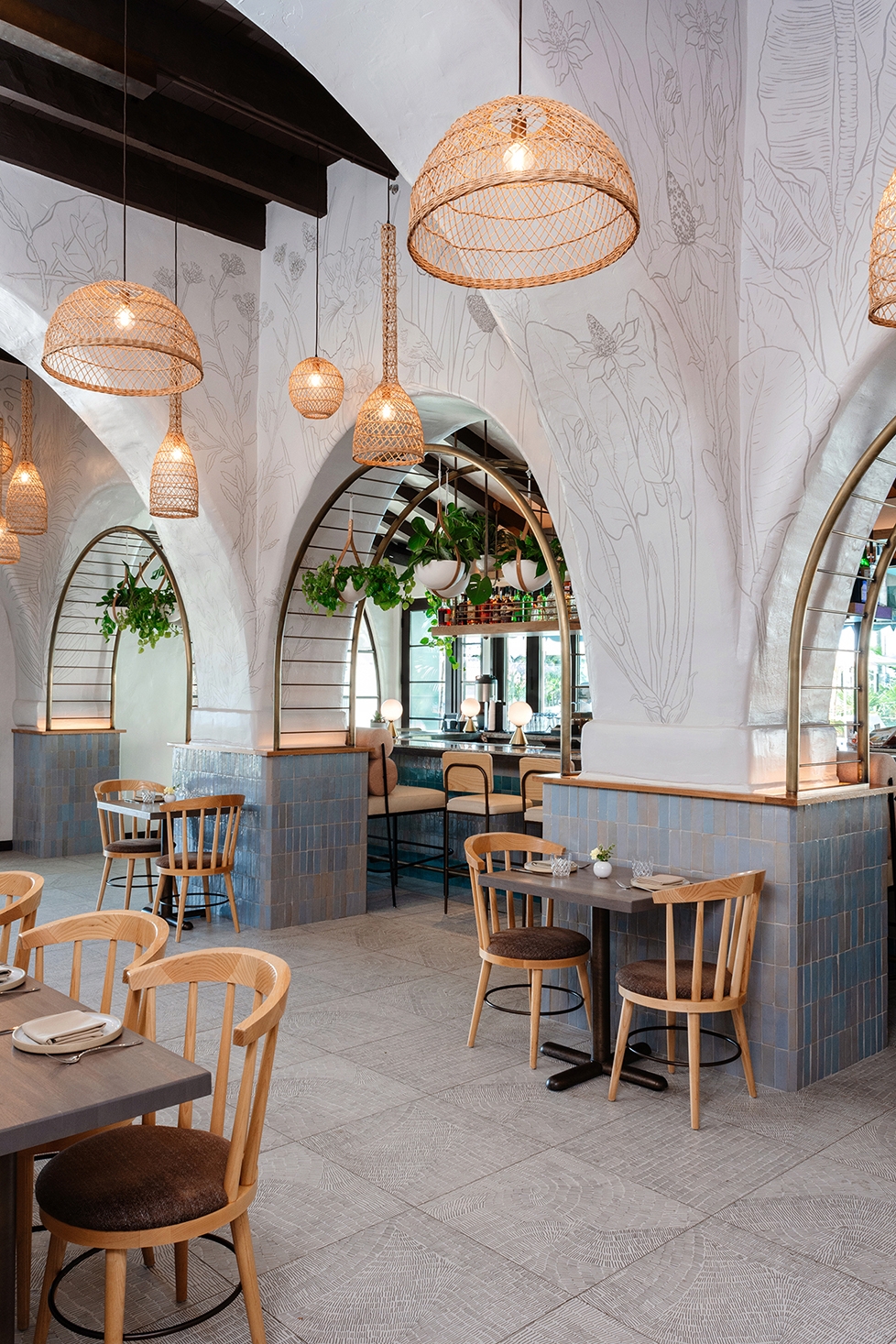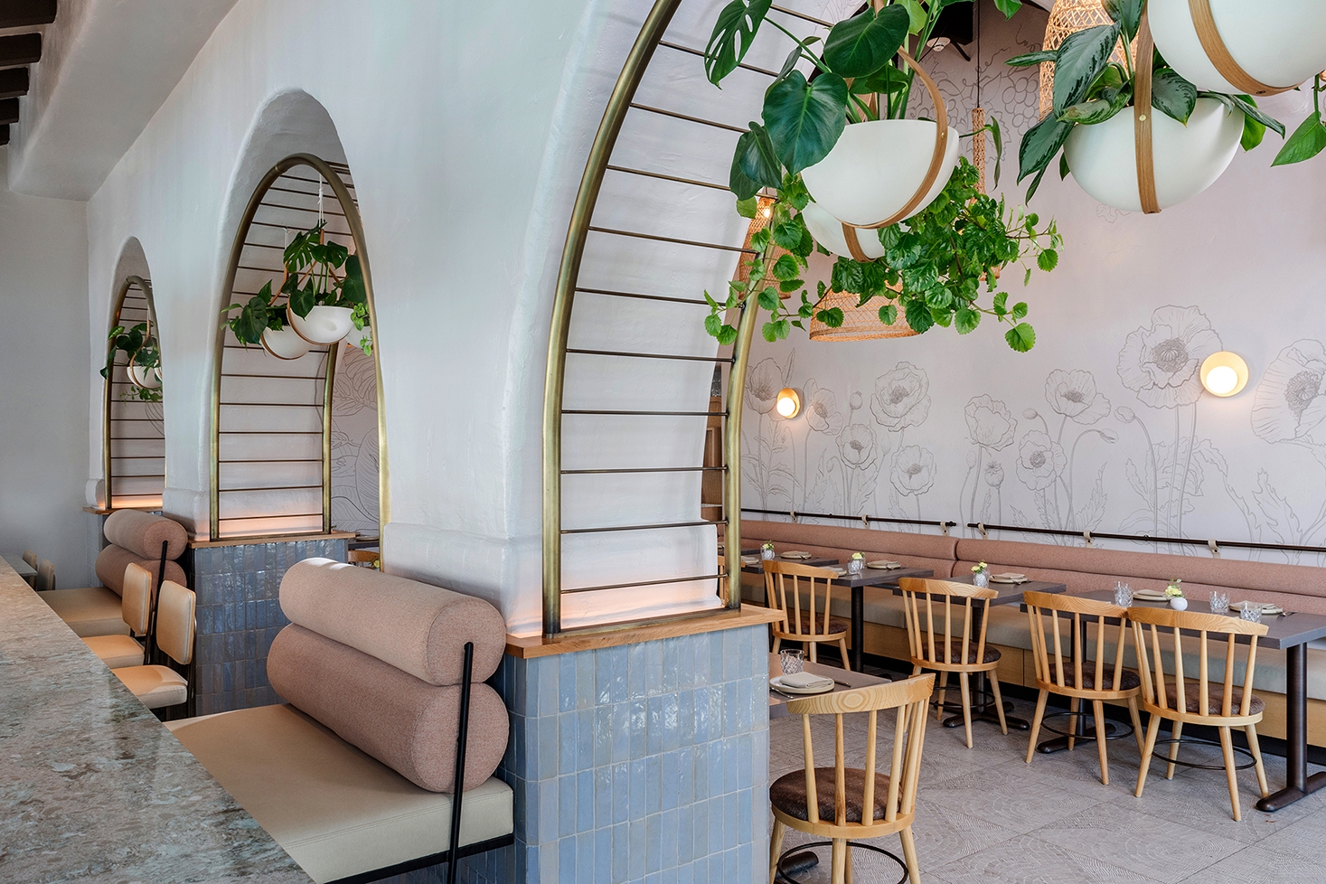 The Mediterranean inspired menu also informed some of the material selections, such as the Moroccan zellige tile at the bar and base of the arches. The pendant lights and hanging plants emphasize the sense of being in a warm, southern climate and its proximity to the water.