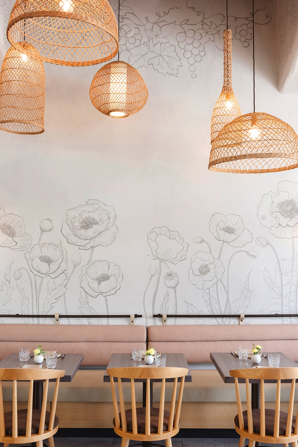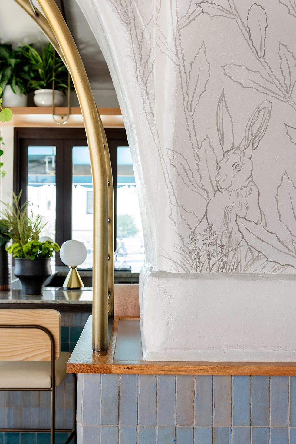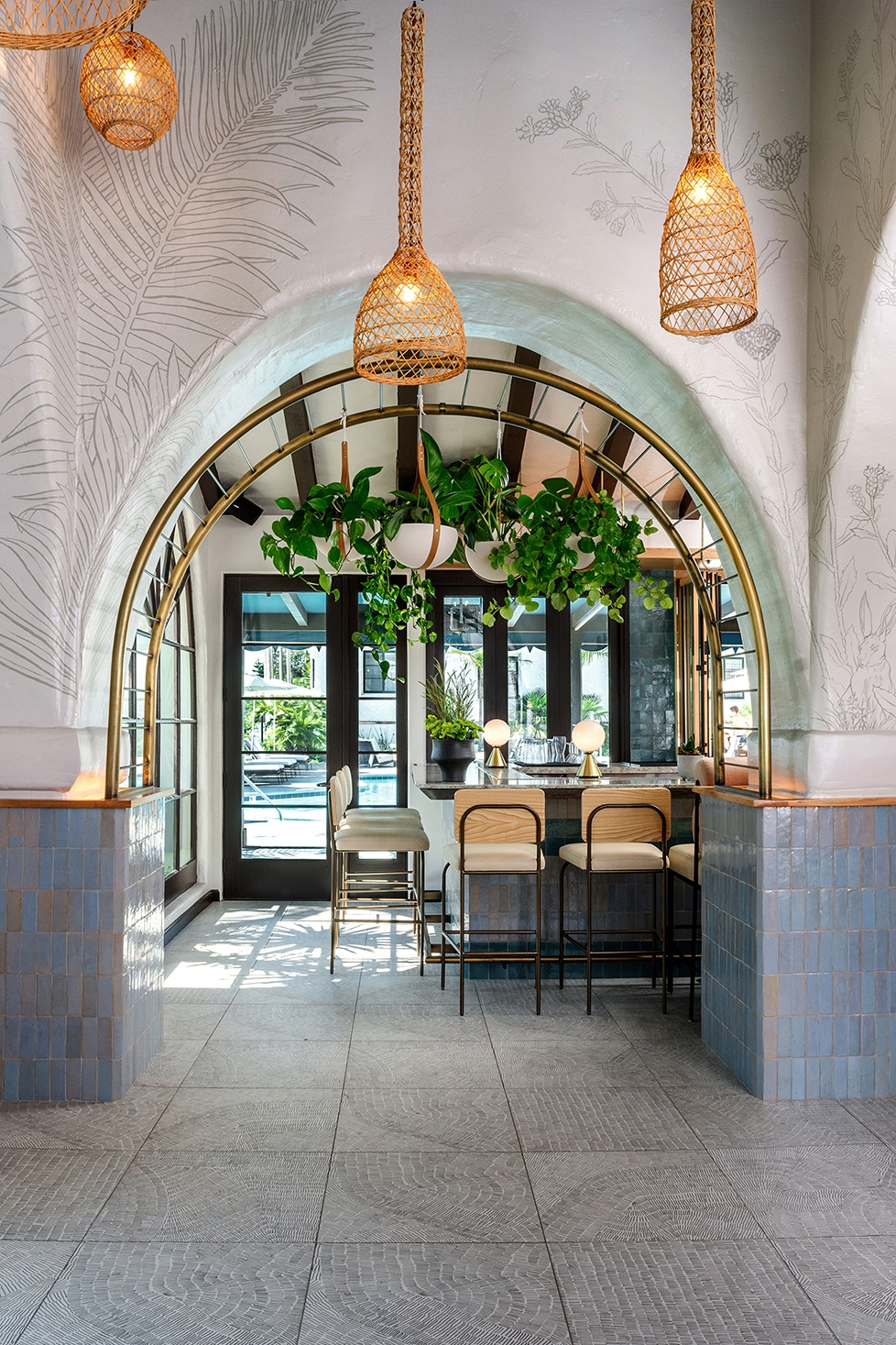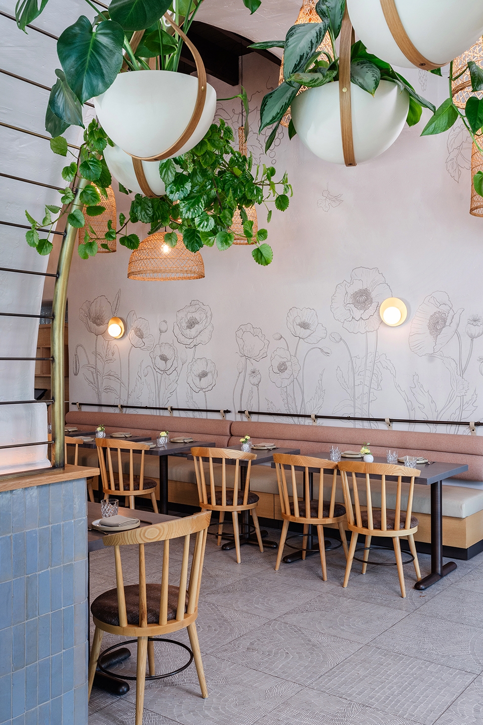 The Mediterranean inspired menu also informed some of the material selections, such as the Moroccan zellige tile at the bar and base of the arches. The pendant lights and hanging plants emphasize the sense of being in a warm, southern climate and its proximity to the water.