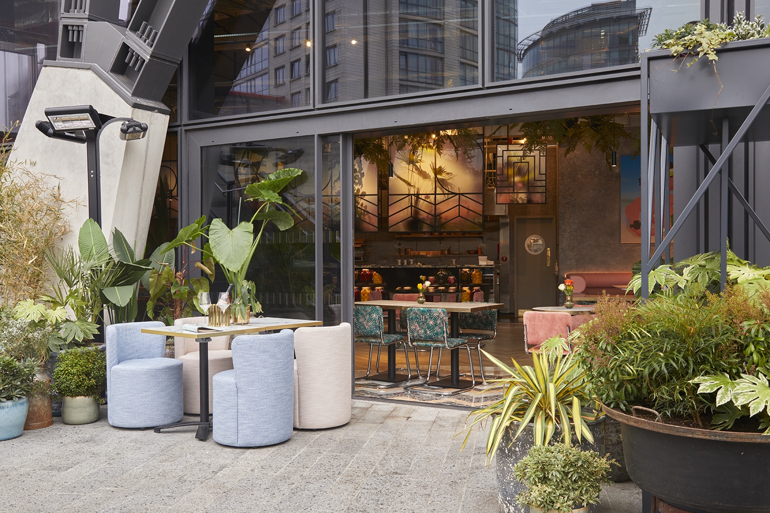 Our brief was to design a colourful, but still pared-back, industrial-luxe design scheme for Bondi Green, a new all-day bar, restaurant and al fresco café/bakery beside the peaceful waters of the Grand Union canal in West London. To run riot with a Miami inspired palette, in an unadulterated celebration of tone and texture, playing with pattern clash and experimenting with wow factor specialist surface finishes.