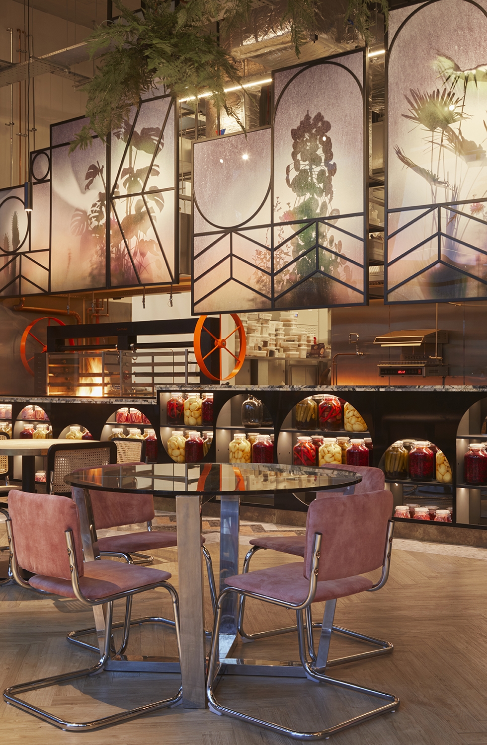 The results: our design puts colourful glamour centre stage, with giant art and dramatic arches lit atmospherically. Furnishings pop in extrovert clashing botanical and animal print fabrics. And the huge space is zoned through planting and highly textured metallic specialist wall finishes, sparkling day and night. With a perfectly positioned ‘opening’ in the centre of the bar, straight down the barrel of the pizza oven.