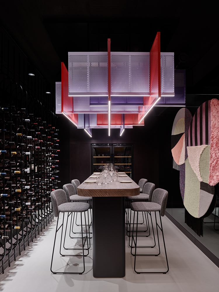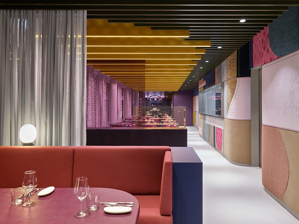 The restaurant is divided into three sections: a lounge, a dining area and a vinoteca. An atmospheric adventure of smells, sounds and tastes – not forgetting colours and fabrics – awaits you in the dining area. The aim here was to render Object Carpet’s furnishing expertise tangible – in a subtle yet palpable way. Thus textile wall collages of damask and hessian enter into tantalising dialogue with carpet and cord. At the same time, a window into the kitchen opens up a direct visual connection to the chef. Allowing the food to then speak for itself.