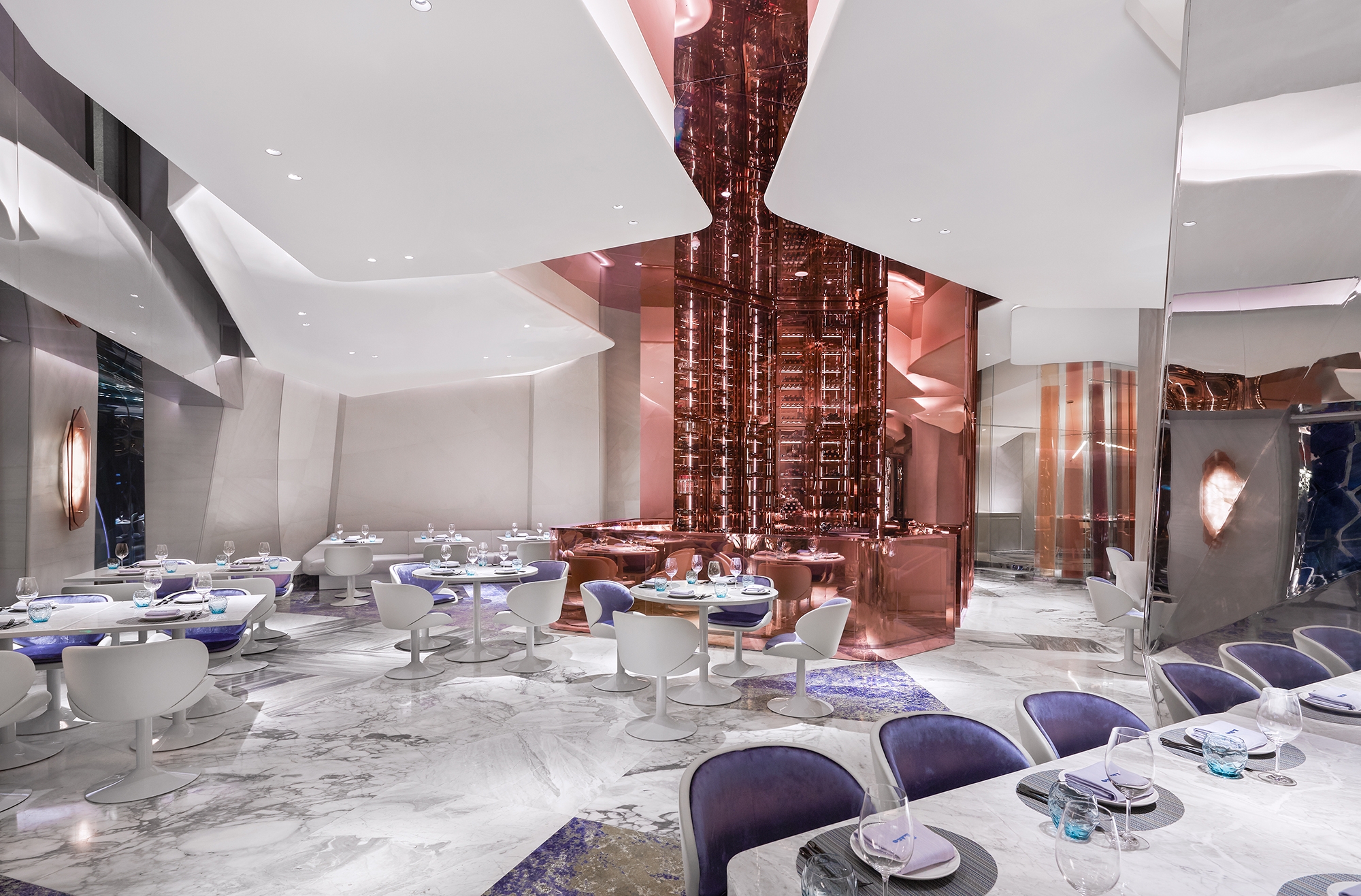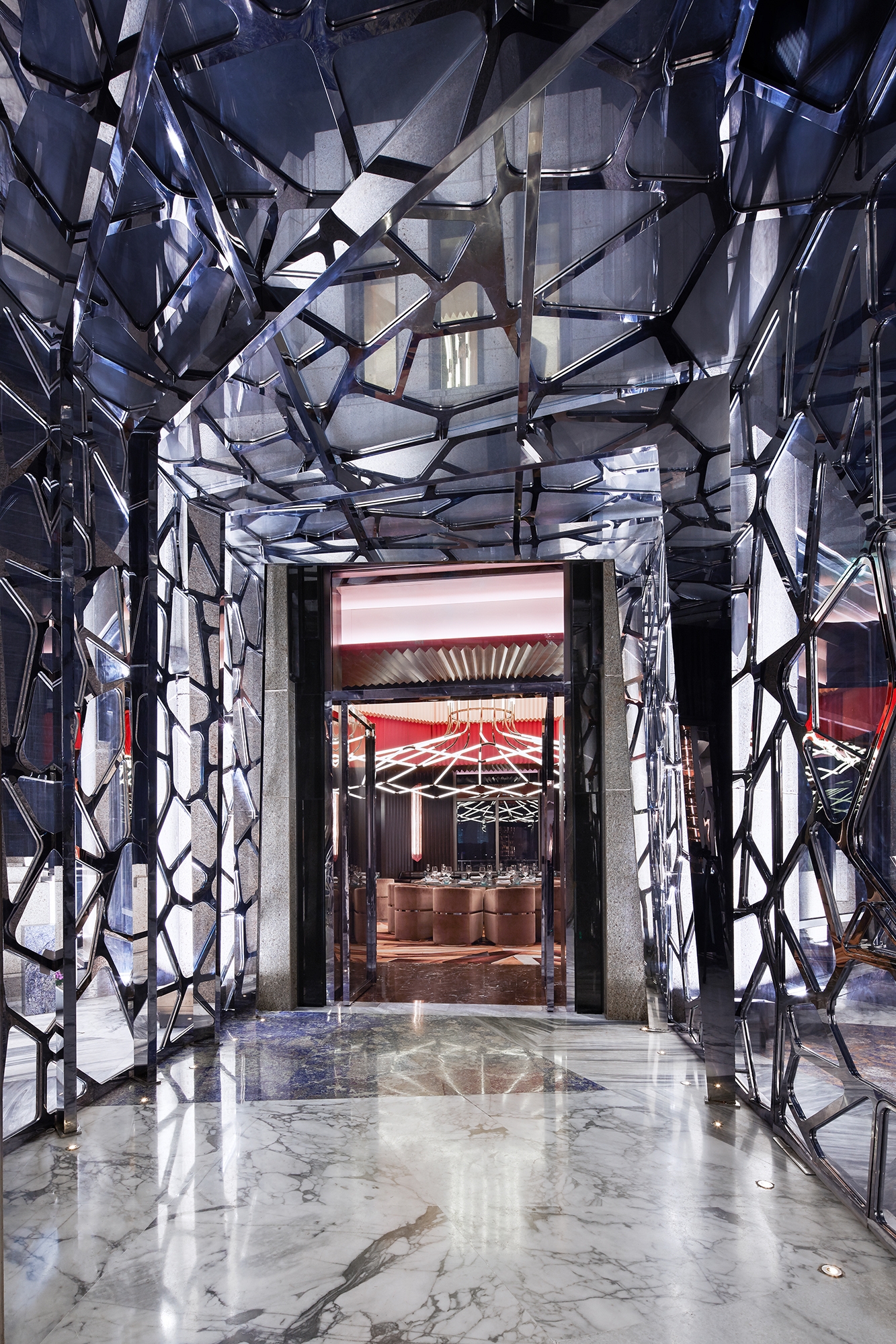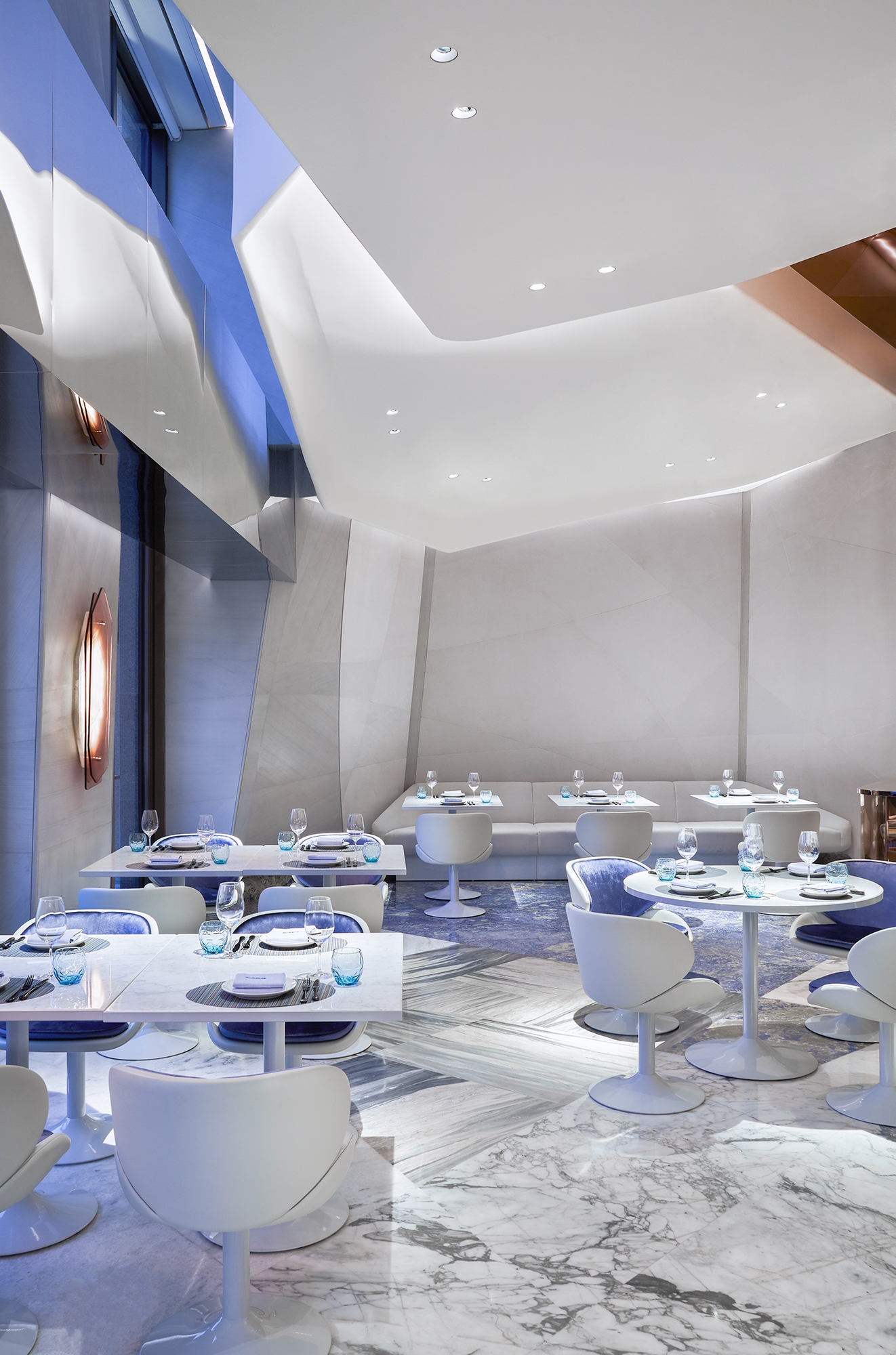Located on the 6th floor of the Bellagio Shanghai, LAGO by Julian Serrano is a progressive experience celebrating the most spectacular views of the Suzhou River. Conceived by Studio Munge, LAGO’s avant-garde interiors juxtaposes Shanghai’s historic Puxi district and infuses the luxurious hotel with electrifying modernity. Concept driven, LAGO embodies Italian Futurismo; a cultural movement of the early 20th century that rejects the past by focusing on forward-thinking and experimentation. The experience begins with an iridescent explosion of colour and light. Leading to the sculptural host stand, the corridor is a dynamic portal shaped by dozens of glass fins in vibrant shades of blue that reflect on sophisticated marble floors. Anchoring the main room, a floor-to-ceiling cabinet displays LAGO’s world-class wine program encased in shimmering crimson chrome and burgundy smoked glass. Reached via a glass tunnel fused with chrome screens, discover Shanghai’s most intimate cupola chamber. Opened to the main dining or partitioned off for exclusive events, the room glows under a grand tubular chandelier illuminating the walls, gradually transitioning from soft pinks to velvety reds.