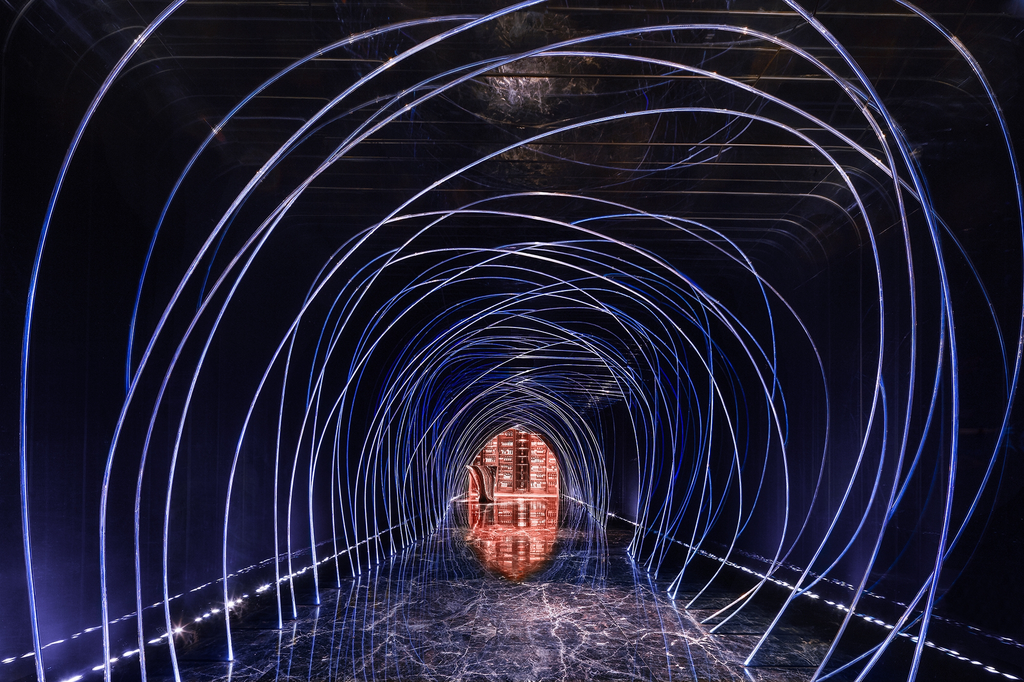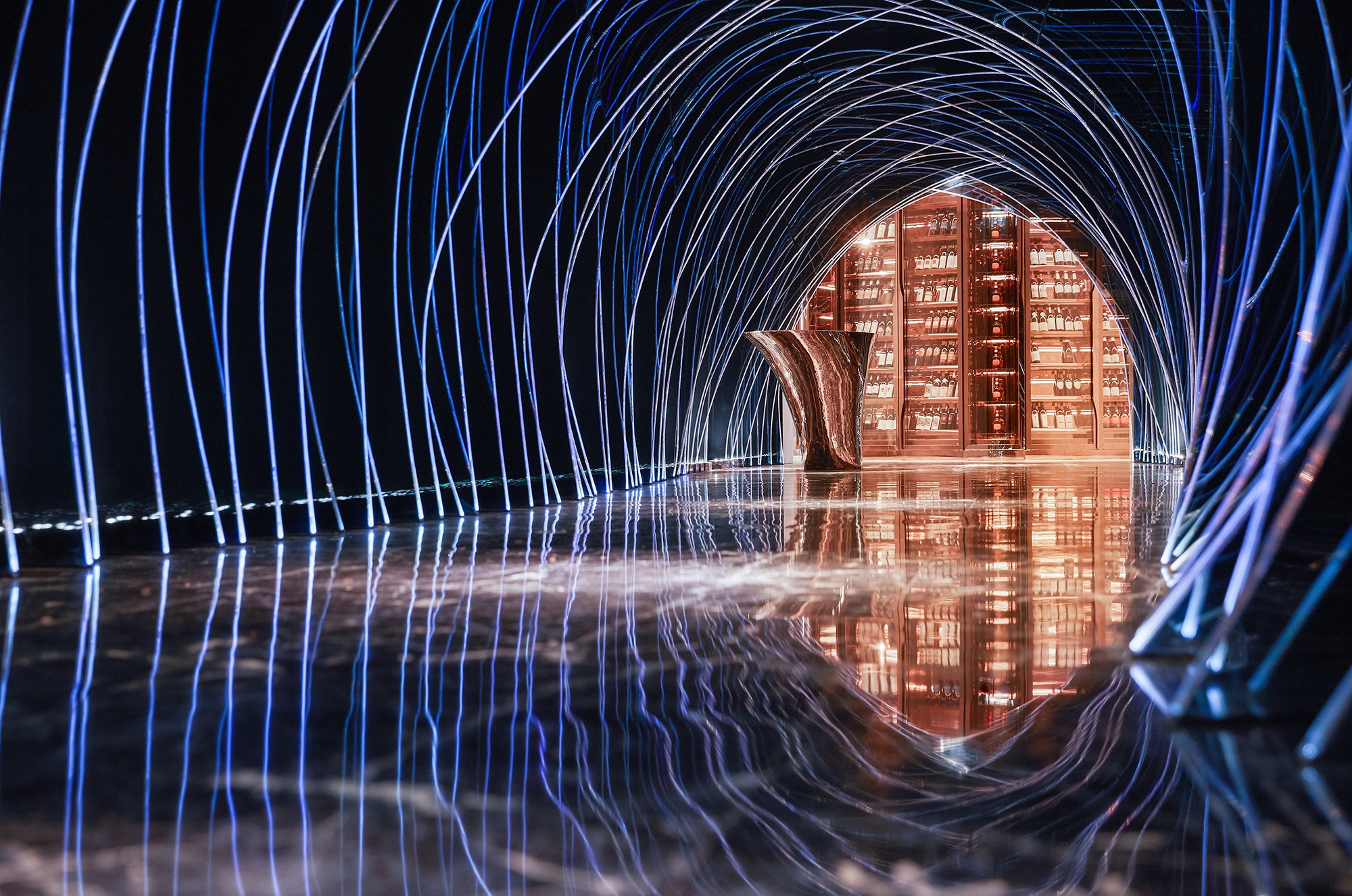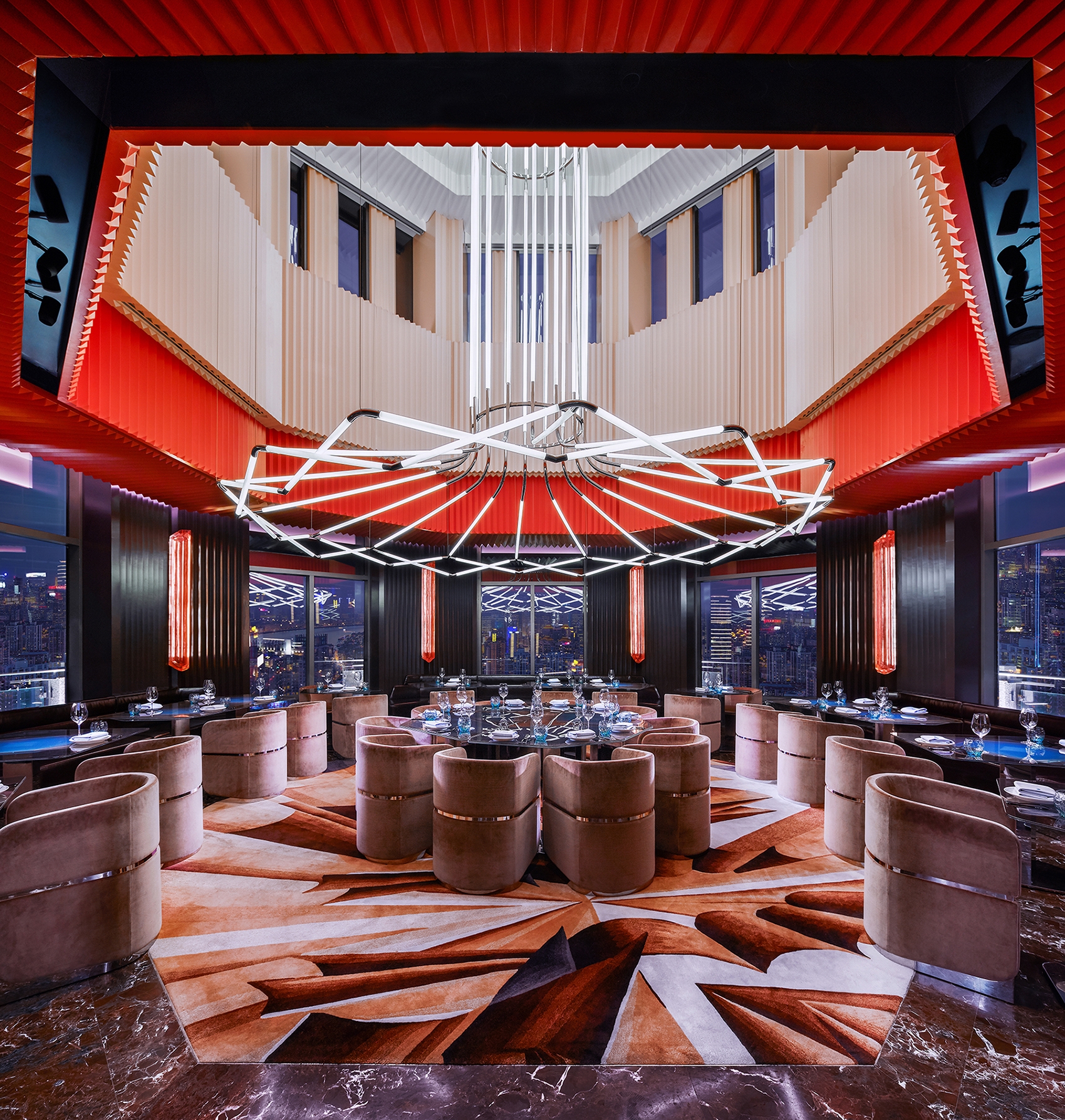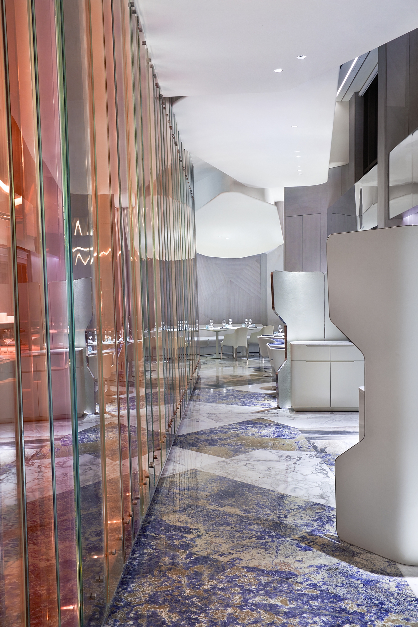 Located on the 6th floor of the Bellagio Shanghai, LAGO by Julian Serrano is a progressive experience celebrating the most spectacular views of the Suzhou River. Conceived by Studio Munge, LAGO’s avant-garde interiors juxtaposes Shanghai’s historic Puxi district and infuses the luxurious hotel with electrifying modernity. Concept driven, LAGO embodies Italian Futurismo; a cultural movement of the early 20th century that rejects the past by focusing on forward-thinking and experimentation. The experience begins with an iridescent explosion of colour and light. Leading to the sculptural host stand, the corridor is a dynamic portal shaped by dozens of glass fins in vibrant shades of blue that reflect on sophisticated marble floors. Anchoring the main room, a floor-to-ceiling cabinet displays LAGO’s world-class wine program encased in shimmering crimson chrome and burgundy smoked glass. Reached via a glass tunnel fused with chrome screens, discover Shanghai’s most intimate cupola chamber. Opened to the main dining or partitioned off for exclusive events, the room glows under a grand tubular chandelier illuminating the walls, gradually transitioning from soft pinks to velvety reds.