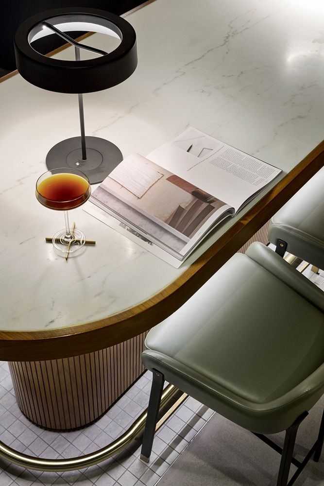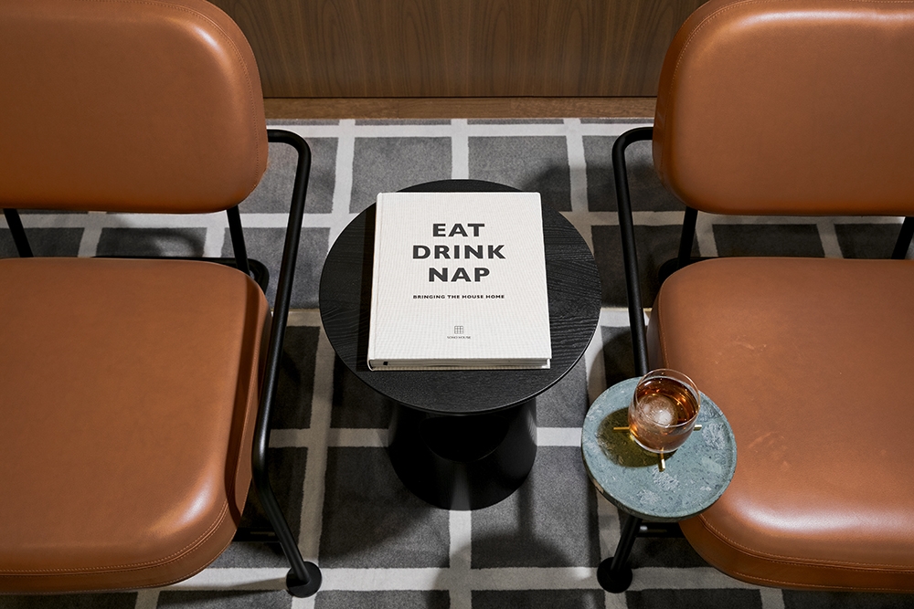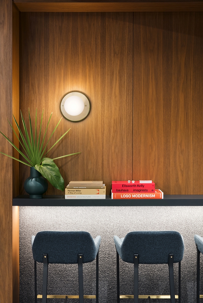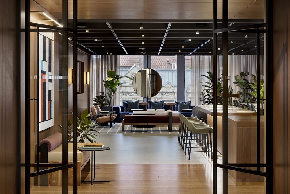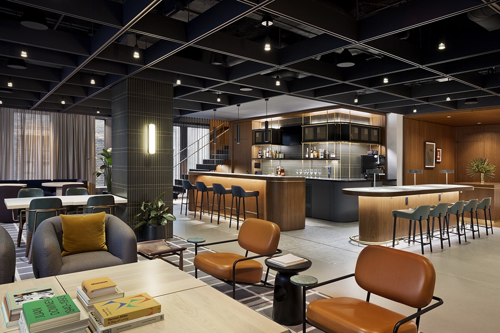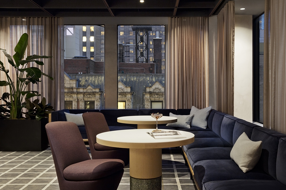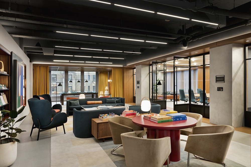 A space primarily for lounging and meeting, the 10,500 RSF amenity center at 1700 Broadway Club focuses its energy on a less structured experience than its surrounding offices. Weaving its way from architecture down to furniture, that dissolving of rigidity draws its inspiration from the mid-century, the era when the building was erected.