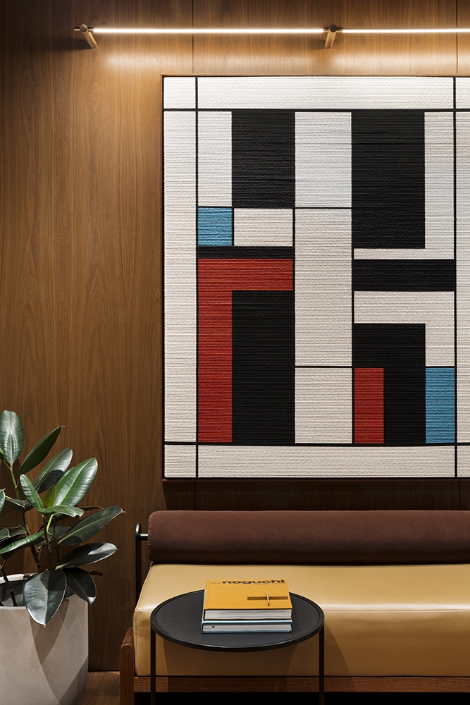 The completed space encompasses a simple working mantra “Off the Grid” – a space for creative retreat from the structures of one’s daily experience. Spaces are divided less by solid walls and more by elements that could simultaneously define yet remain transparent. The traditional procession of enclosed rooms was supplanted by objects placed in a field – screens lightly anchored to floor and ceiling, built-in furniture, and changes in material or color. Each space was infused with the ethos, materiality, and spirit of leading 1960s designers and thinkers.