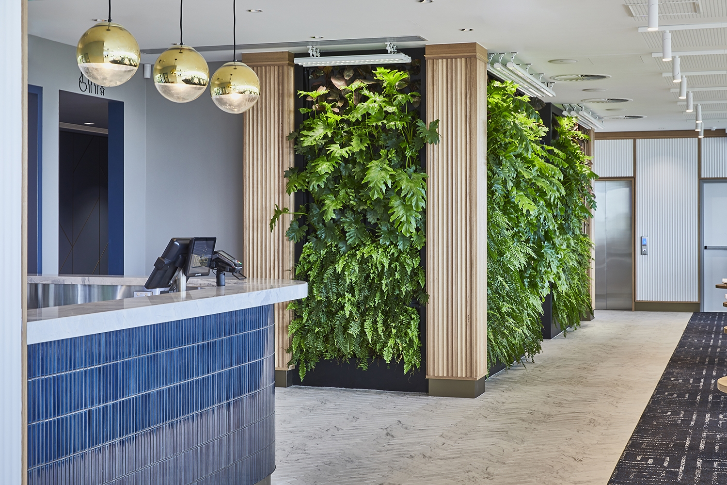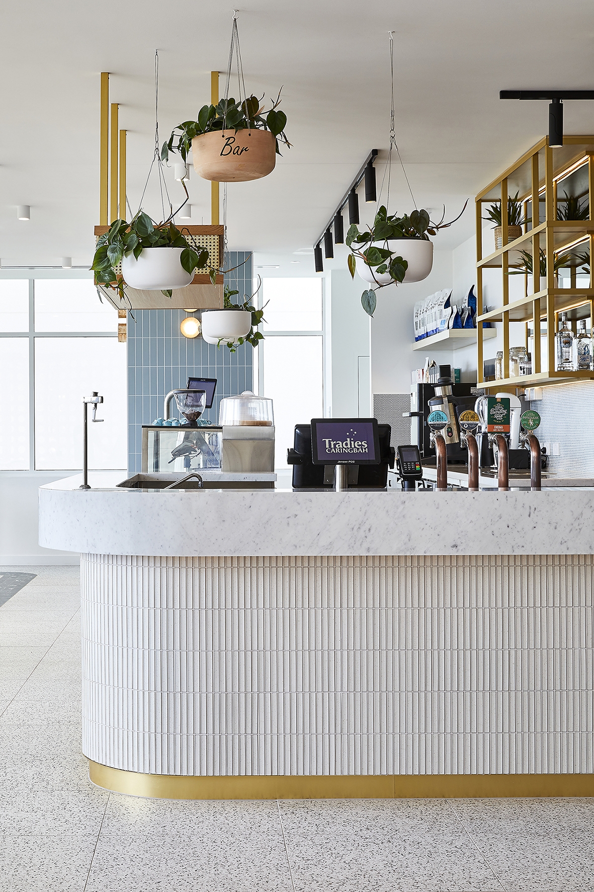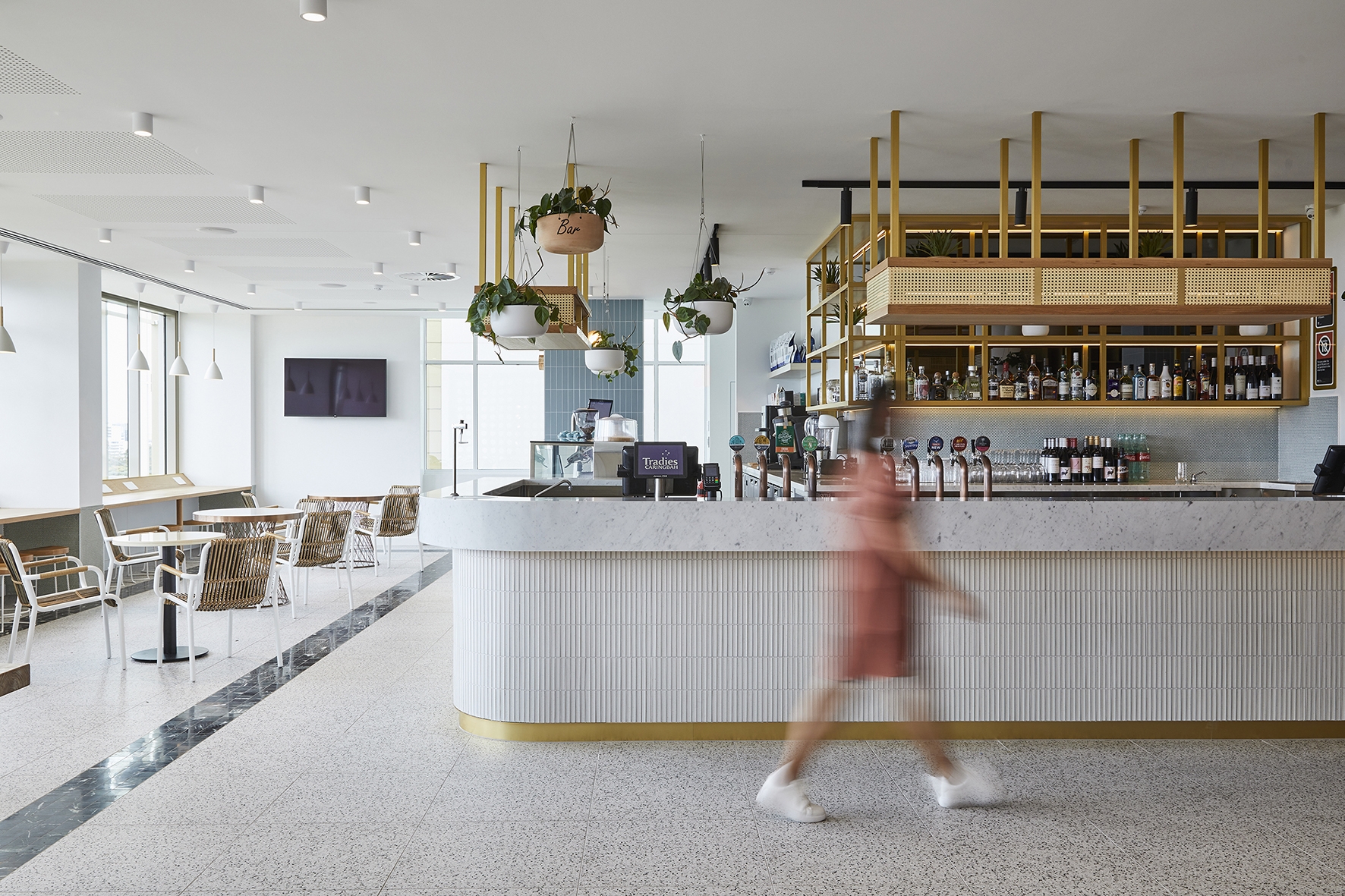 The interior design of Tradies Caringbah reflects its coastal location. The colours and finishes are lively, natural and fresh. The palette of materials, textured and tactile surfaces, combined with generous planting, creates spaces that are relaxed, elegant and provides a strong sense of wellness.