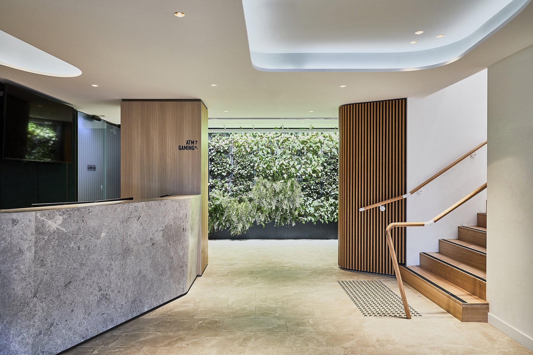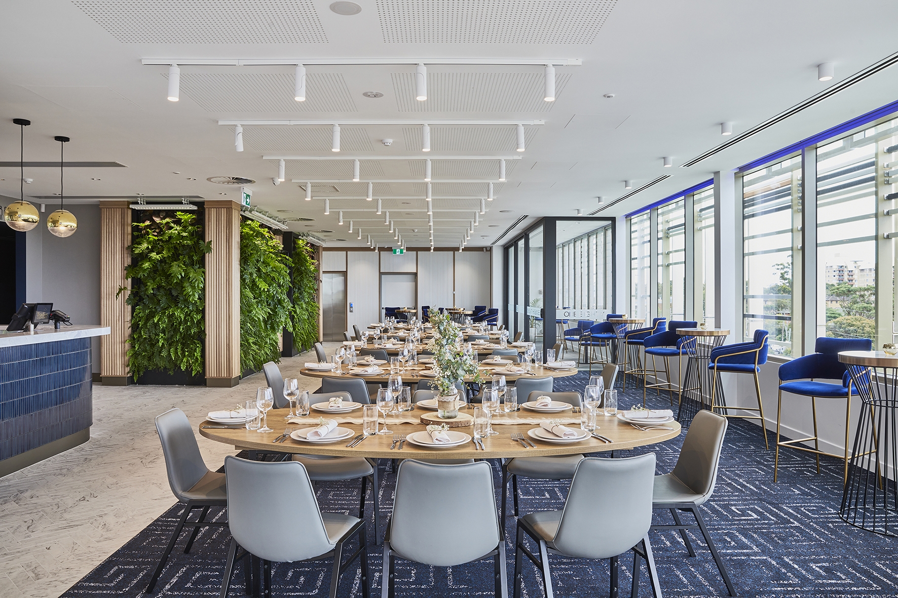The project features green walls at the entry, in the bistro through the double height void space of the stair, and wrapping three walls in the event space. These are complimented with an abundance of live plants, so guests can benefit from cleaner air, noise reduction, cooler ambient temperatures, and the calming effects of being close to nature. These plants actively filter out pollutants and humidify the air, reducing the reliance on air conditioning and excessive energy consumption.