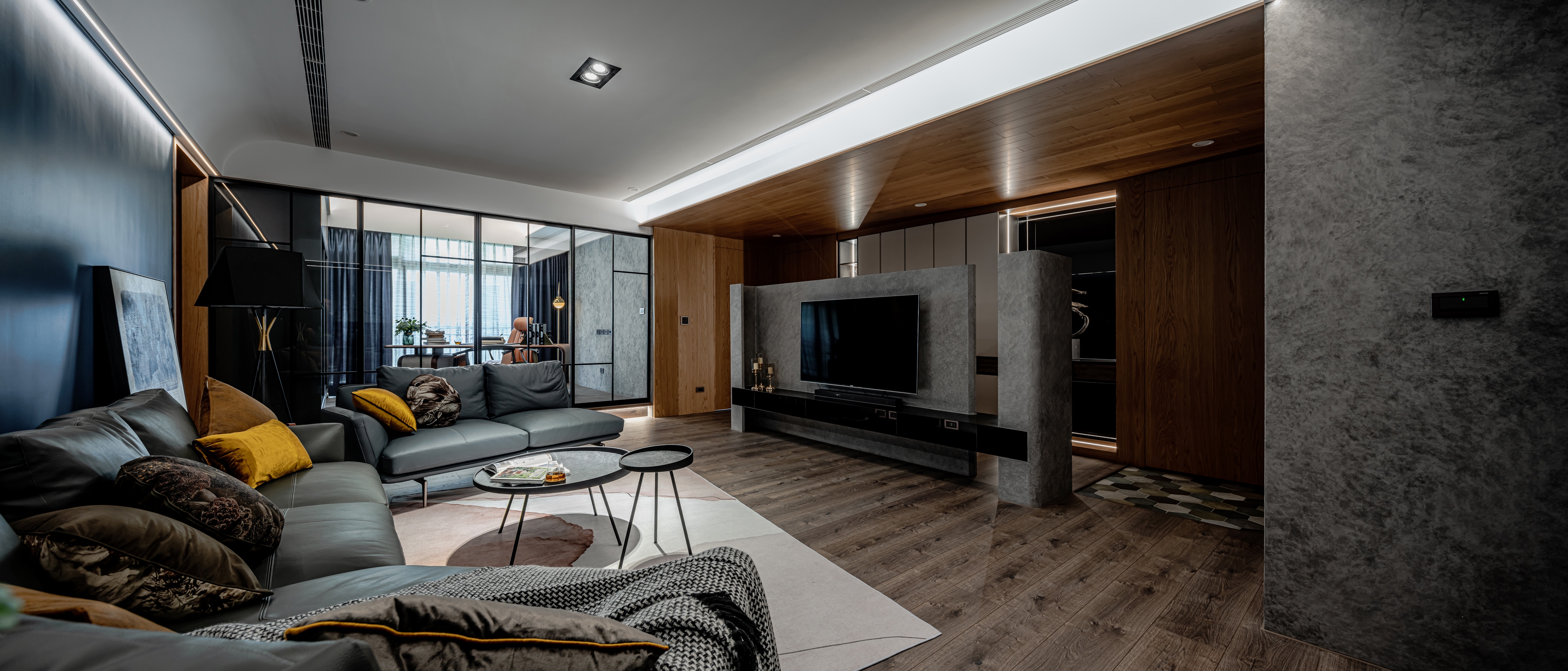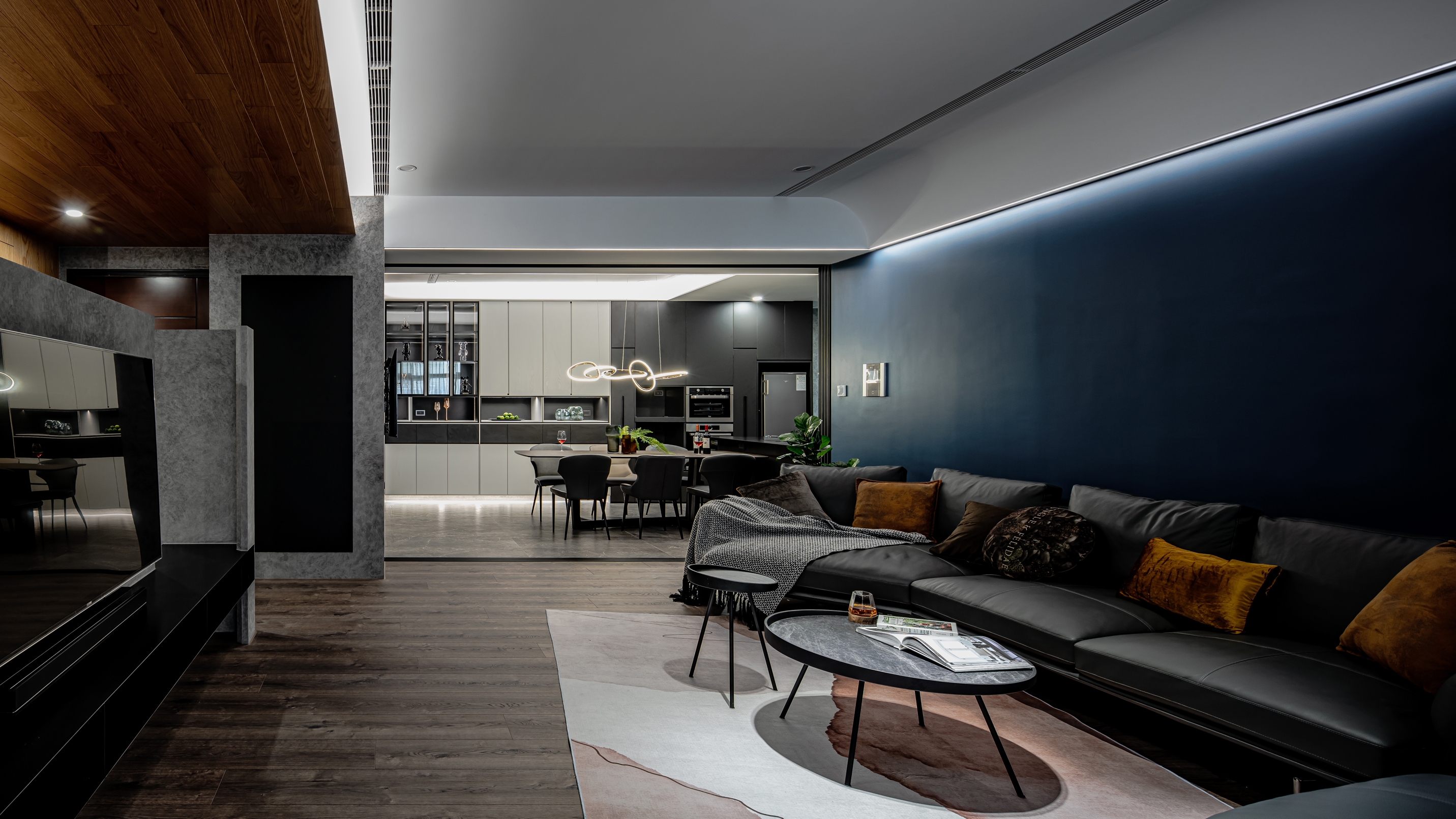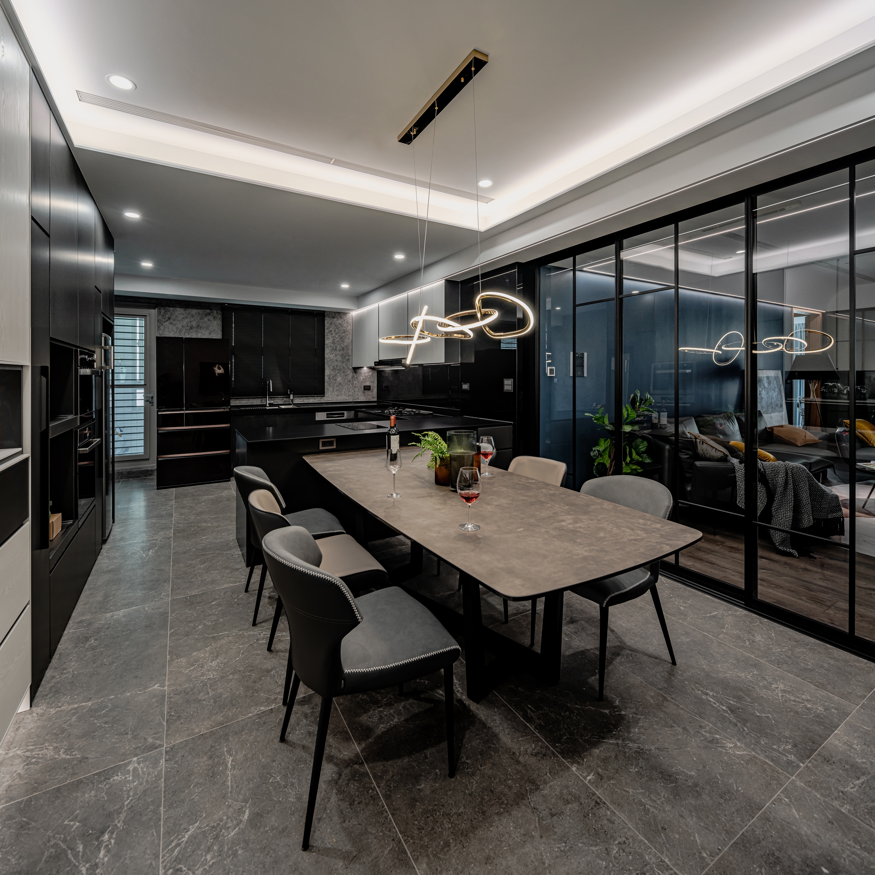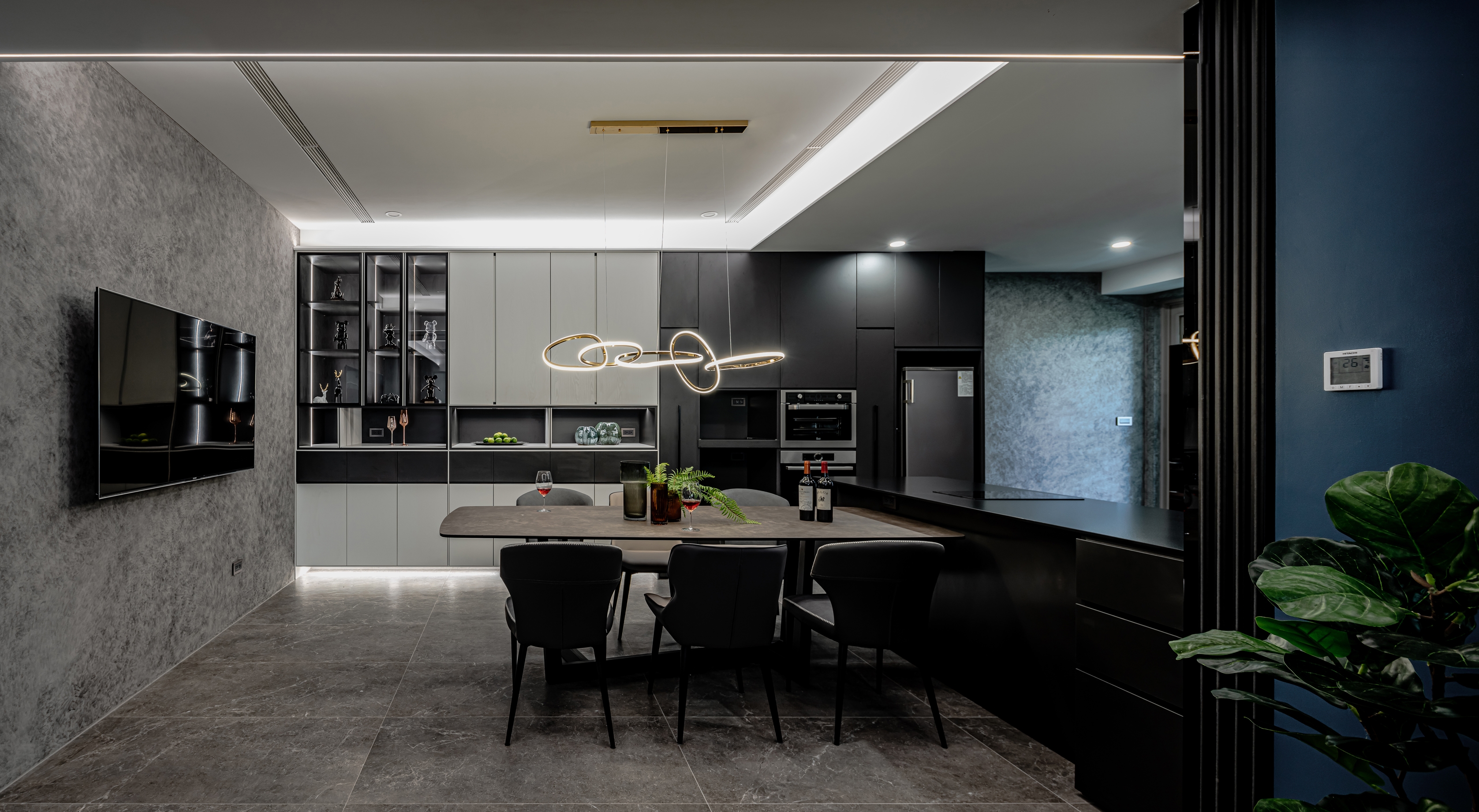 Home is a permanent haven for the family where unite the people as a whole. In this case, the designer uses the idea of concentric circles to interpret the spatial movement, aiming to link family boundary through the design, through the guidance of space, to increase more interaction and communication between family members. The design of concentric circles is used to link all the spaces, and the half-wall design and glass sliding doors are used to open up the vision of the space. The half-circle design on both sides of the TV wall symbolizes the embrace and care of the family. The living room with TV is placed in the center of the apartment to solve the problem of sunlight reflecting on the TV during the day, while leaving the natural light to the study by the window. The designer uses the living room as the center of the circle to connect the spaces and unite family members, making full use of natural lighting, penetrating materials, circular spatial movement, and height differences to create a circulating and highly interactive home space, allowing family members to converge in the living room, the center of the family, no matter where they come from.