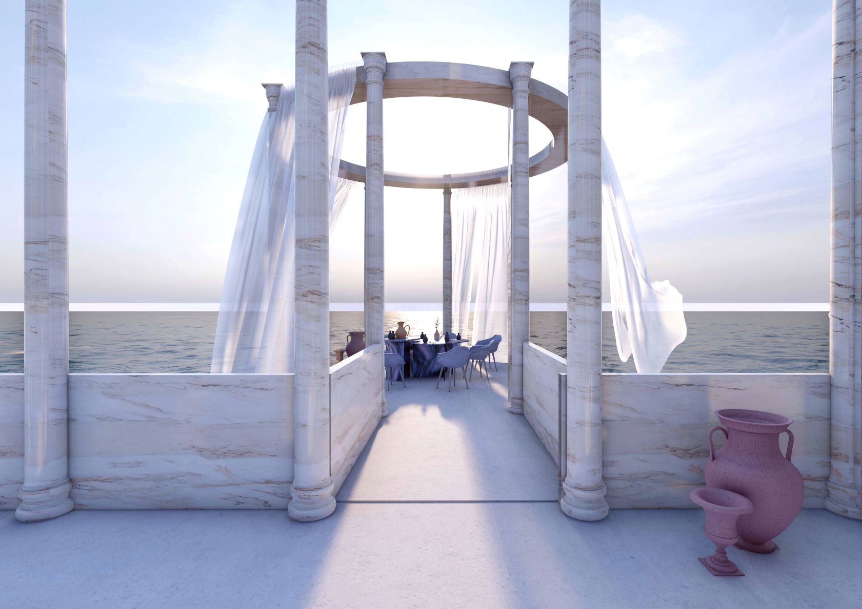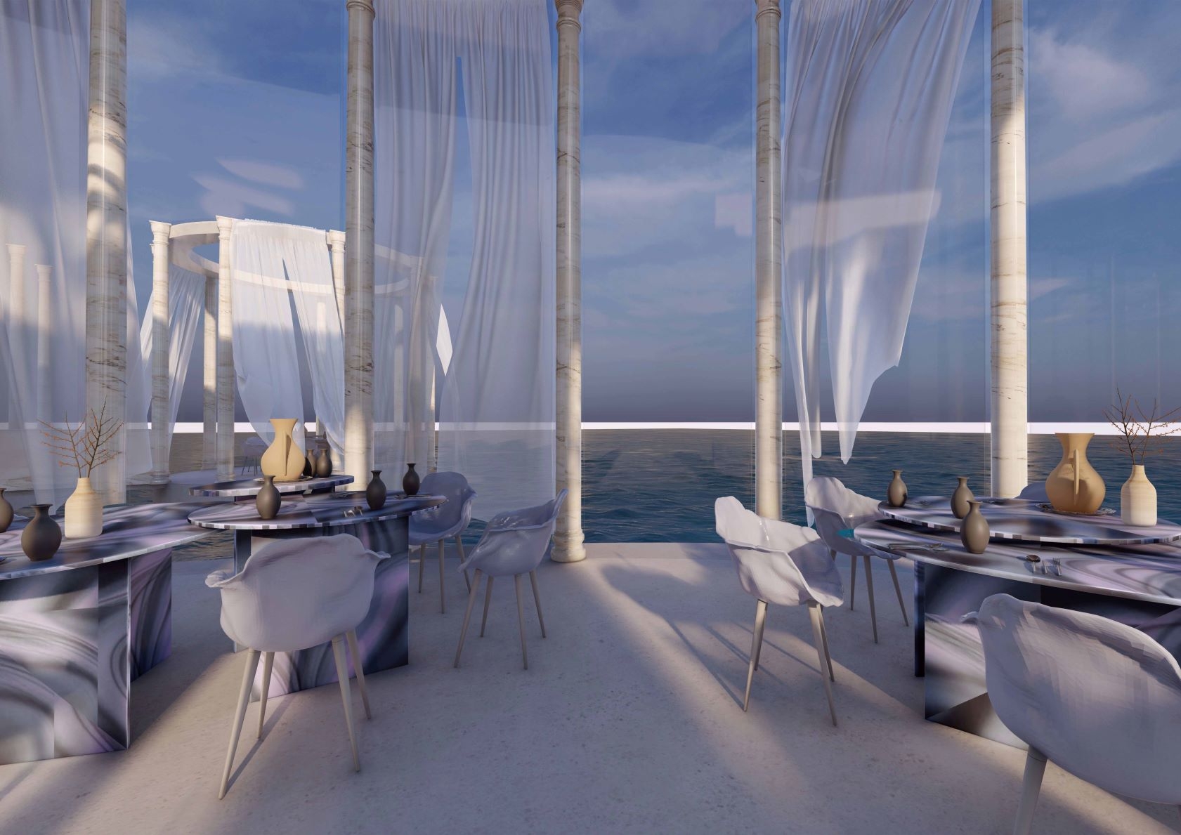 Inspired by the ancient Greek Hypostyle halls and courtyards, the space aims to translate a utopian and feel, the space is situated on the outskirts of Dubai and right on the sea.