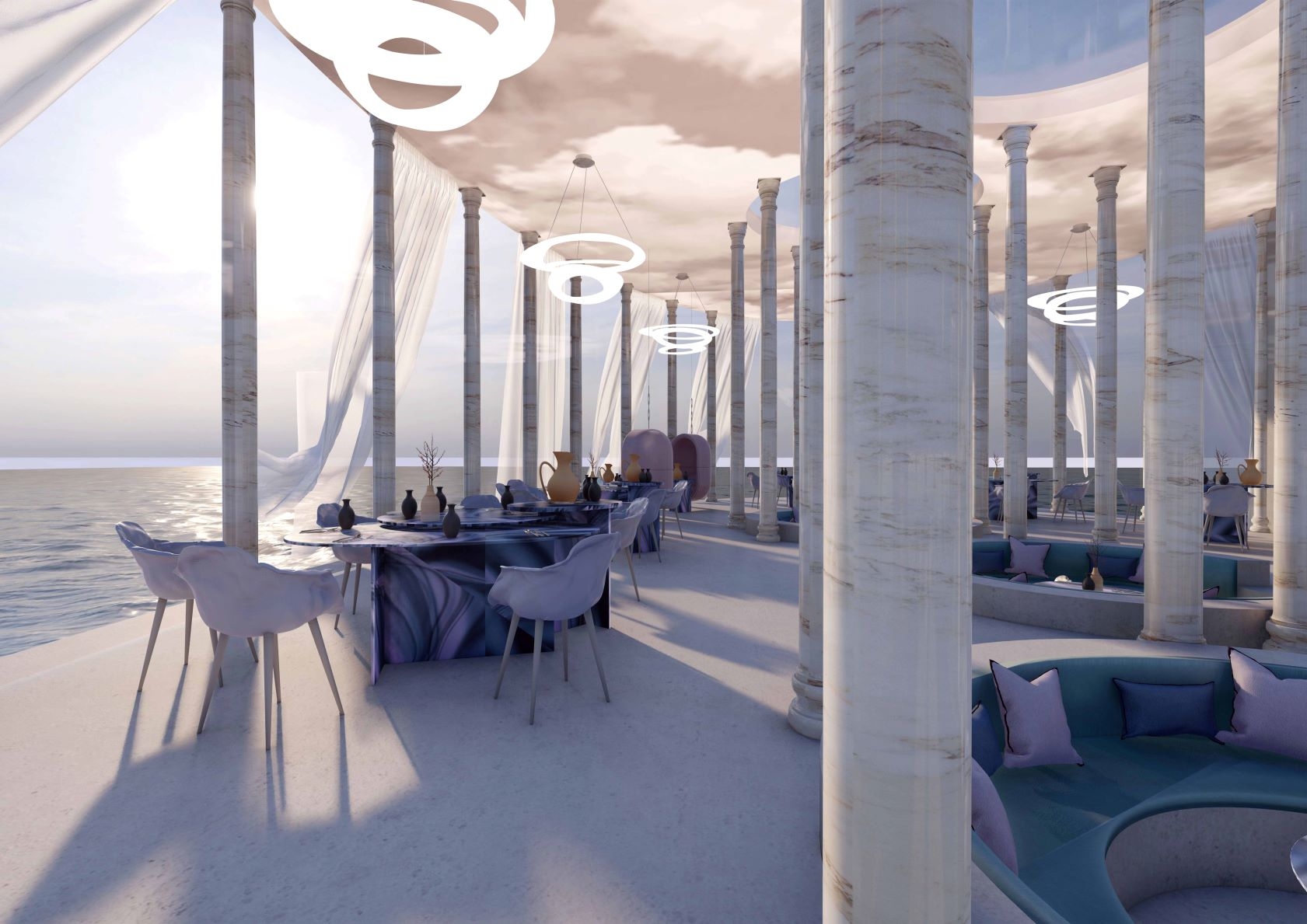The addition of the conversation pits that are a part of the floor slab gives the guests an illusion that they are sitting on the water. The translucent curtains, pastel color palette, and a fusion of Turkmen and Italian food give the space a unique identity.