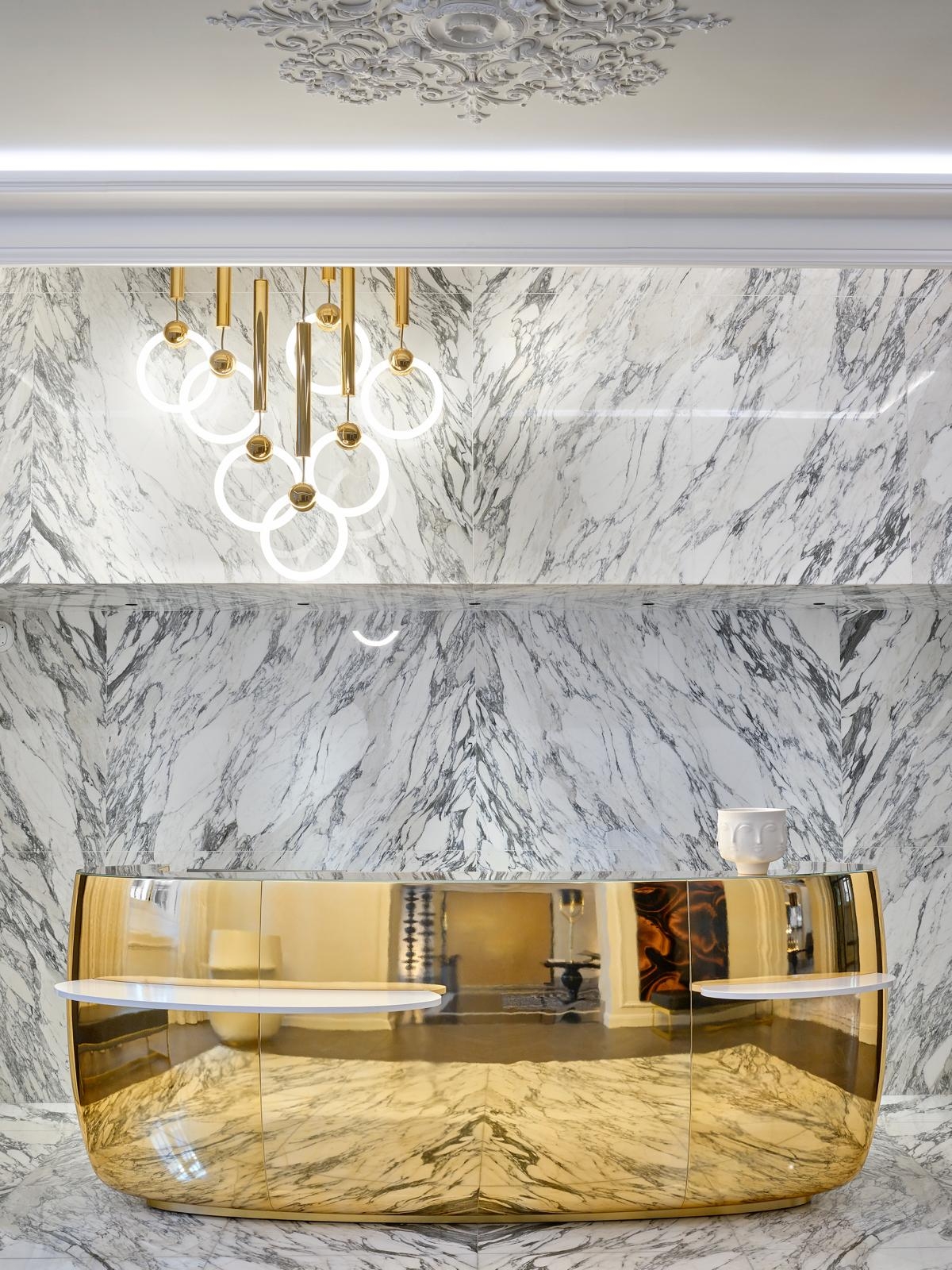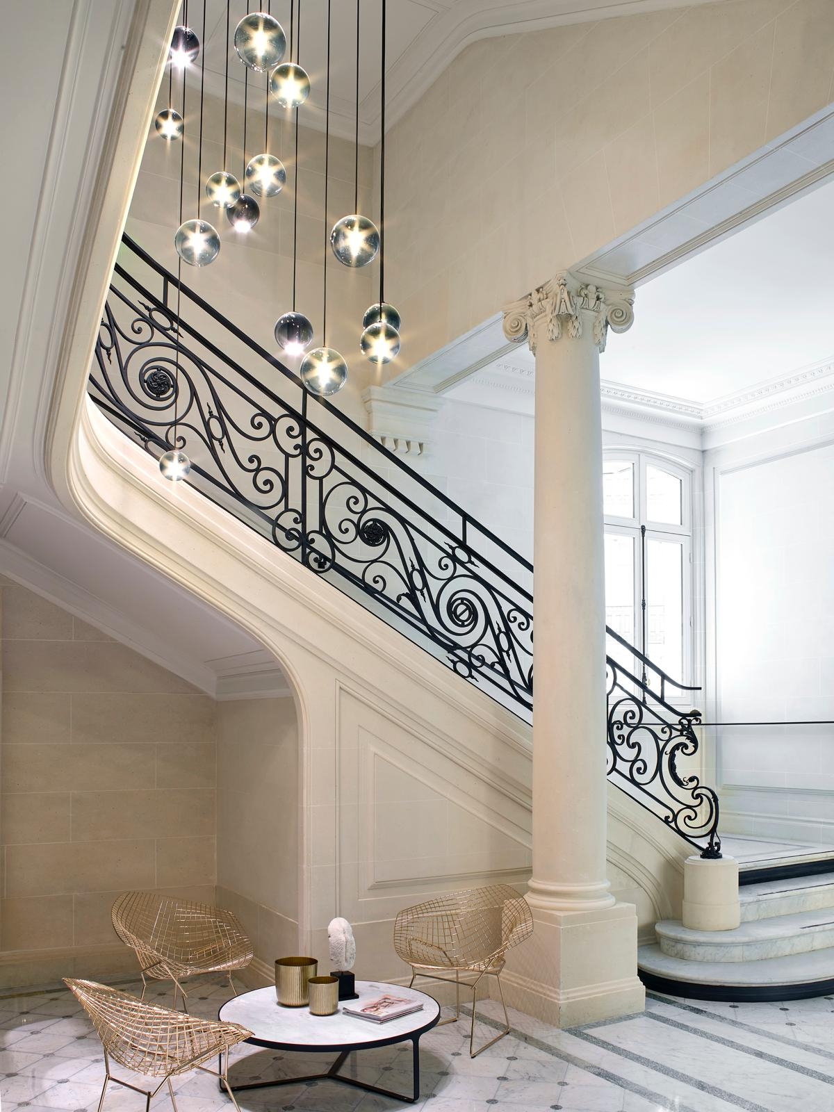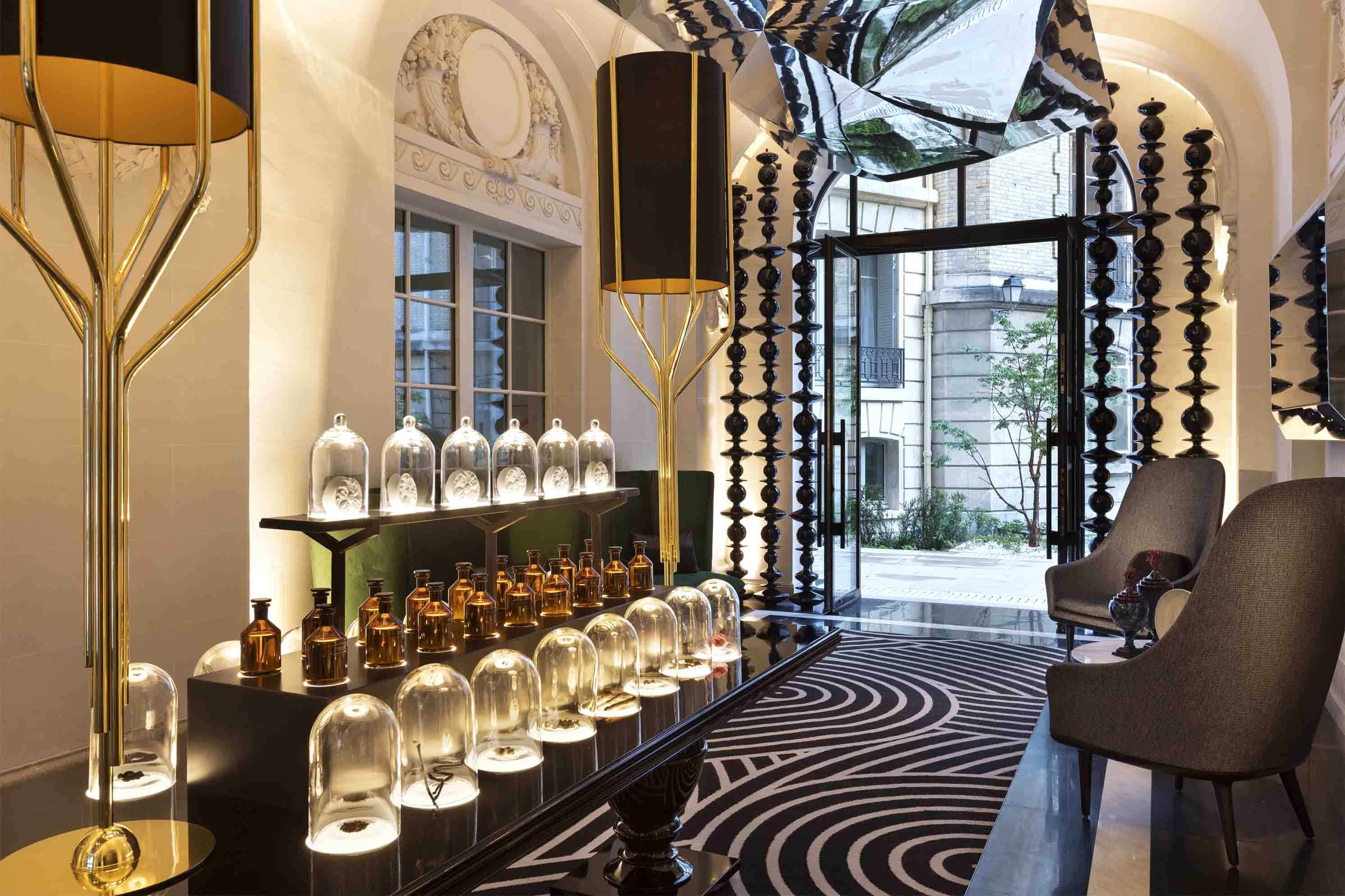 La Clef Champs-Élysées design theme envisions modern, luxurious amenities in a magnificent setting, as well as custom-tailored service. As soon as you step into the lobby, the spirit of the Champs-Élysées is in the air at the perfume bar, the ultimate in exquisite French savoir-faire. Capitalizing the property's classic Haussmannian-style building to full effect, the design calls for the dressing of the building’s original details in a modern palette of marble, polished brass and furnishings like the Lunar High back Chair by Stellar Works and pendant lights by Marzais Creations to include a touch of modernity.