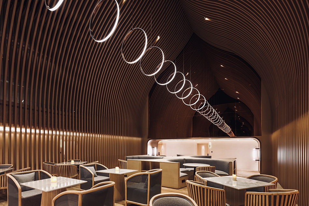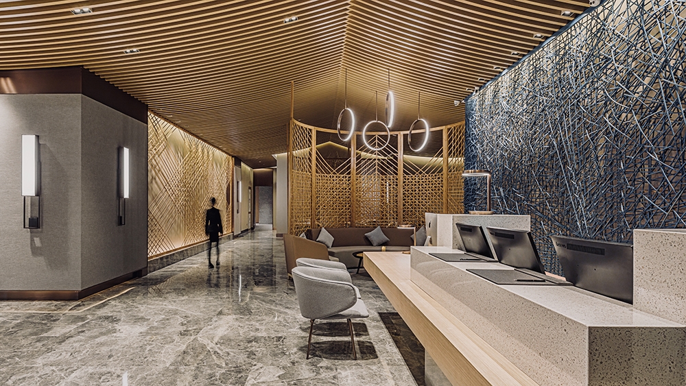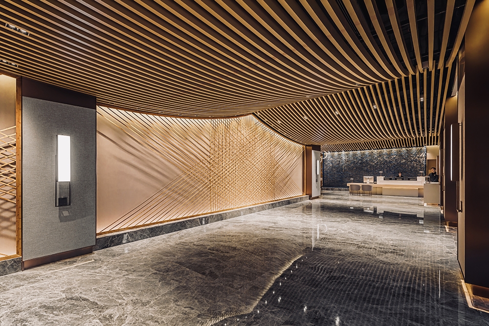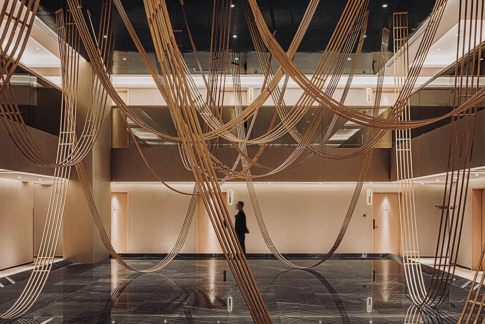 Double height central courtyards were introduced in every two guest-room floors. A reflective lake with bamboo installation of dancing curves that falls naturally, as if clouds are floating in the air. This ceiling hung structure was again in consultation with the master of the bamboo weaving on how to create the curves by making use of its natural elasticity and traditional connection method.