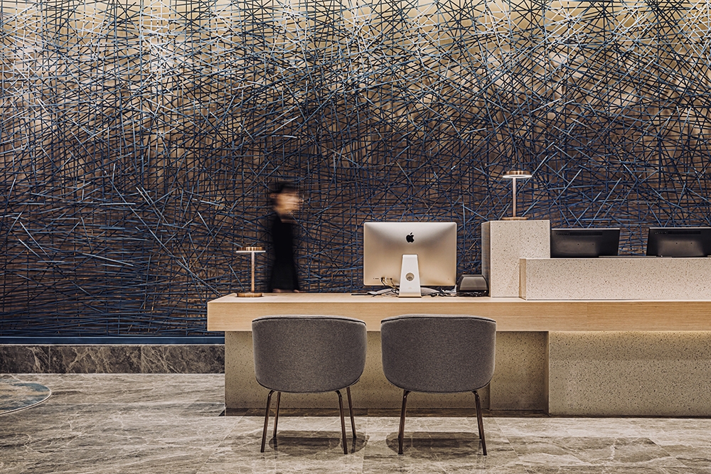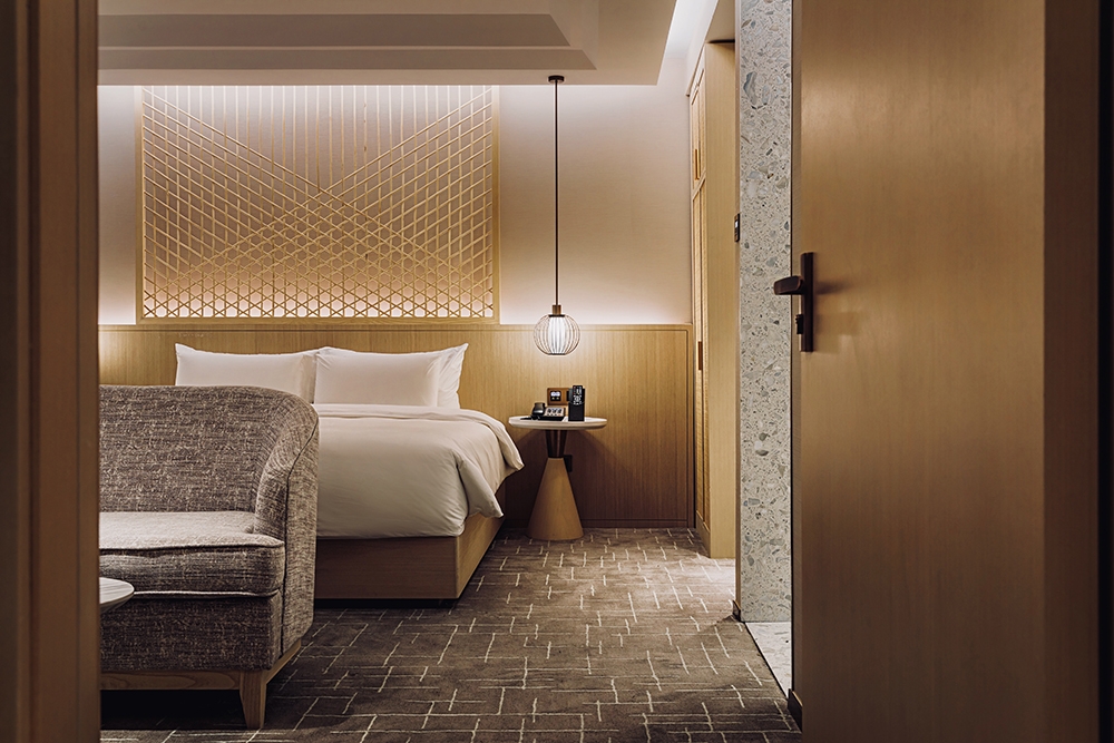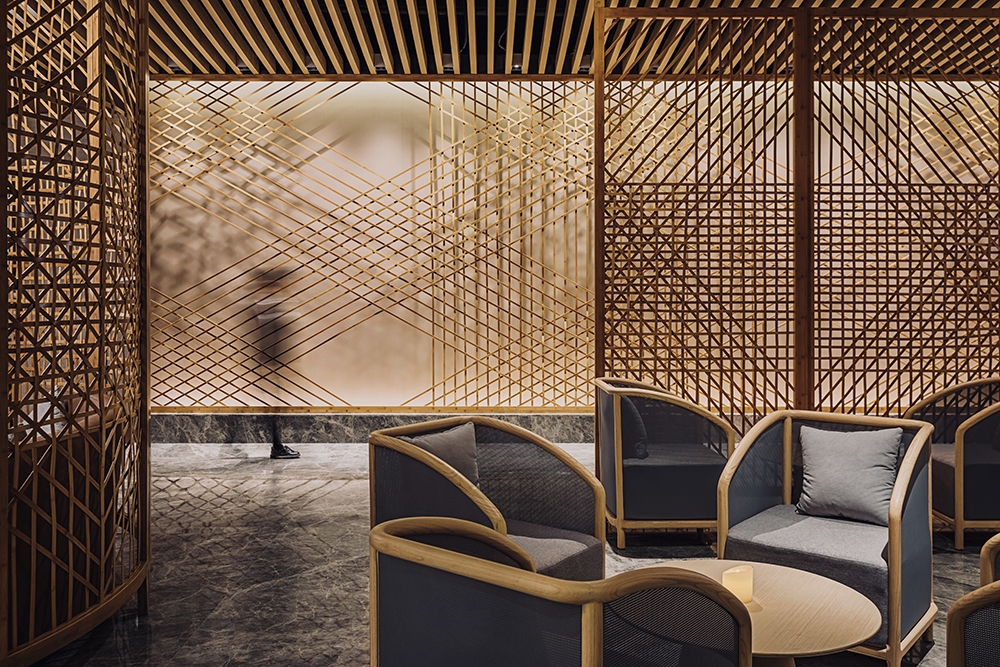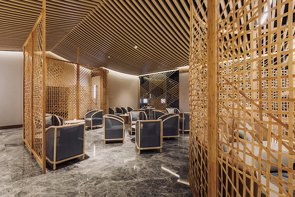 Starting from the lobby space, bamboo was selected as the key material to let customers enter the lobby space and greeted by sophisticated light and shadow effect on the main wall. Various on-site tests & experiments with traditional bamboo weaver were done to create full height screens to define reception and lobby lounge area. Pitched roof ceiling and natural diatom mud finished walls overlay by articulated light and shadow effects provide a minimal and leisure experience for the entire space.
