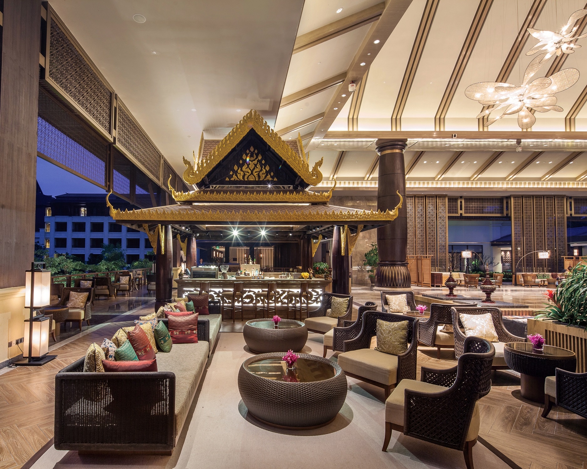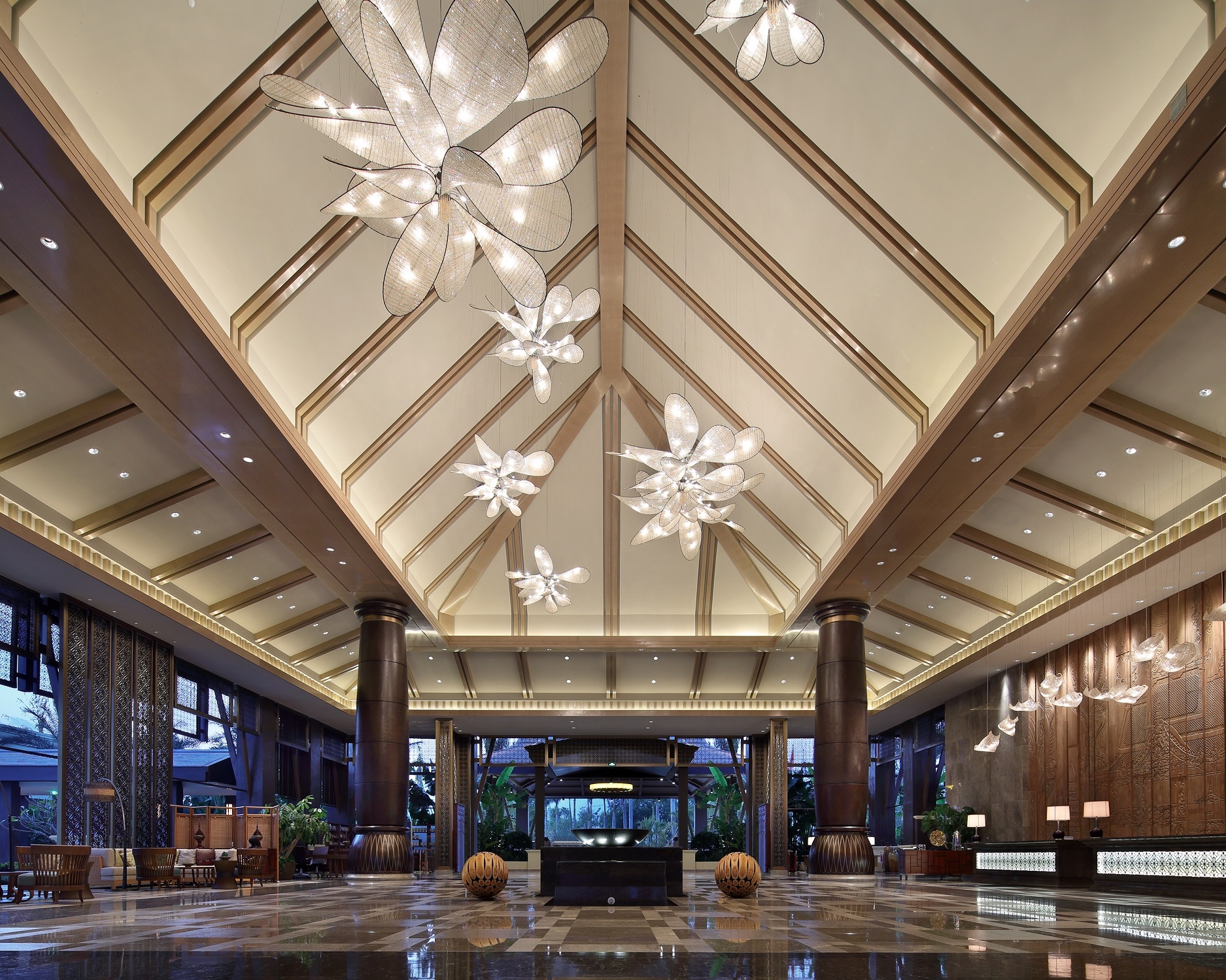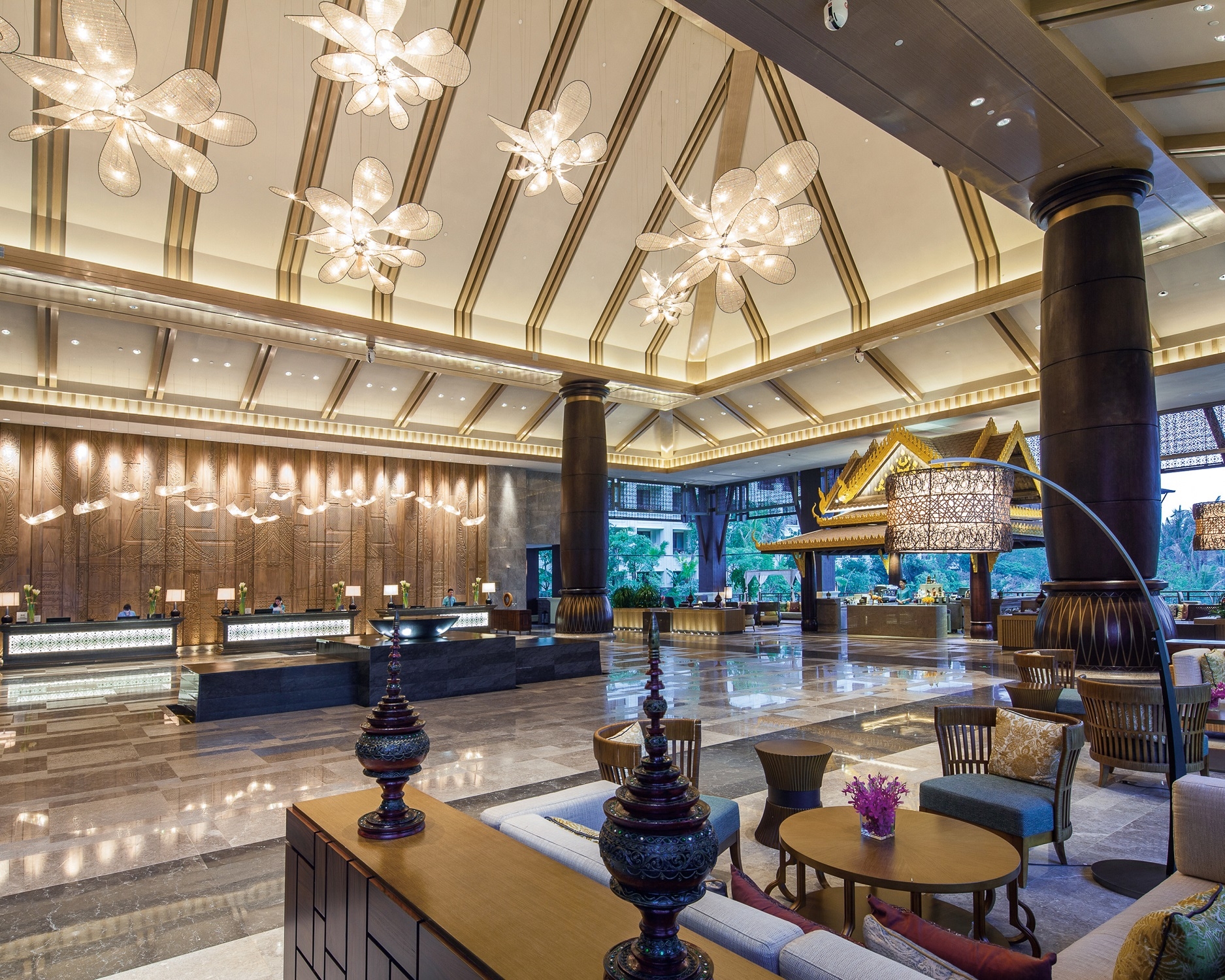 Gaining enlightenment from the Dai architecture, the space adopts a pitched roof combined with wooden beams. The beams and lamps in the lobby are properly decorated with the Dai elements of elephant-foot drum and Myanmar Osmanthus, which signify auspiciousness, peace and happiness; the lobby’s backdrop of handcrafted woodcarving wall and a coarse stone-textured floor represent the design concept of “delicate wildness” while simultaneously creating the resort's festive atmosphere and demonstrating the brand’s luxury.