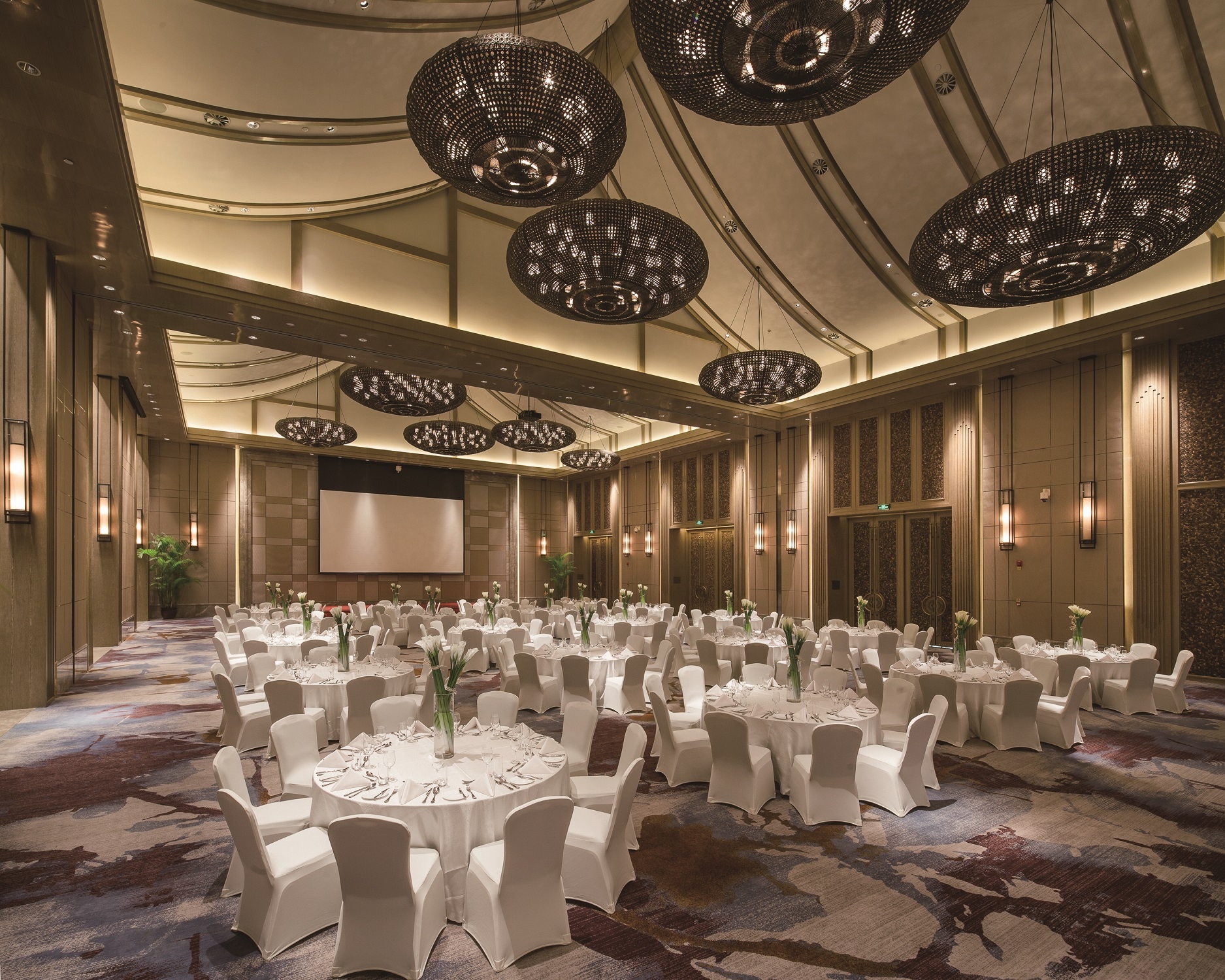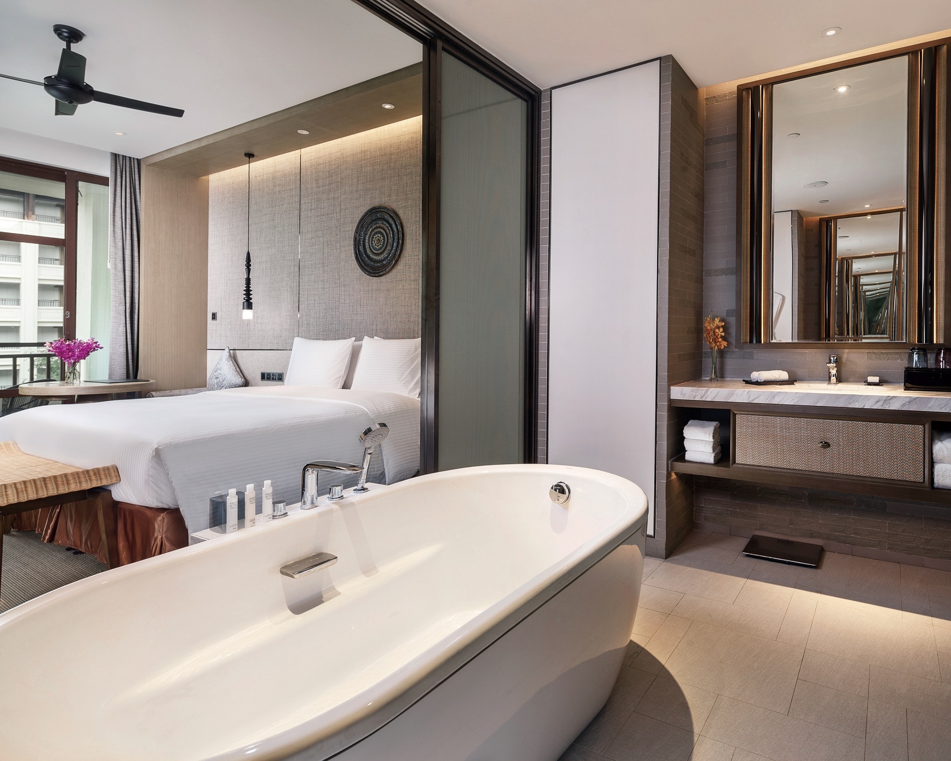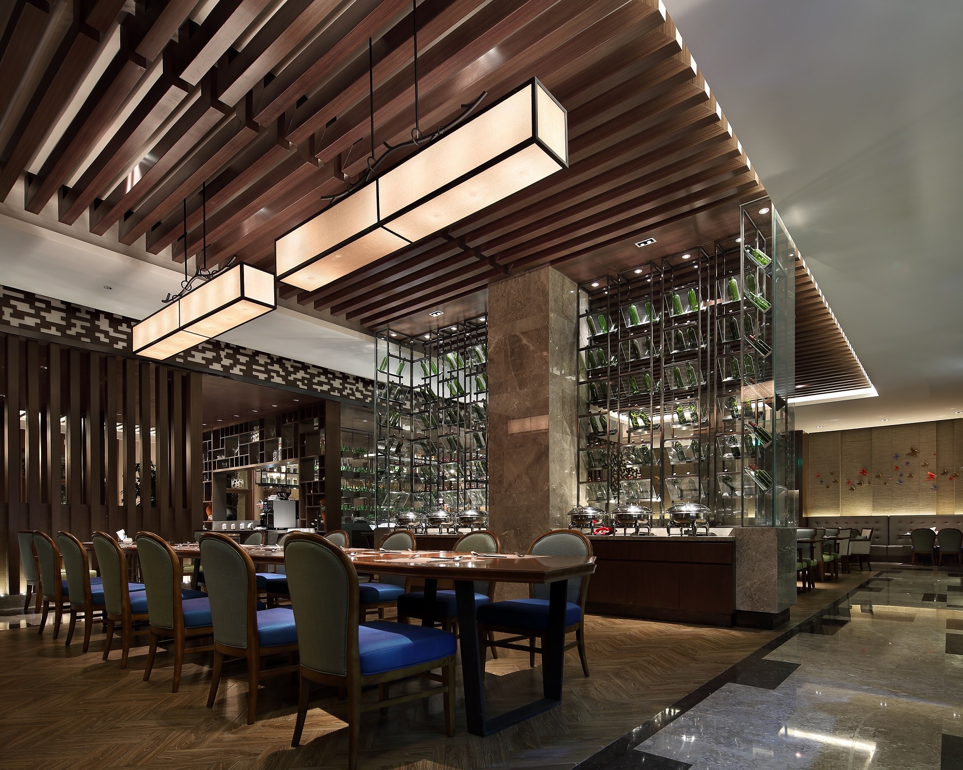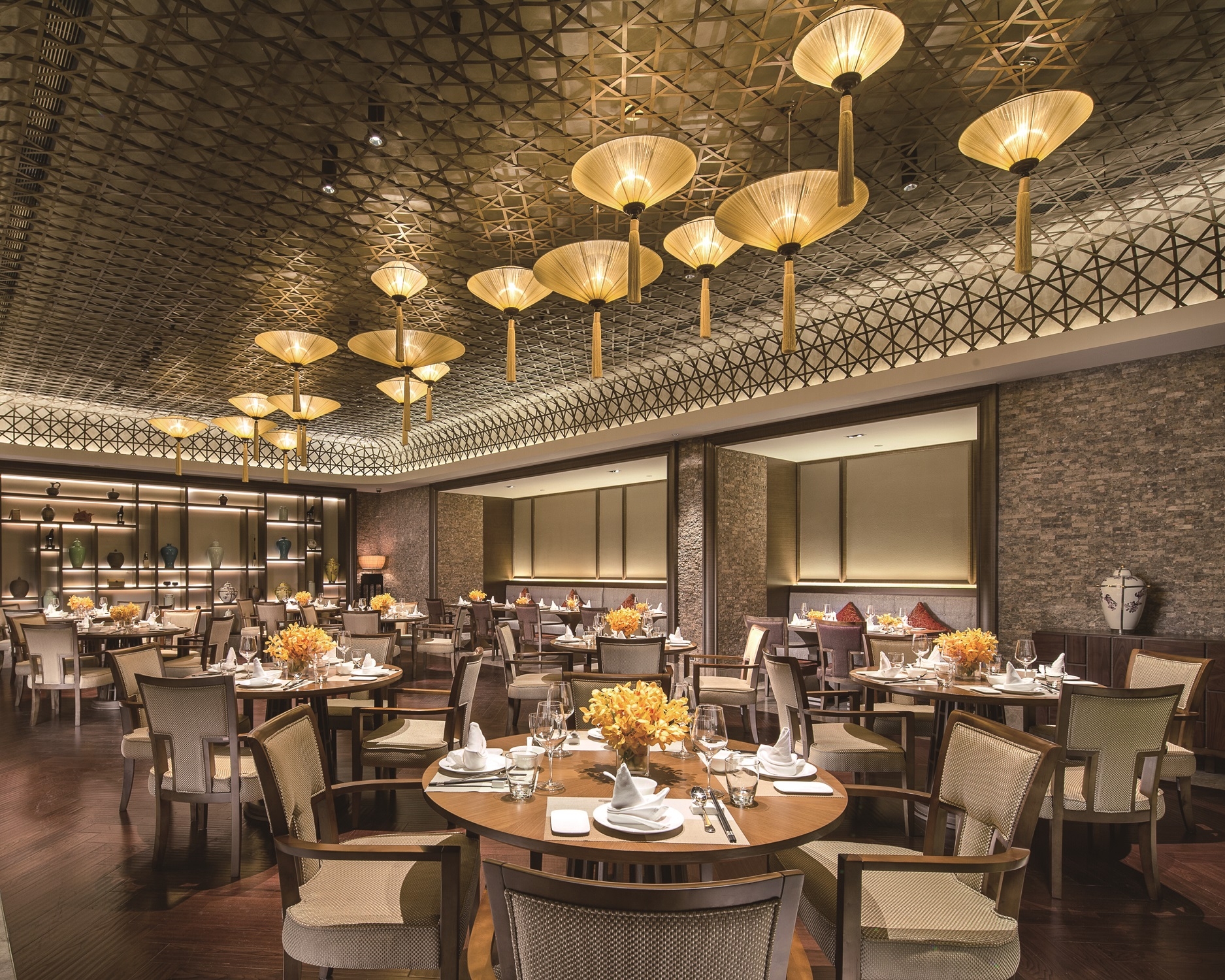 Gaining enlightenment from the Dai architecture, the space adopts a pitched roof combined with wooden beams. The beams and lamps in the lobby are properly decorated with the Dai elements of elephant-foot drum and Myanmar Osmanthus, which signify auspiciousness, peace and happiness; the lobby’s backdrop of handcrafted woodcarving wall and a coarse stone-textured floor represent the design concept of “delicate wildness” while simultaneously creating the resort's festive atmosphere and demonstrating the brand’s luxury.