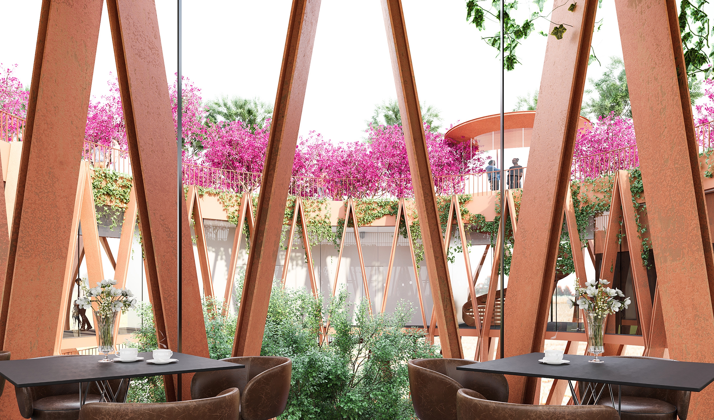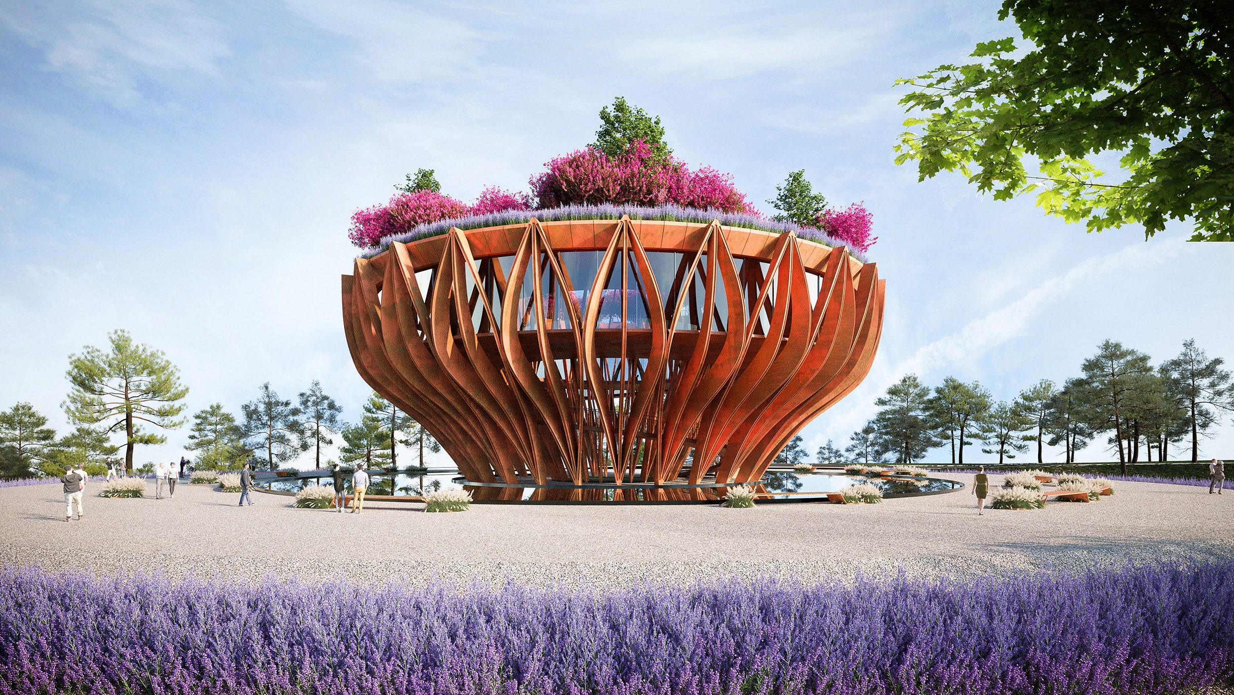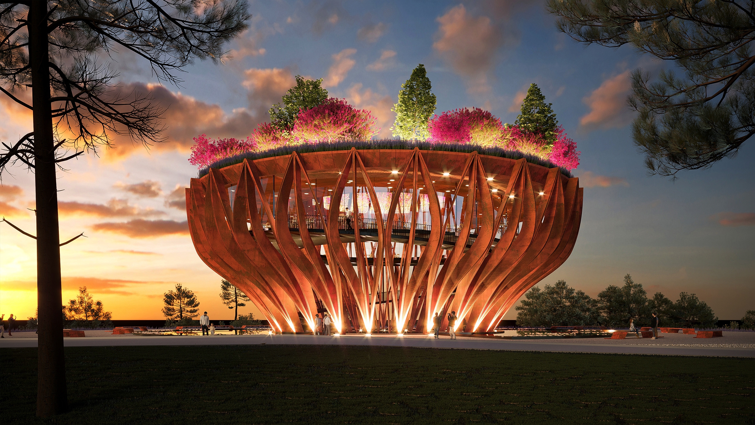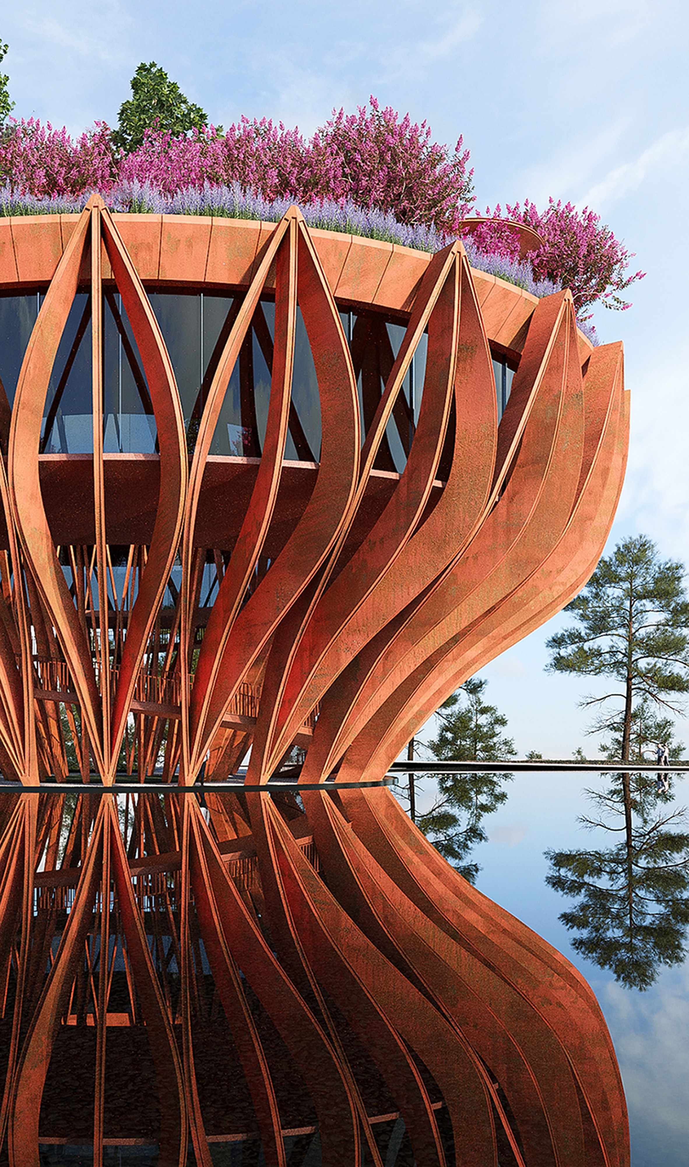The Tower Flower, an observation tower molded into the shape of a Lotus flower in the early stages of blooming, the symbol for pure beauty in Buddhism. Sings an ode to those rolling hills of Da Lat with terrace gardens and biophilic design principles. Designed to be a coffee boutique bar as part of a larger resort complex. The tower appears as a giant sculpture, structuring of 27 orange corten steel modules with 12m height, lifting the coffee space of 600m2 at an altitude of 8m comprising internal well hole. The entire roof area is designed as a garden to grow large confetti and large space for visitors to admire the surrounding landscape.
