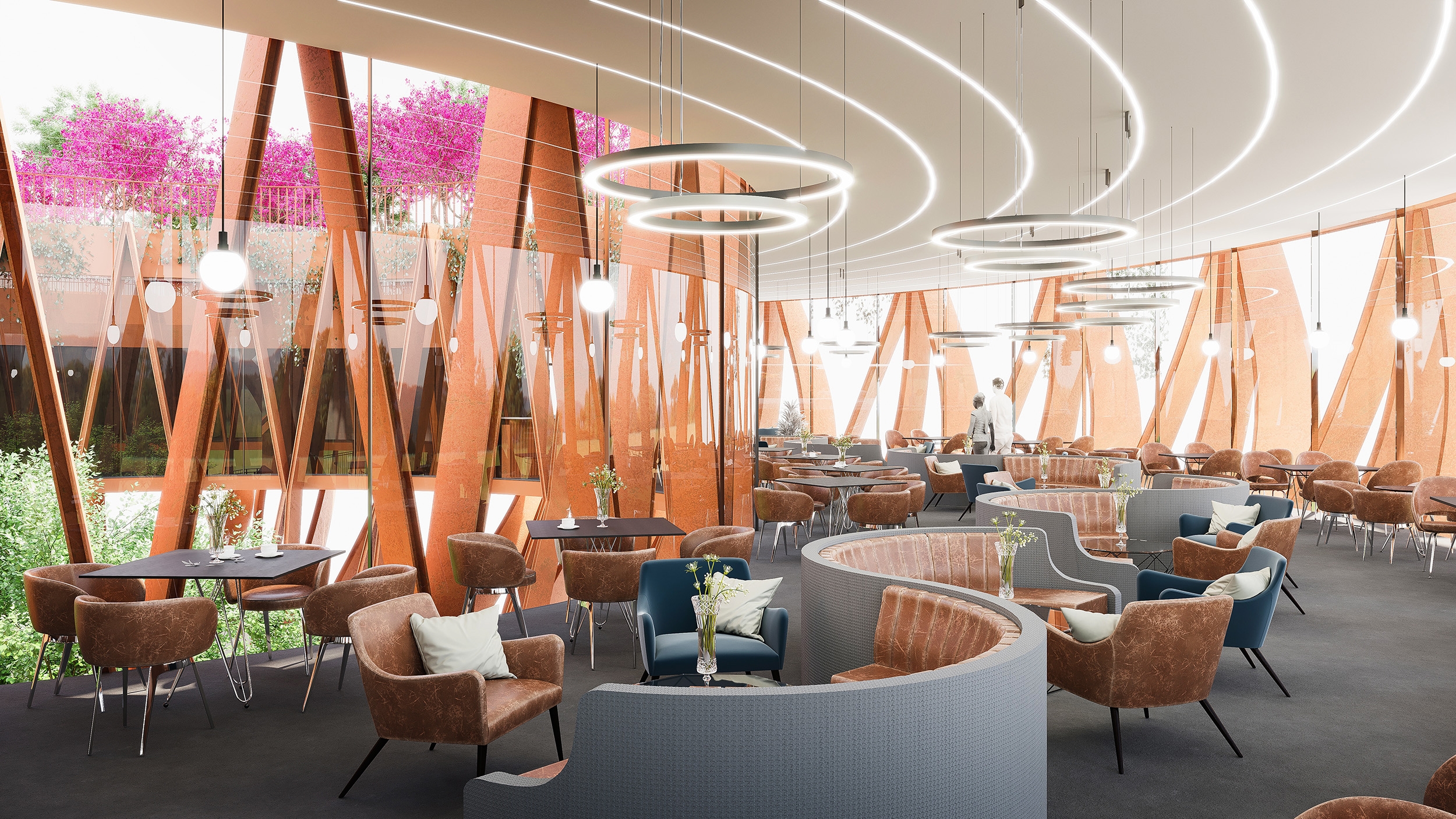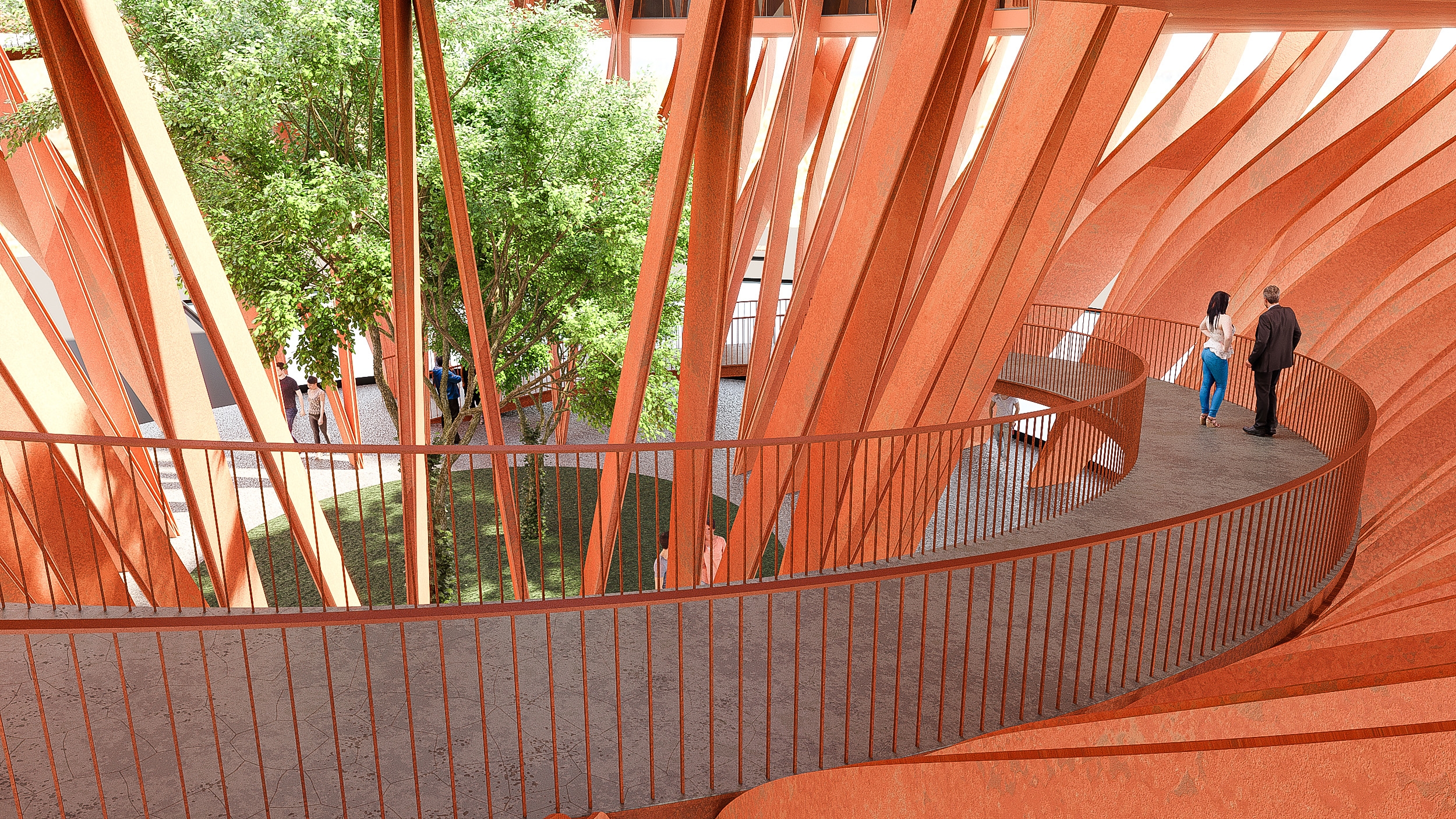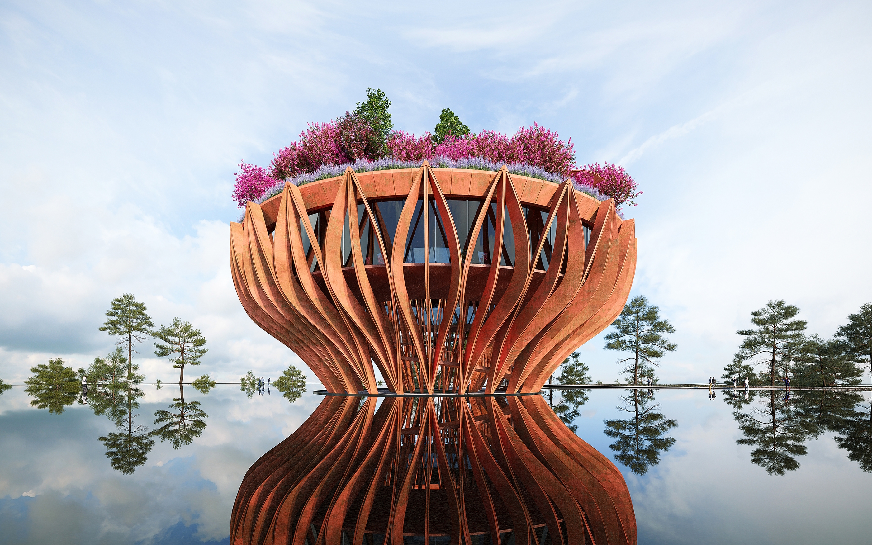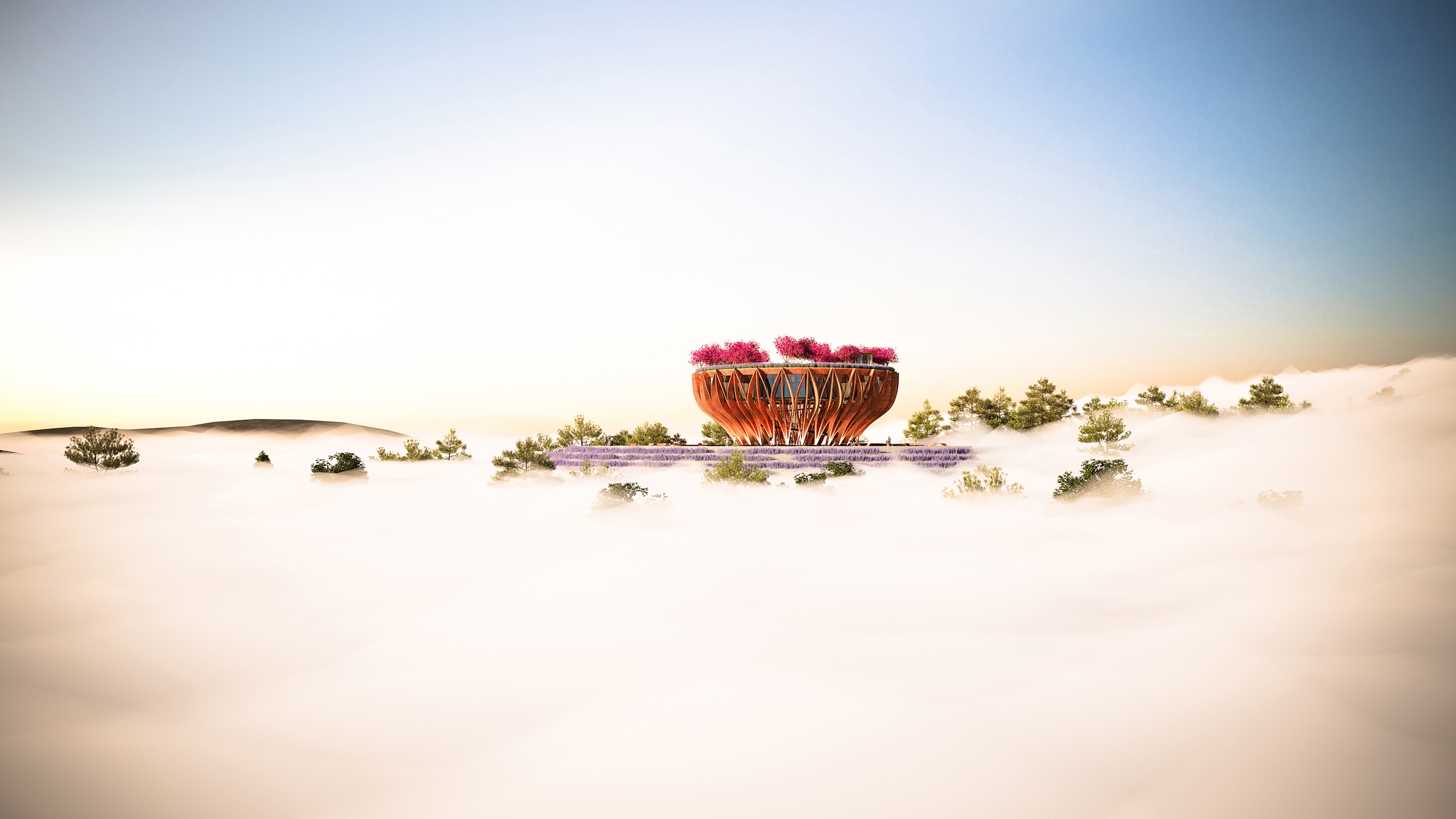 The Tower Flower, an observation tower molded into the shape of a Lotus flower in the early stages of blooming, the symbol for pure beauty in Buddhism. Sings an ode to those rolling hills of Da Lat with terrace gardens and biophilic design principles. Designed to be a coffee boutique bar as part of a larger resort complex. The tower appears as a giant sculpture, structuring of 27 orange corten steel modules with 12m height, lifting the coffee space of 600m2 at an altitude of 8m comprising internal well hole. The entire roof area is designed as a garden to grow large confetti and large space for visitors to admire the surrounding landscape.