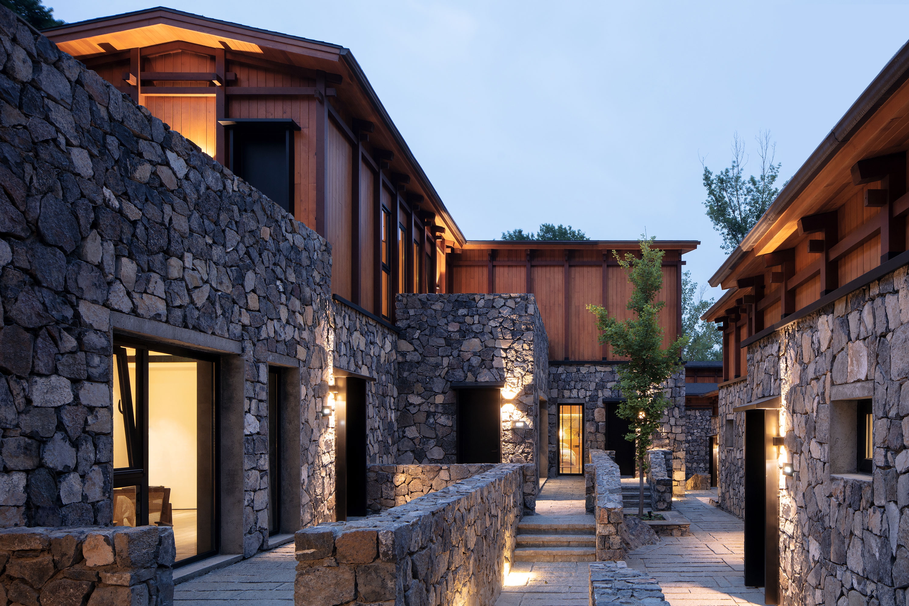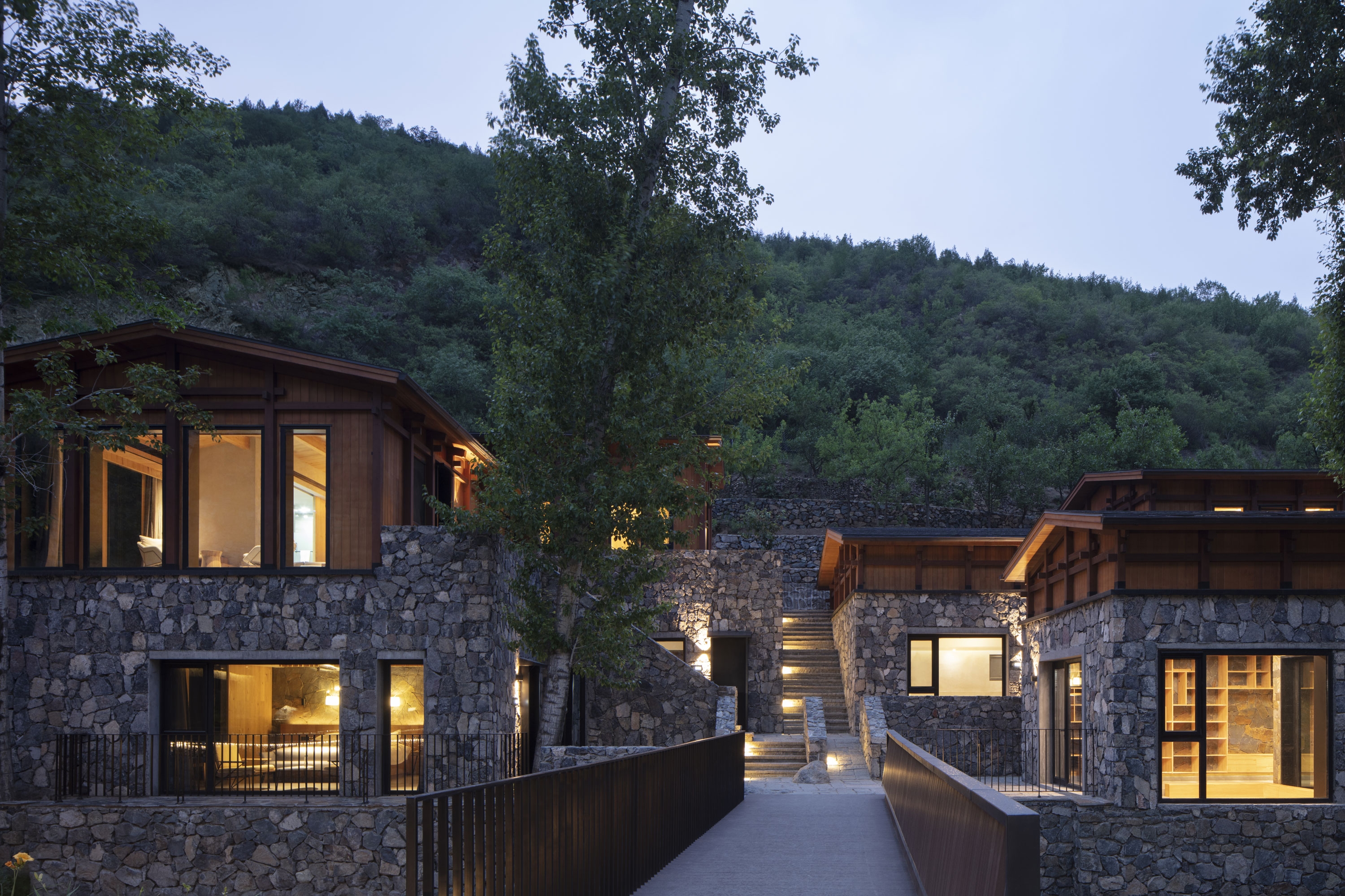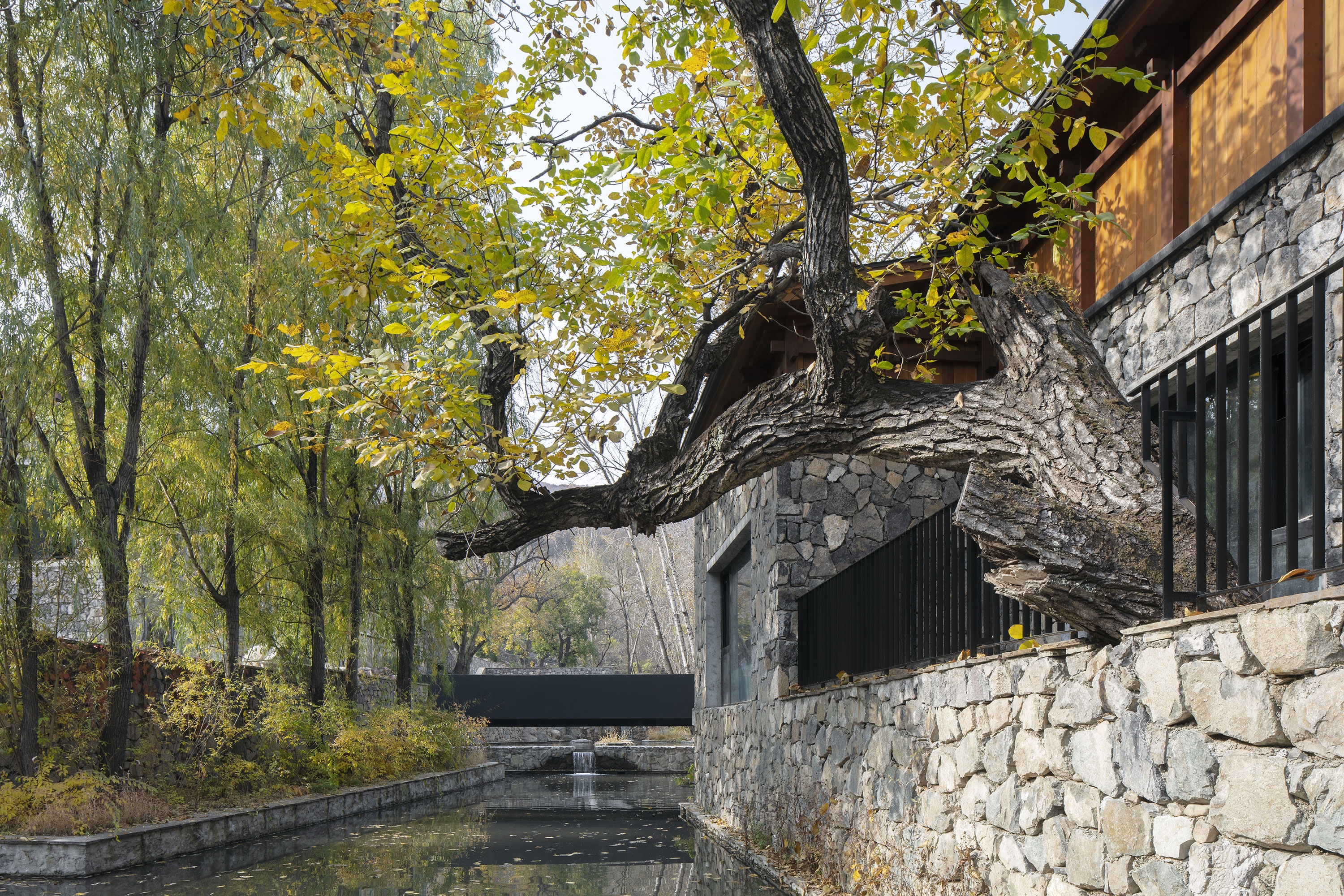 Located in West Dharma Village, Fangshan District, Beijing, Dharma Hotel is favorably sited amidst mountains and trees. The 1,700 m2 hotel is elaborately planned in staggered layout on a 800 m2 site, enjoying magnificent views. The project is replanned on the parcel of the original residential building as a two-floor waterfront homestay hotel. The hotel lobby and guestrooms, which are connected by bridge, face each other across the water, allowing guests to fully experience the attractive natural environment while stepping into the site. A total of 24 guestrooms are offered, including waterfront rooms and terraced rooms. The design maximizes the great views around the site and makes the building an integral part of the environment.