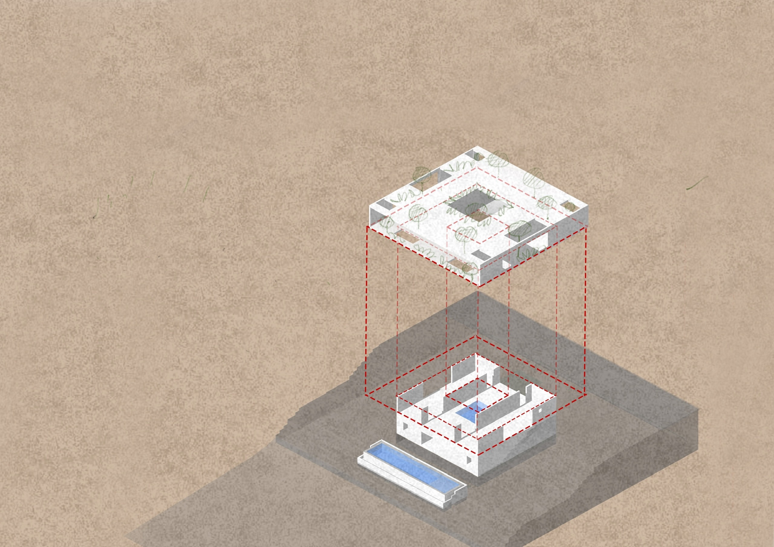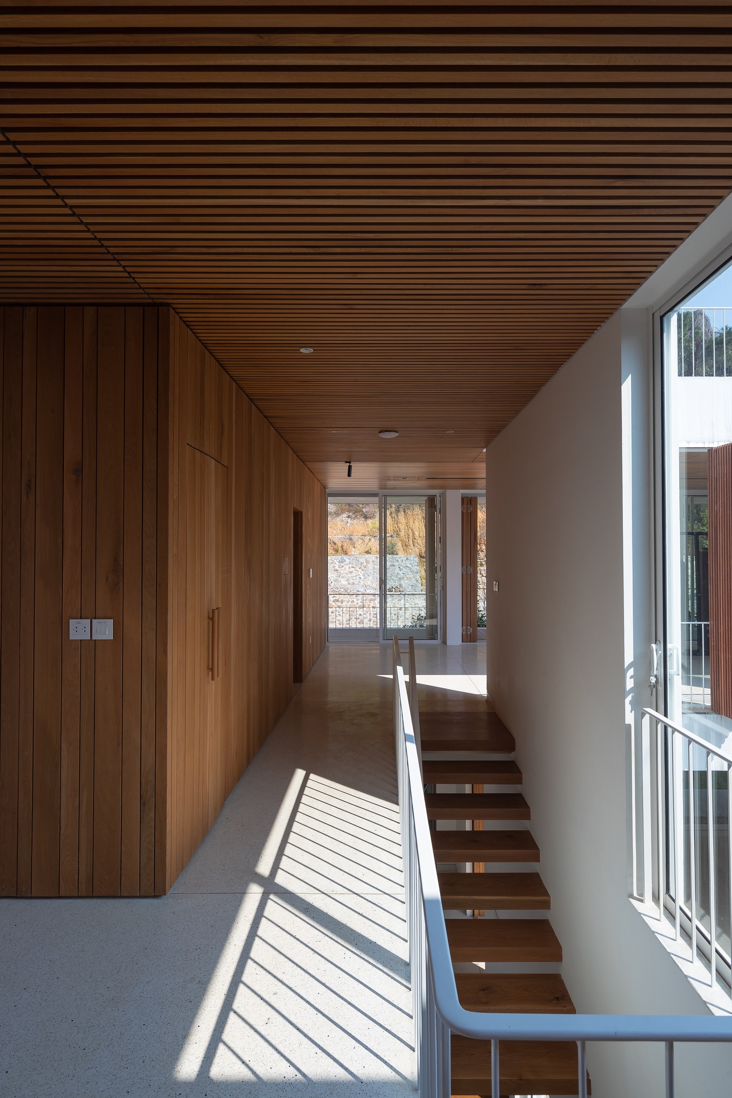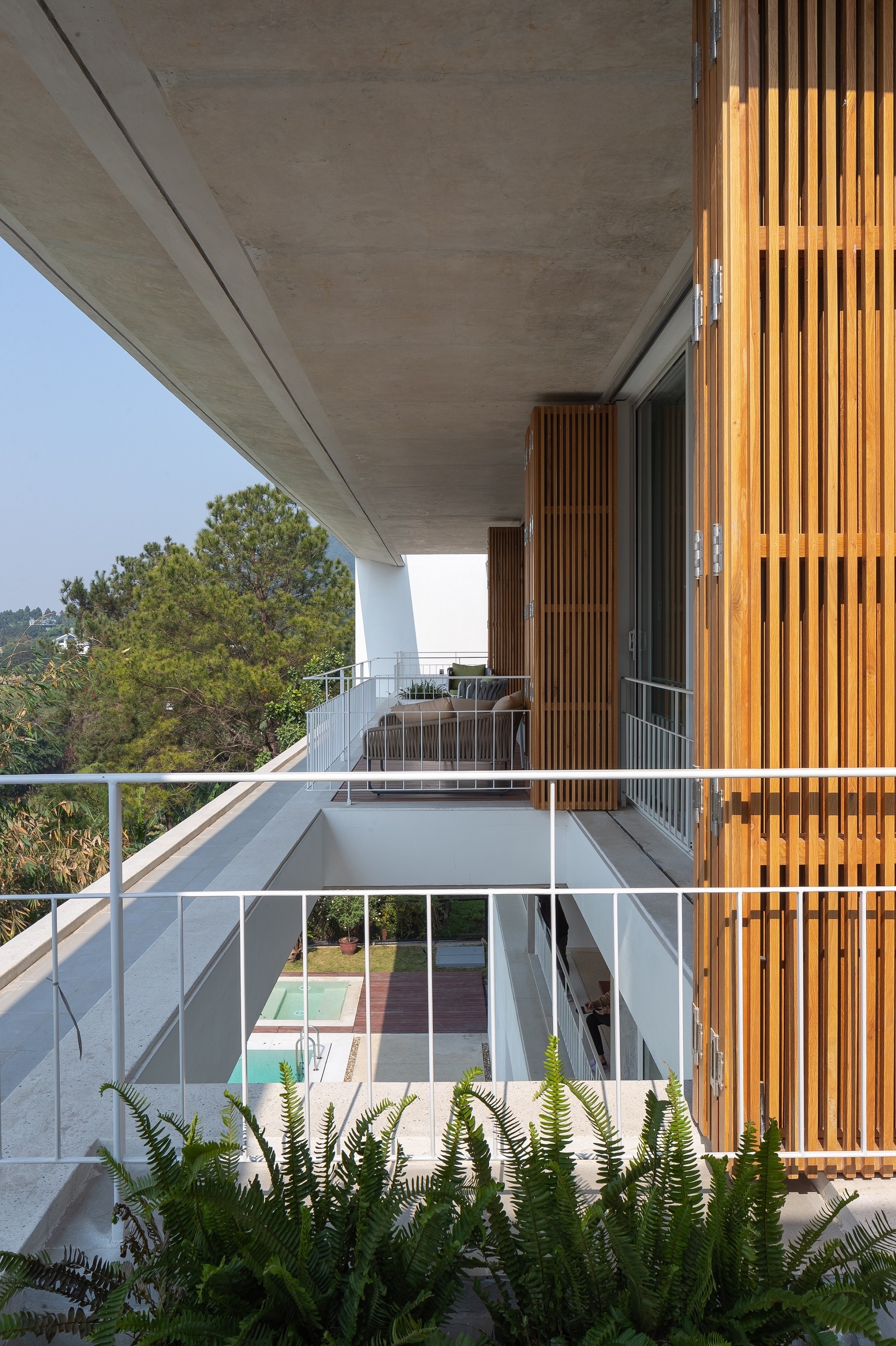 The house is designed with 3 stories, descending towards the valley. The house has a simple architectural shape with two square boxes placed on top of each other.